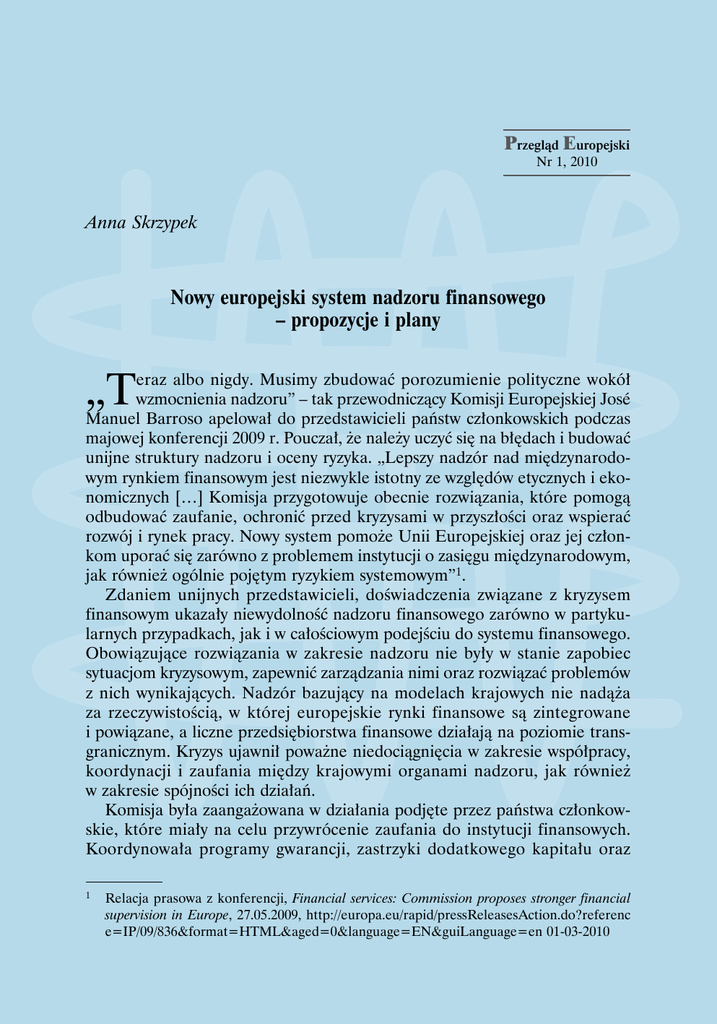 Przegląd Europejski Nr 1, 2010 Anna Skrzypek Nowy europejski system nadzoru finansowego – propozycje i plany „T eraz albo nigdy. Musimy zbudować porozumienie polityczne wokół wzmocnienia nadzoru” – tak przewodniczący Komisji Europejskiej José Manuel Barroso apelował do przedstawicieli państw członkowskich podczas majowej konferencji 2009 r. Pouczał, że należy uczyć się na błędach i budować unijne struktury nadzoru i oceny ryzyka. „Lepszy nadzór nad międzynarodowym rynkiem finansowym jest niezwykle istotny ze względów etycznych i ekonomicznych […] Komisja przygotowuje obecnie rozwiązania, które pomogą odbudować zaufanie, ochronić przed kryzysami w przyszłości oraz wspierać rozwój i rynek pracy. Nowy system pomoże Unii Europejskiej oraz jej członkom uporać się zarówno z problemem instytucji o zasięgu międzynarodowym, jak również ogólnie pojętym ryzykiem systemowym”1. Zdaniem unijnych przedstawicieli, doświadczenia związane z kryzysem finansowym ukazały niewydolność nadzoru finansowego zarówno w partykularnych przypadkach, jak i w całościowym podejściu do systemu finansowego. Obowiązujące rozwiązania w zakresie nadzoru nie były w stanie zapobiec sytuacjom kryzysowym, zapewnić zarządzania nimi oraz rozwiązać problemów z nich wynikających. Nadzór bazujący na modelach krajowych nie nadąża za rzeczywistością, w której europejskie rynki finansowe są zintegrowane i powiązane, a liczne przedsiębiorstwa finansowe działają na poziomie transgranicznym. Kryzys ujawnił poważne niedociągnięcia w zakresie współpracy, koordynacji i zaufania między krajowymi organami nadzoru, jak również w zakresie spójności ich działań. Komisja była zaangażowana w działania podjęte przez państwa członkowskie, które miały na celu przywrócenie zaufania do instytucji finansowych. Koordynowała programy gwarancji, zastrzyki dodatkowego kapitału oraz 1 Relacja prasowa z konferencji, Financial services: Commission proposes stronger financial supervision in Europe, 27.05.2009, http://europa.eu/rapid/pressReleasesAction.do?referenc e=IP/09/836&format=HTML&aged=0&language=EN&guiLanguage=en 01-03-2010 98 Anna Skrzypek środki mające na celu oczyszczenie bilansów z aktywów o obniżonej jakości, dopilnowując jednocześnie, by instytucje będące beneficjentami tych interwencji podjęły niezbędne kroki do tego, by powrócić do dobrej kondycji finansowej. Działania, mające na celu naprawienie ujawnionych przez kryzys braków w zakresie nadzoru powinny być dopełnieniem podjętych przez KE wysiłków. Ponadto Unia Europejska, jako jeden z dwóch największych rynków finansowych na świecie, odpowiada także za propagowanie stabilności i bezpieczeństwa finansowego na poziomie ogólnoświatowym. Wywiązanie się z tego zadania będzie możliwe tylko wówczas, gdy sama Unia będzie mieć stabilne ramy nadzorcze i regulacyjne2. W konsekwencji tych założeń przewodniczący Barroso powołał w listopadzie 2008 r. Grupę Wysokiego Szczebla ds. nadzoru finansowego w UE, złożoną z ekspertów pod przewodnictwem Jacques’a de Larosière’a, której zadaniem było wypracowanie rozwiązań, które wzmocnią europejski system nadzoru, aby był on bardziej sprawny, skuteczny, zintegrowany i trwały oraz lepiej chronił interesy obywateli. 25 lutego 2009 r. grupa de Larosière’a opublikowała raport końcowy, wyznaczający główne kierunki reformy3. Oprócz wizji stworzenia nowego zrównoważonego europejskiego systemu nadzoru, w raporcie – po raz pierwszy – pojawił się pomysł powołania nadrzędnego podmiotu na szczeblu europejskim, który nadzorowałby zagrożenia, na jakie narażony jest system finansowy jako całość. Dodatkowo zaproponowano przekształcenie komitetów trzeciego poziomu w Europejskie Organy Nadzorcze, posiadające kompetencje do podejmowania działań wiążących krajowe organy nadzoru. Na podstawie rekomendacji zawartych w raporcie KE przedstawiła propozycję nowej europejskiej architektury nadzorczej w komunikacie „Realizacja europejskiego planu naprawy”4 na wiosennym szczycie Rady Europejskiej w marcu 2009 r. W maju 2009 r. KE opublikowała komunikat, przedstawiający główne założenia reformy nadzoru finansowego w UE, co było przełomowym krokiem na drodze do utworzenia europejskich agencji nadzorczych. Po kilku miesiącach konsultacji z przedstawicielami krajowych organów nadzorczych, Komisja Europejska przyjęła 23 września 2009 r. ważny pakiet projektów aktów prawnych. Przewodniczący Komisji José Manuel Barroso tak oto skomentował dążenia Komisji do szybkiej reformy architektury nadzorczej w Unii Europejskiej: „Rynki finansowe są rynkami europejskimi i światowymi, a nie wyłącznie krajowymi. Ich nadzór musi być również nadzorem europejskim i światowym. W dniu dzisiejszym proponujemy nowy europejski system nadzoru stworzony na podstawie raportu de Larosiere’a przy politycznym wsparciu państw człon2 3 4 Komunikat Komisji z 27 maja 2009 r., KOM(2009) 252 wersja ostateczna, s. 2. Zob. raport grupy wysokiego szczebla ds. nadzoru finansowego w UE opublikowany 25 lutego 2009 r. Komunikat Komisji z 4 marca 2009 r. na wiosenny szczyt Rady Europejskiej, „Realizacja europejskiego planu naprawy”, KOM(2009) 114. NOWY EUROPEJSKI SYSTEM NADZORU FINANSOWEGO – PROPOZYCJE I PLANY 99 kowskich. Naszym celem jest ochrona europejskich podatników przed powtórzeniem się mrocznych czasów z jesieni 2008 r., kiedy to rządy musiały zasilić banki miliardami euro. System europejski może również wpłynąć na system światowy”.5 Propozycja KE obejmuje pięć aktów prawnych, składających się na całościową reformę instytucjonalnego nadzoru finansowego w Unii Europejskiej: – trzy rozporządzenia6 ustanawiające Europejskie Agencje Nadzorcze, – rozporządzenie7 o ustanowieniu Europejskiej Rady Ryzyka Systemowego, – decyzja8 w sprawie powierzenia Europejsk