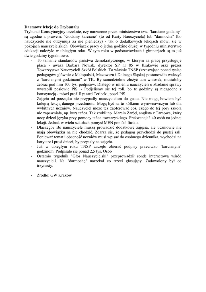 Darmowe lekcje do Trybunału Trybunał Konstytucyjny orzeknie, czy narzucone przez ministerstwo tzw. "karciane godziny" są zgodne z prawem. "Godziny karciane" (to od Karty Nauczyciela) lub "darmocha" (bo nauczyciele nie otrzymują za nie pieniędzy) - tak o dodatkowych lekcjach mówi się w pokojach nauczycielskich. Obowiązek pracy o jedną godzinę dłużej w tygodniu ministerstwo edukacji nałożyło w ubiegłym roku. W tym roku w podstawówkach i gimnazjach są to już dwie godziny tygodniowo. - To łamanie standardów państwa demokratycznego, w którym za pracę przysługuje płaca - uważa Barbara Nowak, dyrektor SP nr 85 w Krakowie oraz prezes Towarzystwa Nauczycieli Szkół Polskich. To właśnie TNSP (zrzeszające ponad tysiąc pedagogów głównie z Małopolski, Mazowsza i Dolnego Śląska) postanowiło walczyć z "karcianymi godzinami" w TK. By samodzielnie złożyć tam wniosek, musiałoby zebrać pod nim 100 tys. podpisów. Dlatego w imieniu nauczycieli o zbadanie sprawy wystąpili posłowie PiS. - Podjęliśmy się tej roli, bo te godziny są niezgodne z konstytucją - mówi prof. Ryszard Terlecki, poseł PiS. - Zajęcia od początku nie przypadły nauczycielom do gustu. Nie mogą bowiem być kolejną lekcją danego przedmiotu. Mogą być za to kółkiem wyrównawczym lub dla wybitnych uczniów. Nauczyciel może też zaoferować coś, czego do tej pory szkoła nie zapewniała, np. kurs tańca. Tak zrobił np. Marcin Zaród, anglista z Tarnowa, który uczy dzieci języka przy pomocy tańca towarzyskiego. Frekwencja? 40 osób na jednej lekcji. Jednak w wielu szkołach pomysł MEN poniósł fiasko. - Dlaczego? Bo nauczyciele muszą prowadzić dodatkowe zajęcia, ale uczniowie nie mają obowiązku na nie chodzić. Zdarza się, że pedagog przychodzi do pustej sali. Ponieważ temat i obecność uczniów musi wpisać do osobnego dziennika, wychodzi na korytarz i prosi dzieci, by przyszły na zajęcia. - Już w ubiegłym roku TNSP zaczęło zbierać podpisy przeciwko "karcianym" godzinom. Podpisało się ponad 2,5 tys. Osób - Ostatnio tygodnik "Głos Nauczycielski" przeprowadził sondę internetową wśród nauczycieli. Na "darmochę" narzekał co trzeci głosujący. Zadowolony był co trzynasty. - Źródło: GW Kraków