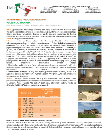ITAIATOUR Biuro Podróży sp. z o.o. www.italiatour.travel Kraków, 31-144 Warszawa, 00-669 Gdańsk, 80-835 ul. Asnyka 10/1 ul. Emilii Plater 10/54 ul. Szeroka 64/66 lok.1 tel./fax: +48 12 633 06 63 tel./fax: +48 22 412 72 72 tel.: +48 791 140 793 [email protected] [email protected] [email protected] AGRITURISMO PODERE MARCAMPO VOLTERRA / TOSCANA Siena 60km, Firenze 70 km, San Gimignano 35 km, Massa Marittima 65 km Opis: Agroturystyka Marcampo (otwarta cały rok), to odnowiony, niewielki dom, otoczony nieskazitelną przyrodą toskańskich wzgórz, która jest oazą ciszy i spokoju. Ciepłe powitanie właścicieli, dbałość o każdy szczegół sprawiają, że Podere Marcampo jest magicznym i przyjaznym miejscem, ucieczką od upału i zgiełku miasta. Plaża: około 35 km w Cecina Mare. Zakwaterowanie: struktura oddaje do dyspozycji klientów dwa rodzaje zakwaterowania: pokoje (3 pokoje, 2 apartamenty i 1 Suite. Pokoje 2-osobowe: La Ginestraia (ok. 30 m2) na parterze, z widokiem na dolinę i basen, łazienka z prysznicem i hydromasażem, mini barek, TV 22" LCD, Wi-Fi, telefon. La Lupinella (ok. 25 m2), na I piętrze, z widokiem na dolinę i basen, łazienka z prysznicem z hydromasażem, mini barek, TV 22" LCD, Wi-Fi, telefon. La Malvasia (ok. 25 m2), na parterze, z widokiem na dolinę i basen, łazienka z prysznicem z hydromasażem, mini barek, TV 22" LCD, Wi-Fi, telefon. Apartamenty: La Poiana dla 2/4 osób (ok. 80 m2), na II piętrze, posiada salon z kuchnią, TV 26" LCD, sypialnię, pokój z dwoma łóżkami pojedynczymi, łazienkę z wanną z hydromasażem i chromoterapią, Wi-Fi (ADSL), telefon. Możliwość dostawienia dwóch łóżek. 2 Il Fienile dla 2 osób (ok. 50 m ), na I piętrze, posiada salon z kuchnią, TV 26" LCD, sypialnię, łazienkę z prysznicem z hydromasażem, Wi-Fi (ADSL), telefon. Możliwość dostawienia dwóch łóżek. 2 Il Granaio dla 2 osób (ok. 40 m ), na I piętrze, posiada salon z kuchnią, TV 26" LCD, sypialnię, łazienkę z prysznicem z hydromasażem, Wi-Fi (ADSL), telefon. Możliwość dostawienia dwóch łóżek. Serwis: recepcja, basen, miejsce parkingowe. Możliwość nabycia oliwy, wina produkowanych przez właścicieli oraz wykupienia posiłków w restauracji „Del Duca” w Volterra. Wino „Giusto Alle Balze”, 2007 roku otrzymało srebrny medal na „Mondial du Merlot” 2009 w Lugano w Szwajcarii. Termin 2016 A B C 23.12 – 07.01 24.03 – 28.03 02.07 – 20.08 23.12 – 08.01 12.03 – 24.03 28.03 – 02.07 20.08 – 15. 10 07.01 – 12.03 15.10 – 23.12 La Ginestraia La Lupinella La Malvasia za dzień za tydzień 118 745 94 595 80 505 Cena w Euro za pokój ze śniadaniem, za dzień i tydzień . Check in / Check out: od 14.00 / do 10.30, wolny, minimum 3 noce. Wliczone w cenę: sprzątanie końcowe, ogrzewanie. Dopłaty: Dostawka w pokoju La Ginestraia Euro 25 za dzień lub 170 za tydzień. W pozostałych pokojach niedostępna. Sprzątanie dzienne Euro 10 za dzień. Redukcje: Pokój 1-osobowy zamieszkiwany przez 1-osobę minus 10%. Zwierzęta: nieakceptowane. ITAIATOUR Biuro Podróży sp. z o.o. www.italiatour.travel Kraków, 31-144 Warszawa, 00-669 Gdańsk, 80-835 ul. Asnyka 10/1 ul. Emilii Plater 10/54 ul. Szeroka 64/66 lok.1 tel./fax: +48 12 633 06 63 tel./fax: +48 22 412 72 72 tel.: +48 791 140 793 [email protected] [email protected] [email protected] Termin 2016 23.12 – 07.01 24.03 -28.03 A 02.07 -20.08 23.12 – 08.01 12.03 –24.03 B 28.03 -02.07 20.08 – 15.10 07.01 – 12.03 C 15.10 – 23.12 Il Granaio Il Fienile La Poiana za dzień za tydzień za dzień za tydzień za dzień za tydzień 128 805 138 870 210 1245 118 740 128 805 195 1165 105 660 115 725 175 1040 Cena w Euro za apartament za dzień i tydzień . Check in / Check out: od 14.00 / do 10.30, wolny, minimum 3 noce. Wliczone w cenę: sprzątanie końcowe. Dopłaty: Dostawka Euro 25 za dzień lub 125 za tydzień. Sprzątanie dzienne w Il Granaio/Il Fienile Euro 15 za dzień, w La Poiana Euro 20 za dzień. Śniadanie Euro 10 za osobę za dzień. Kaucja: Euro 150 za apartament, wpłata w dniu przyjazdu. Zwierzęta: nieakceptowane.