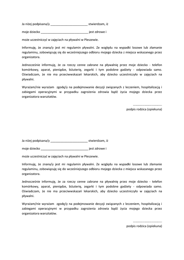 Ja niżej podpisana/y ______________________ stwierdzam, iż moje dziecko ____________________________ jest zdrowe i może uczestniczyć w zajęciach na pływalni w Pleszewie. Informuję, że znana/y jest mi regulamin pływalni. Ze względu na wypadki losowe lub złamanie regulaminu, zobowiązuję się do wcześniejszego odbioru mojego dziecka z miejsca wskazanego przez organizatora. Jednocześnie informuję, że za rzeczy cenne zabrane na pływalnię przez moje dziecko - telefon komórkowy, aparat, pieniądze, biżuterię, zegarki i tym podobne gadżety - odpowiada samo. Oświadczam, że nie ma przeciwwskazań lekarskich, aby dziecko uczestniczyło w zajęciach na pływalni. Wyrażam/nie wyrażam zgodę/y na podejmowanie decyzji związanych z leczeniem, hospitalizacją i zabiegami operacyjnymi w przypadku zagrożenia zdrowia bądź życia mojego dziecka przez organizatora warsztatów. ………………………………. podpis rodzica (opiekuna) Ja niżej podpisana/y ______________________ stwierdzam, iż moje dziecko ____________________________ jest zdrowe i może uczestniczyć w zajęciach na pływalni w Pleszewie. Informuję, że znana/y jest mi regulamin pływalni. Ze względu na wypadki losowe lub złamanie regulaminu, zobowiązuję się do wcześniejszego odbioru mojego dziecka z miejsca wskazanego przez organizatora. Jednocześnie informuję, że za rzeczy cenne zabrane na pływalnię przez moje dziecko - telefon komórkowy, aparat, pieniądze, biżuterię, zegarki i tym podobne gadżety - odpowiada samo. Oświadczam, że nie ma przeciwwskazań lekarskich, aby dziecko uczestniczyło w zajęciach na pływalni. Wyrażam/nie wyrażam zgodę/y na podejmowanie decyzji związanych z leczeniem, hospitalizacją i zabiegami operacyjnymi w przypadku zagrożenia zdrowia bądź życia mojego dziecka przez organizatora warsztatów. ………………………………. podpis rodzica (opiekuna)