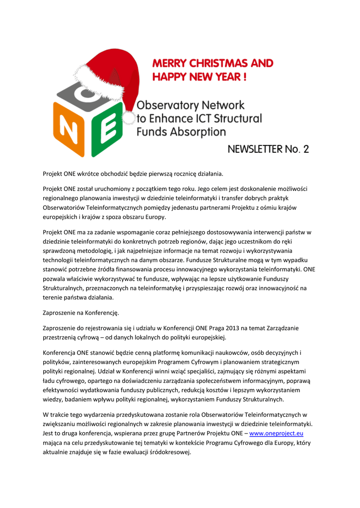 Projekt ONE wkrótce obchodzić będzie pierwszą rocznicę działania. Projekt ONE został uruchomiony z początkiem tego roku. Jego celem jest doskonalenie możliwości regionalnego planowania inwestycji w dziedzinie teleinformatyki i transfer dobrych praktyk Obserwatoriów Teleinformatycznych pomiędzy jedenastu partnerami Projektu z ośmiu krajów europejskich i krajów z spoza obszaru Europy. Projekt ONE ma za zadanie wspomaganie coraz pełniejszego dostosowywania interwencji państw w dziedzinie teleinformatyki do konkretnych potrzeb regionów, dając jego uczestnikom do ręki sprawdzoną metodologię, i jak najpełniejsze informacje na temat rozwoju i wykorzystywania technologii teleinformatycznych na danym obszarze. Fundusze Strukturalne mogą w tym wypadku stanowić potrzebne źródła finansowania procesu innowacyjnego wykorzystania teleinformatyki. ONE pozwala właściwie wykorzystywać te fundusze, wpływając na lepsze użytkowanie Funduszy Strukturalnych, przeznaczonych na teleinformatykę i przyspieszając rozwój oraz innowacyjność na terenie państwa działania. Zaproszenie na Konferencję. Zaproszenie do rejestrowania się i udziału w Konferencji ONE Praga 2013 na temat Zarządzanie przestrzenią cyfrową – od danych lokalnych do polityki europejskiej. Konferencja ONE stanowić będzie cenną platformę komunikacji naukowców, osób decyzyjnych i polityków, zainteresowanych europejskim Programem Cyfrowym i planowaniem strategicznym polityki regionalnej. Udział w Konferencji winni wziąć specjaliści, zajmujący się różnymi aspektami ładu cyfrowego, opartego na doświadczeniu zarządzania społeczeństwem informacyjnym, poprawą efektywności wydatkowania funduszy publicznych, redukcją kosztów i lepszym wykorzystaniem wiedzy, badaniem wpływu polityki regionalnej, wykorzystaniem Funduszy Strukturalnych. W trakcie tego wydarzenia przedyskutowana zostanie rola Obserwatoriów Teleinformatycznych w zwiększaniu możliwości regionalnych w zakresie planowania inwestycji w dziedzinie teleinformatyki. Jest to druga konferencja, wspierana przez grupę Partnerów Projektu ONE – www.oneproject.eu mająca na celu przedyskutowanie tej tematyki w kontekście Programu Cyfrowego dla Europy, który aktualnie znajduje się w fazie ewaluacji śródokresowej. Rozpoczęła się już rejestracja na Konferencję ONE Praga 2013 – Zarządzanie Przestrzenią Cyfrową – od danych lokalnych do polityki regionalnej, 18 kwietnia www.oneproject.eu/registration/. Przyjmujemy jeszcze streszczenia wystąpień badawczych, prezentacji specjalistów i studiów przypadku. Więcej informacji można znaleźć pod adresem www.oneproject.eu/one-conferenceprague. Omówienie metodologii "żywych laboratoriów" i korzystania z aplikacji WEB 2.0 w Zjednoczonym Królestwie. W grudniu odbyły się w Wielkiej Brytanii dwudniowe Warsztaty Cyfrowe. Ich uczestnicy mieli okazję zapoznać się z przykładami dobrej praktyki, pokazującymi, w jaki sposób Manchester wykorzystuje "żywe laboratoria" w celu przyspieszania rozwoju cyfrowego na terenie miasta. Dave Carter, kierownik Agencji Rozwoju Cyfrowego miasta Manchester powiedział: "To wspaniała okazja do podzielenia się przez Manchester bogactwem swego doświadczenia i przekonania się, co osiągają inni partnerzy europejscy w poszczególnych regionach i miastach". Wśród prezenterów znalazł się James Evens z Uniwersytetu Manchester, który omówił działalność "żywych laboratoriów", ich wpływ oraz ich nowatorskie, oparte na zarządzaniu cyfrowym podejście do zrównoważonego rozwoju. Stephen Flower przyjrzał się bliżej tworzeniu i prowadzeniu Studiów Mediów Społecznych. Inne omawiane tematy dotyczyły strategii cyfrowej miasta Manchester, sprawniejszego działania z wykorzystaniem mediów społecznych, wykorzystania "żywych laboratoriów" i "Sprawnych Miast", kampanii Naprzód Cyfrowi Mistrzowie i podejścia, jakie miasto Manchester przyjęło w odniesieniu do "żywych laboratoriów". Wśród prezentacji znalazły się wystąpienia na temat infrastruktury łączności szerokopasmowej w Wielkiej Brytanii oraz projektów udostępniania publicznych sieci Wi-Fi na terenie miasta. Na zakończenie Warsztatów przedstawione zostały doświadczenia z pierwszej ręki, dotyczące wybranych działań w dziedzinie przekazu cyfrowego na terenie miasta Manchester. Uczestnicy mogli zwiedzić MadLab, organizację, zajmującą się działaniami u podstaw, która pełni rolę miejsca wymiany doświadczeń wciąż rosnącej społeczności cyfrowej i kreatywnej miasta Manchester, a także krzewi wiedzę o tworzeniu "żywych laboratoriów" i przestrzeni dla innowacyjności. Kontakt Więcej informacji na temat Projektu można znaleźć pod adresem www.oneproject.eu lub można dołączyć do nas na Facebooku, Linkedin i epractice.eu, bądź skontaktować się z Ivą Walterovą, Szefową Działu Informacyjnego Projektu ONE w EPMA pod adresem [email protected]