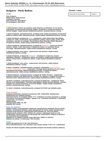 Biuro Podróży WIGRA s.c. ul. Człuchowska 25 01-360 Warszawa Tel. 22 665 06 06, 22 664 94 86, www.wigra.com.pl, e-mail: [email protected] Bułgaria - Perła Bałkan 11 dni Termin i cena 2015.08.22-2015.09.01 2499 zł Kraj: Bułgaria Miejscowość: Brak danych Transport: Autokar Data ważności: 2015-08-23 Nr katalogowy: Wyc/2015 PROGRAM: 1 dzień:wyjazd z Polski wg rozkładu jazdy (zbiórka uczestników 15 min przed wyjazdem), przejazd przez Słowację, Węgry. Przejazd na nocleg tranzytowy na terenie Węgier, ciepła kolacja (dodatkowo płatna), zakwaterowanie, nocleg. 2 dzień:śniadanie, wykwaterowanie, przejazd przez Serbię do Bułgarii. Przejazd do hotelu w okolicy Sofii. Zakwaterowanie, ciepła kolacja (dodatkowo płatna), nocleg. 3 dzień:śniadanie, przejazd do Sofii - zwiedzanie: sobór Aleksandra Newskiego, cerkiew św. Sofii, uniwersytet, Zgromadzenie Ludowe, dawny pałac carski, teatr narodowy, rotunda św. Jerzego, meczet Bania Baszi Dżamija. Ryłski Monastyr. Przejazd do hotelu, ciepła kolacja (dodatkowo płatna), nocleg. 4 dzień:śniadanie, wykwaterowanie, przejazd do Płowdiwu - spacer po starym mieście, Odeon, Teatr Starożytny. Przejazd do hotelu na wybrzeżu Morza Czarnego, zakwaterowanie, ciepła kolacja (dodatkowo płatna), nocleg 5 dzień:śniadanie, czas wolny - wypoczynek nad morzem, ciepła kolacja (dodatkowo płatna), nocleg. 6 dzień:śniadanie, przejazd do Sozopolu - zwiedzanie: cerkwi św. Cyryla I Metodego. Nesebyr - zwiedzanie: spacer po mieście, zespół średniowiecznych cerkwi i obwarowań. Przejazd do hotelu, ciepła kolacja (dodatkowo płatna), nocleg. 7 dzień:śniadanie, czas wolny - wypoczynek nad morzem, ciepła kolacja (dodatkowo płatna), nocleg. 8 dzień: śniadanie, wykwaterowanie, przejazd i zwiedzanie: Doliny Królów Trackich, Doliny Róż, Szipki - grobowiec Trackiego Króla Seuthesa III oraz cerkwi Narodzenia Pańskiego. Wioska etnograficzna Etyr. Przejazd do hotelu, zakwaterowanie, ciepła kolacja (dodatkowo płatna), nocleg. 9 dzień:śniadanie, wykwaterowanie, przejazd do Veliko Tarnovo - zwiedzanie: twierdza Carevec oraz Skała Straceń, cerkiew św. Dymitra. Przejazd do hotelu w okolicach Sofii. Zakwaterowanie, ciepła kolacja (dodatkowo płatna), nocleg. 10 dzień: śniadanie, wykwaterowanie, przyjazd do Belgradu - zwiedzanie: Stare Miasto, Park Kalemegdan, Twierdza Kalemegdan, Bulwar Kniazia Michała, cerkwie. Przejazd na nocleg tranzytowy na terenie Węgier, ciepła kolacja (dodatkowo płatna), zakwaterowanie, nocleg. 11 dzień: śniadanie, wykwaterowanie, przyjazd do Polski wg rozkładu jazdy. CENA ZAWIERA: przejazd autokarem: standard turystyczny (WC, Video/DVD, klimatyzacja dostosowany do wielkości grupy), zakwaterowanie: 8 noclegów hotele **/*** w Bułgarii na trasie wycieczki, 2 noclegi tranzytowe na terytorium Węgier - pokoje 2 os. z łazienką (możliwość 1 dostawki), wyżywienie: 10 śniadań, opieka pilota, ubezpieczenie NNW, KL, BP, podatek VAT-marża. CENA NIE ZAWIERA: biletów wstępu, przewodników lokalnych, wypożyczenia zestawów Tourist Guide System, komunikacji lokalnej, opłat wjazdowych do miast, opłaty klimatycznej, kosztów programowych. Orientacyjny koszt pakietu ok. 125 euro płatne obligatoryjnie pilotowi. Pilot rozlicza się z grupą z pobranych kwot na cele programowe. Koszty płacone za całą grupę (np. przewodnicy lokalni) są dzielone na wszystkich jej uczestników, Dopłaty do 10 ciepłych kolacji; koszt 460 zł/os. (płatne w biurze), Dopłata do pokoju 1 osobowego: 990 zł/osoba. ZNIŻKI: Zniżka dla dziecka do 12 lat: 150 zł/dziecko (przy zakwaterowaniu z os. dorosłą w tym samym pokoju 2 lub 2 os. z dostawką). Uwagi: W trakcie wyjazdu należy posiadać paszport lub dowód osobisty (dotyczy 1/2 Biuro Podróży WIGRA s.c. ul. Człuchowska 25 01-360 Warszawa Tel. 22 665 06 06, 22 664 94 86, www.wigra.com.pl, e-mail: [email protected] również osób niepełnoletnich). Zalecamy wykupienie ubezpieczenia kosztów rezygnacji (koszt 3,5 % ceny wyjazdu). Kolejność realizacji punktów programu może ulec zmianie lub odwróceniu. W celu realizacji programu cześć przejazdów może być realizowana środkami komunikacji miejskiej. 2/2 Powered by TCPDF (www.tcpdf.org)