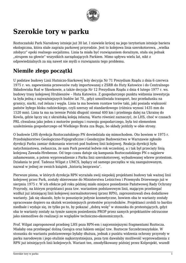 Szerokie tory w parku Roztoczański Park Narodowy istnieje już 30 lat. I niewiele krócej na jego terytorium istnieje bariera ekologiczna, która stale zagraża parkowej przyrodzie. Jest to kolejowa linia szerokotorowa, „wielka zdobycz” epoki realnego socjalizmu. Linia ta miała być rozwiązaniem doraźnym, stała się jednak „strupem na głowie” wszystkich zarządzających Parkiem. Mimo upływu wielu lat, nikt z odpowiedzialnych za nią nawet nie myśli o rozwiązaniu tego problemu. Niemiłe złego początki U podstaw budowy Linii Hutniczo-Siarkowej leży decyzja Nr 71 Prezydium Rządu z dnia 6 czerwca 1975 r. ws. zapewnienia przewozów rudy importowanej z ZSRR do Huty Katowice i do Centralnego Składowiska Rud w Sławkowie, a także decyzja Nr 12 Prezydium Rządu z dnia 4 lutego 1977 r. ws. budowy trasy kolejowej Hrubieszów – Huta Katowice. Z gospodarczego punktu widzenia inwestycja ta była jedną z najważniejszych budów lat 70., gdyż umożliwiała transport, bez przeładunku na granicy, siarki, rud żelaza i węgla. Linia ta ma bowiem rozstaw torów taki, jaki posiada większość państw byłego bloku radzieckiego, czyli szerszy od standardowego (różnica wynosi 1435 mm do 1520 mm). Linia ta ma na terenie Polski długość niemal 400 km i przebiega dalej na Ukrainę do Kowla, gdzie łączy się z ukraińską koleją żelazną. Warto również zaznaczyć, że LHS, choć w czasach PRL chwalona jako jeden z motorów postępu i rozwoju gospodarczego, była też elementem uzależnienia gospodarczego od Wielkiego Brata zza Bugu, bo składy jeździły w obie strony. O budowie LHS dyrekcja Roztoczańskiego PN dowiedziała się mimochodem. Oto bowiem w 1975 r. Przedsiębiorstwo Geologiczno-Fizjograficzne i Geodezyjne Budownictwa w Warszawie zgłosiło dyrekcji Parku zamiar dokonania wierceń pod budowę linii kolejowej. Reakcja dyrekcji była natychmiastowa, zwłaszcza, że sam Park powstał ledwie rok wcześniej, a i tak był przecięty linią kolejową Zawada-Hrebenne. Od tego czasu datuje się kampania Roztoczańskiego PN o najpierw zahamowanie, a potem wyprowadzenie z Parku linii szerokotorowej, wybudowanej wbrew protestom. Działania te prof. Tadeusz Wilgat z UMCS, będący od samego początku w nią zaangażowanym, nazwał w jednej ze swoich książek „historią bezprawia”. Pierwsze pisma, w których dyrekcja RPN wyrażała swój niepokój projektami budowy tak ważnej linii kolejowej przez Park, zostały skierowane do Ministerstwa Leśnictwa i Przemysłu Drzewnego już w sierpniu 1975 r. W ich efekcie pół roku później miało miejsce posiedzenie Państwowej Rady Ochrony Przyrody, na którym projektanci poza tzw. wariantem podstawowym linii, mającym przebiegać wzdłuż już istniejącej linii kolejowej normalnotorowej (przez RPN), zaprezentowali dwa dodatkowe warianty. Jak się okazało, było to posunięcie jedynie kosmetyczne, bowiem oba te warianty zostały opracowane dopiero na skutek wcześniejszych protestów przyrodników. Projektanci zrobili to bardzo niedbale i wydaje się, że tylko po to, by pokazać „dobrą wolę” w stosunku do protestujących, gdyż oba te warianty zostały na tymże samym posiedzeniu PROP przez samych projektantów odrzucone jako niemożliwe do realizacji ze względów techniczno-ekonomicznych. Prof. Wilgat zaproponował przebieg LHS poza RPN-em i najcenniejszymi fragmentami Roztocza. Miałaby ona przebiegać doliną Gorajca oraz łukiem omijać tzw. Roztocze Szczebrzeszyńskie. W stosunku do wariantu podstawowego byłaby dłuższa, jednak z punktu widzenia ochrony przyrody w parku narodowym i jego otulinie najkorzystniejsza, poza tym dawałaby możliwość wyprowadzenia z RPN już istniejących linii kolejowych. Wariant ten, zmodyfikowany później przez Kolprojekt, wszedł Szerokie tory w parku 1 do historii sporu o LHS jako tzw. wariant Gorajec. Przez Zespół Rzeczoznawców Stowarzyszenia Inżynierów i Techników Wodnych i Melioracji NOT pod kierownictwem prof. Aleksandra Tuszko, został oceniony jako „jedyny możliwy do realizacji z punktu widzenia ochrony przyrody, potrzeb społecznych i gospodarki narodowej”. Tymczasem projektanci z Biura Projektów Kolejowych torpedowali ten pomysł jako zbyt kosztowny, wymagający budowy tunelu i znacznych wywłaszczeń, co tylko w części było prawdą. Na naradzie w Zamościu w kwietniu 1976 r., dotyczącej przebiegu LHS przez województwo zamojskie, ustalono i zaakceptowano jej przebieg tylko w dwóch odcinkach (przed i po odcinku, który miałby przebiegać przez RPN). Przychylając się do opinii środowisk przyrodników, Urząd Wojewódzki w Zamościu uważał, że odcinek nieuzgodniony winien przebiegać poza RPN i jego otuliną, jego przebieg powinien zaś być szeroko konsultowany w Ministerstwie Komunikacji z udziałem PROP i wszelkich zainteresowanych. Władze województwa zamojskiego poparły też koncepcję ominięcia RPN mniejszym łukiem niż to proponował prof. Wilgat, tak aby pasmo wzgórz Roztocza Szczebrzeszyńskiego zostało przebite tunelem – była to koncepcja zamojskiego Biura Planowania Przestrzennego. Przez cały czas trwały też działania, które dziś nazwalibyśmy lobbingiem, na rzecz zaniechania planów budowania LHS w Parku. Stosowne pisma wysyłają do władz: Wojewódzki Komitet Frontu Jedności Narodu, Zarząd Wojewódzki LOP, Komisja Ochrony Przyrody ZG PTTK i inni. Starania te na niewiele się jednak zdają, bowiem w lutym 1977 r. w Zamościu projekt przebiegu trasy H-S przez RPN zostaje de facto zatwierdzony jako tańszy i szybszy do realizacji. W protokole ze spotkania w WDRMiOW zapisano też dość cynicznie, że „projekt uwzględnia wszystkie możliwe do spełnienia w tym miejscu warunki ochrony środowiska, krajobrazu i przyrody”. Mimo że dyrekcja RPN odesłała do Zarządu Linii Hutniczo-Siarkowej nieuzgodnioną dokumentację projektową, mimo że koncepcja przebiegu przez park narodowy stała w jaskrawej sprzeczności z ówcze