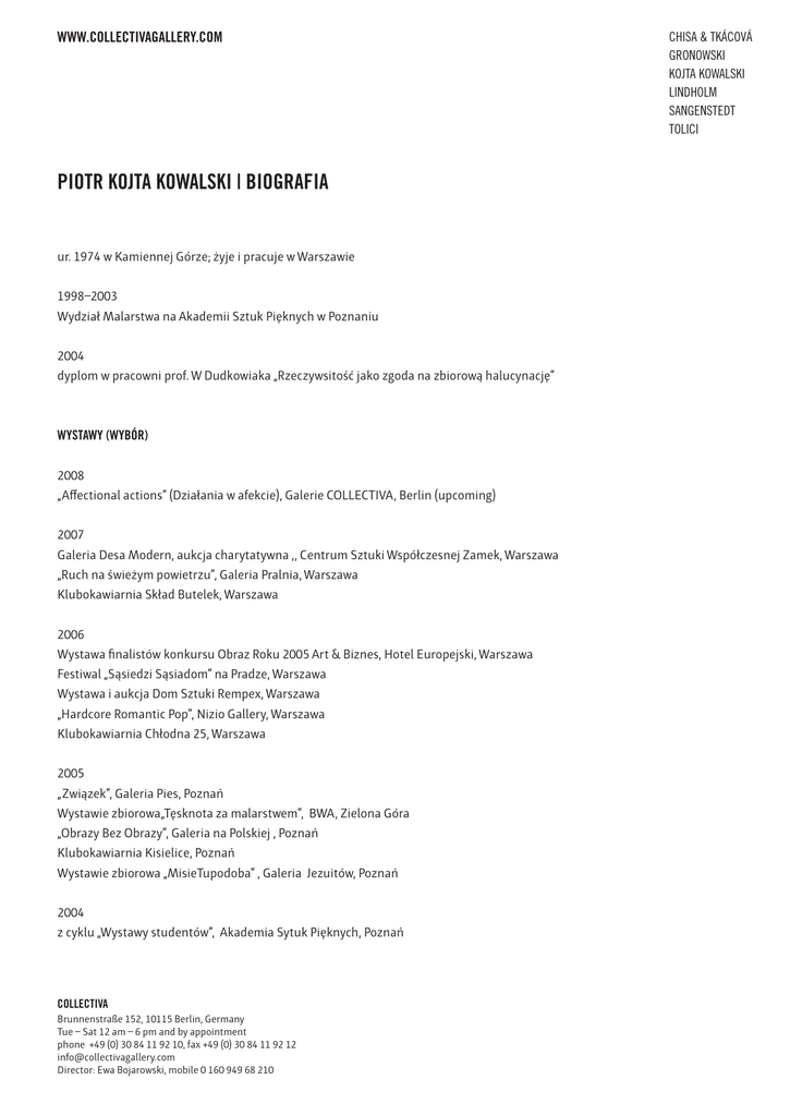 WWW.COLLECTIVAGALLERY.COM PIOTR KOJTA KOWALSKI | BIOGRAFIA ur. 1974 w Kamiennej Górze; żyje i pracuje w Warszawie 1998–2003 Wydział Malarstwa na Akademii Sztuk Pięknych w Poznaniu 2004 dyplom w pracowni prof. W Dudkowiaka „Rzeczywsitość jako zgoda na zbiorową halucynację“ WYSTAWY (WYBÓR) 2008 „Affectional actions“ (Działania w afekcie), Galerie COLLECTIVA, Berlin (upcoming) 2007 Galeria Desa Modern, aukcja charytatywna ,, Centrum Sztuki Współczesnej Zamek, Warszawa „Ruch na świeżym powietrzu“, Galeria Pralnia, Warszawa Klubokawiarnia Skład Butelek, Warszawa 2006 Wystawa finalistów konkursu Obraz Roku 2005 Art & Biznes, Hotel Europejski, Warszawa Festiwal „Sąsiedzi Sąsiadom“ na Pradze, Warszawa Wystawa i aukcja Dom Sztuki Rempex, Warszawa „Hardcore Romantic Pop“, Nizio Gallery, Warszawa Klubokawiarnia Chłodna 25, Warszawa 2005 „Związek“, Galeria Pies, Poznań Wystawie zbiorowa„Tęsknota za malarstwem“, BWA, Zielona Góra „Obrazy Bez Obrazy“, Galeria na Polskiej , Poznań Klubokawiarnia Kisielice, Poznań Wystawie zbiorowa „MisieTupodoba“ , Galeria Jezuitów, Poznań 2004 z cyklu „Wystawy studentów“, Akademia Sytuk Pięknych, Poznań COLLECTIVA Brunnenstraße 152, 10115 Berlin, Germany Tue – Sat 12 am – 6 pm and by appointment phone +49 (0) 30 84 11 92 10, fax +49 (0) 30 84 11 92 12 [email protected] Director: Ewa Bojarowski, mobile 0 160 949 68 210 CHISA & TKÁCOVÁ GRONOWSKI KOJTA KOWALSKI LINDHOLM SANGENSTEDT TOLICI WWW.COLLECTIVAGALLERY.COM PROJEKTE UND PREISE 2007 Współzałóżyciel stowarzyszenia „Nowa Praga“, Warszawa 2006 Art & Biznes „Obraz roku“, nominacja za obraz „Hope“, Warszawa 2005 „Wnęka“, wystawa w przestrzeni prywatnej, Poznań 2004 Zwycięzca Festiwalu Filmów Żenujących, Galeria PATYK, Poznań COLLECTIVA Brunnenstraße 152, 10115 Berlin, Germany Tue – Sat 12 am – 6 pm and by appointment phone +49 (0) 30 84 11 92 10, fax +49 (0) 30 84 11 92 12 [email protected] Owner / Director: Ewa Bojarowski, mobile 0 160 949 68 210 CHISA & TKÁCOVÁ GRONOWSKI KOJTA KOWALSKI LINDHOLM SANGENSTEDT TOLICI