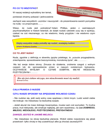 PO CO TO WSZYSTKO? W naszej redakcji wybraliśmy ten temat, ponieważ chcemy pokazać i jednocześnie zachęcić was wszystkich- uczniów i nauczycieli - do prezentowania swoich pomysłów na nudę –co proponujecie……. Wiesz, że nuda jest potrzebna? Adam Phillips, jeden z ważniejszych psychoanalityków w historii twierdził, że dzięki nudzie człowiek uczy się w spokoju, czekać na coś nieznanego, co nie wiadomo, kiedy przyjdzie i nie wiadomo czym będzie. Gdyby wszystkie małpy potrafiły się nudzić, zostałyby ludźmi. Johann Wolfgang Goethe CO TO JEST NUDA? Nuda, zgodnie z definicją w słowniku języka polskiego, to „uczucie przygnębienia, zniechęcenia, spowodowane bezczynnością, monotonią życia”, ale………… . Ma też swoje dobre strony. Zmusza do działania, zrobienia czegoś z wolnym czasem lub do wprowadzenia zmian w naszym codziennym bytowaniu. OCZYWIŚCIE MYŚLIMY O CZYMŚ DOBRYM, MIŁYM WESOŁYM, POŻYTECZNYM i ……… Kto nie jest ciekaw niczego, ten nieuchronnie musi się nudzić. Konrad Lorenz CAŁA PRAWDA O NUDZIE CZYLI NASZE SPOSOBY NA SPĘDZANIE WOLNEGO CZASU. - Nie nudzisz się, jeśli swój wolny czas spędzasz z kimś innym. Ludzi wokół ciebie nie brakuje- nie mieszkasz na bezludnej wyspie. - Jeżeli akurat nie masz dobrego towarzystwa, musisz sam coś wymyśleć. To trudna praca, trud niebywały, ale smakuje najlepiej, jak sam wpadniesz, na coś DOBREGO, MIŁEGO, WESOŁEGO, POŻYTECZNEGO, PRZYDATNEGO ZAWSZE JESTEŚ W JAKIMŚ MIEJSCU - Nie mieszkasz na obcej bezludnej planecie. Wokół ciebie rozpościera się jakaś przestrzeń- tylko chciej w niej uczestniczyć albo ją chociaż zauważyć!!!!! PIERWSZA PRZESTZREŃ – DOM - Zauważ, że masz rodziców, rodzeństwo, rodzinę. Idąc w gościnę, nie zabieraj ze sobą nudy. Mikołaj Gogol -Zrób coś pożytecznego w domu (pomóż mamie, tacie, młodszemu rodzeństwu): możesz choćby posprzątać, to nie boli, a inni to zauważą i będzie ci miło. Możesz coś zmienić w wystroju swojego pokoju lub kącika ( nie powiem o ubraniu choćby choinki na święta), ale nie tak „na odwal się”, tylko „na serio”. Wanna na błysk, dywan pod szampon, rupiecie i inne maskoty na (zamiast za) półkę. Zacznij od własnego biurka. Porządne ogarnięcie mieszkania zawsze dodaje mi energii do przyszłej pracy i wypoczynku. A skoro i tak się nudzisz… - Może wykorzystasz stare zdjęcia, które leżą samotnie w komodzie, do wykonania własnego albumu rodzinnego. - Możesz wiele innych rzeczy zrobić razem z rodziną: wycieczka, wyjście do kina, wyjście na spacer, obejrzenie dobrego filmu, rozmowa o czymś ciekawym (opowiesz choćby śmieszną sytuację z twoich obserwacji), wspólne uprawianie sportu (a może po prostu bieganie, gra w tenisa lub ……) DRUGA PRZESTRZEŃ – PODWÓRKO I NIE TYLKO - Na podwórku też można poznać czy spotkać się z kolegami i koleżankami, to lepsze niż siedzenie samotnie w swoim pokoju przy komputerze. - Potrzebujesz spotkań z przyjaciółmi, z którymi dzielisz się swoimi obserwacjami i ciekawymi tematami, bo czasem niestety inni wiedzą lub umieją wymyśleć więcej. - A zacznij od rożnegorodzaju zabaw i gier zespołowych. TRZECIA PRZESTRZEŃ – SZKOŁA - Tutaj dzieje się sporo oprócz nauki jako podstawowego obowiązku ( czyli to taka twoja praca zawodowa) - masz wiele możliwości, a i ty sam zawsze możesz coś zaproponować!!!!!!!!! - Koła zainteresowań- jesteś chętny, czy nie masz ochoty i jesteś leniwy. - Organizowane są konkursy, spektakle, olimpiady. - Tutaj dzieje się sporo, choćby udział w programach i projektach: Language @mosphere-Koło Noblisty Akademia Myśli Twórczej -Robotyka Destination Imagination -Teatr Cieni Comenius My healthy lifestyle... POKL-KomPAS Nauka bez tajemnic -Be Smart, My Student! Euroregion Silesia Sport w sztuce... Projekty systemowe -Indywidualizacja... TIK Tak Redagowanie ciekawych tekstów w ramach „Twórcy i Odkrywcy” Możliwości jest wiele nie tylko dla tych zaprezentowanych na stronie internetowej naszej szkoły – wiesz, że są takie, ale jeśli nadal się nudzisz……….to mamy coś jeszcze, ale o tym przeczytasz poniżej, jeśli tylko masz ochotę……. CZWARTA PRZESTRZEŃ – MIEJSCOWOŚĆ, W KTÓREJ MIESZKASZ - Możesz się wybrać do kina, zaprosić rodziców na dobra komedię, fundując im bilety z własnego kieszonkowego. - Powinieneś poznać ciekawe miejsca, historię i interesujące wydarzenia historyczne związane z tym miejscem. - Wyjdź z domu i zrób zdjęcia ciekawych miejsc, napisz o nich wiersz lub opowiadanie- popatrz na swoje miasto, jakbyś tu dopiero przyjechał(a). POMYSŁÓW KILKA NA - nie tylko ·- AKTYWNE SPĘDZANIE CZASU - Pójdź na spacer do nieznanej Ci wcześniej części miasta. - Wysprzątaj mieszkanie (ale to już było i powtórzyć nie zaszkodzi). - Przeczytaj wszystkie książki, które czytali lub polecają Tobie rodzice lub koledzy – z filmami zrób to samo….. - Zrób sobie proste ćwiczenie w domu, może razem z osobą, która jest w pobliżu. - Zrób komuś miłą niespodziankę. Przygotuj prezent zupełnie bez okazji. - Przemebluj własny pokoik lub kącik. Zawsze kusiło Cię sprawdzić, jak by to wyglądało……….No to, co Cię powstrzymuje. - Naucz się lub zrób coś razem z mamą choćby pizzę, pomóż tacie zrobić coś praktycznego. W Internecie znajdziesz ciekawe porady i przepisy, a może wystarczy zaskoczyć rodziców zrobieniem kanapek czy śniadania. - Dowiedz się więcej o tym, co lubisz jeść lub robić, zapytaj rodziców, jakie oni mieli pomysły na nudę. NAWET, JEŚLI STRASZNIE CI SIĘ NIE CHCE, TO JEDNAK: - Zadzwoń do kolegi lub babci, czy dziadka i zapytaj go, co słychać – tak z byle powodu. - Pomyśl, weź kartkę papieru i napisz, co chcesz robić w przyszłości, kim chcesz być. - Przestań grać na nerwach wszystkim dookoła, a może zacznij się uczyć pływać, grać na gitarze, grać w tenisa, chodzi