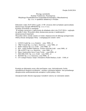 Poręba 26.08.2016 Wyciąg z protokołu Komisji Techniczno- Przetargowej Miejskiego Przedsiębiorstwa Gospodarki Komunalnej i Mieszkaniowej Sp. z o.o. w upadłości układowej w Porębie Dokonała w dniu 26.07.2016 o godz .13 00 otwarcia ofert na badanie sprawozdania finansowego Zarządu MPGKIM Sp. z o.o. w u.u. Komisja stwierdziła co następuje: W terminie zawartym w zaproszeniu do składania ofert tj do 22.07.2016 r. wpłynęło do spółki 9 ofert. Wszystkie oferty dostarczono pocztą w zamkniętych i nienaruszonych kopertach. Wszystkie oferty zostały uznane za ważne i dopuszczone do dalszego postępowania: Ofertę złożyły następujące firmy z następującymi cenami netto: 1. 2. 3. 4. 5. 6. 7. 8. 9. LEXUS Audit Sp. z o.o. Kraków – cena 5000,- zł PKF Consult Sp. z o.o Sp.k. Katowice – cena 7800,- zł KPW Audytor Sp.z o.o. Łódź - cena 4900,- zł KPT Audyt Podatki Edukacja ,Tomasz Pietrzak Łódź – cena 5400,- zł DB AUDYT Sp z o.o. Katowice - cena 7000,- zł Biuro Audytorskie Jerzy Cyran Tychy – cena 6900,- zł EKO-BILANS Sp. z o.o. Łódź – cena 5800,- zł BUFIKS Sp. z o.o. Katowice- cena 9000,- zł CF Contept Finance Audyt i Doradztwo Rafał Durkacz, Łódź – 5100,-zł Komisja po dokonaniu oceny ofert pod kątem: ceny, doświadczenia, liczby zatrudnionych biegłych rewidentów , terminu wykonania badania oraz posiadanego ubezpieczenia zarekomendowała zarządowi wybór jednej z firm. Zarząd prowadzi obecnie negocjacje warunków umowy na wykonanie audytu