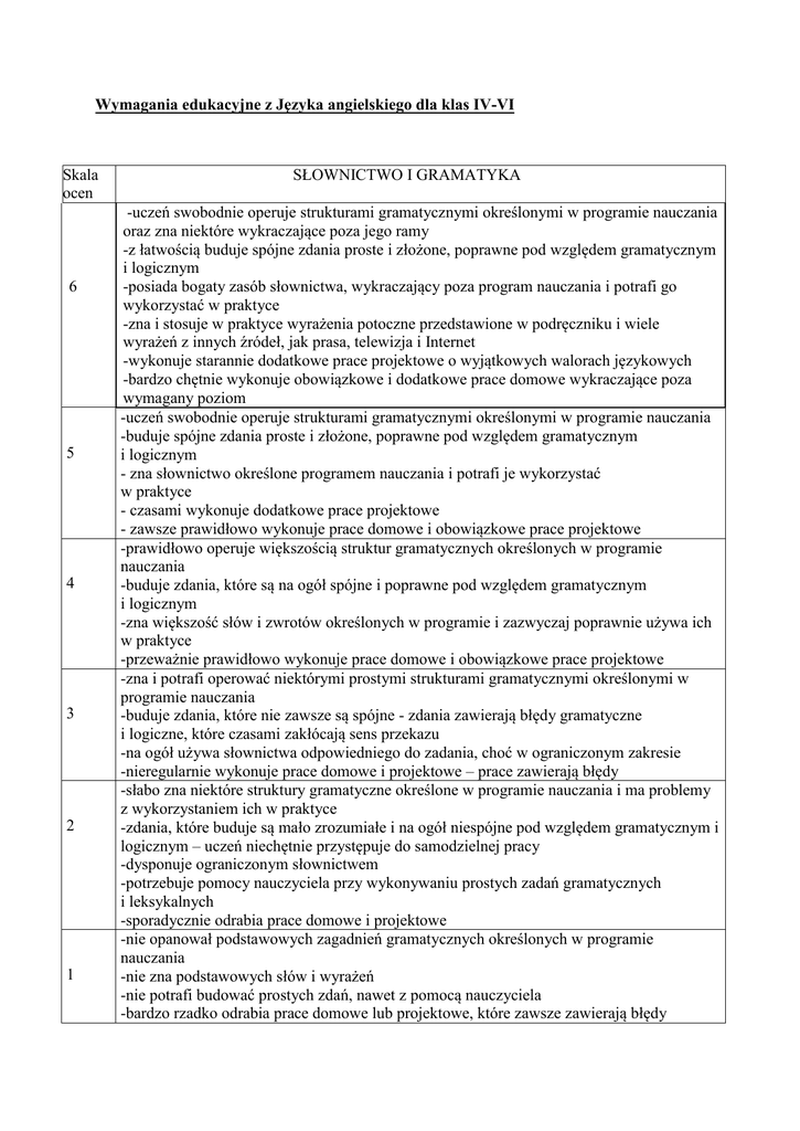 Wymagania edukacyjne z Języka angielskiego dla klas IV-VI Skala ocen 6 5 4 3 2 1 SŁOWNICTWO I GRAMATYKA -uczeń swobodnie operuje strukturami gramatycznymi określonymi w programie nauczania oraz zna niektóre wykraczające poza jego ramy -z łatwością buduje spójne zdania proste i złożone, poprawne pod względem gramatycznym i logicznym -posiada bogaty zasób słownictwa, wykraczający poza program nauczania i potrafi go wykorzystać w praktyce -zna i stosuje w praktyce wyrażenia potoczne przedstawione w podręczniku i wiele wyrażeń z innych źródeł, jak prasa, telewizja i Internet -wykonuje starannie dodatkowe prace projektowe o wyjątkowych walorach językowych -bardzo chętnie wykonuje obowiązkowe i dodatkowe prace domowe wykraczające poza wymagany poziom -uczeń swobodnie operuje strukturami gramatycznymi określonymi w programie nauczania -buduje spójne zdania proste i złożone, poprawne pod względem gramatycznym i logicznym - zna słownictwo określone programem nauczania i potrafi je wykorzystać w praktyce - czasami wykonuje dodatkowe prace projektowe - zawsze prawidłowo wykonuje prace domowe i obowiązkowe prace projektowe -prawidłowo operuje większością struktur gramatycznych określonych w programie nauczania -buduje zdania, które są na ogół spójne i poprawne pod względem gramatycznym i logicznym -zna większość słów i zwrotów określonych w programie i zazwyczaj poprawnie używa ich w praktyce -przeważnie prawidłowo wykonuje prace domowe i obowiązkowe prace projektowe -zna i potrafi operować niektórymi prostymi strukturami gramatycznymi określonymi w programie nauczania -buduje zdania, które nie zawsze są spójne - zdania zawierają błędy gramatyczne i logiczne, które czasami zakłócają sens przekazu -na ogół używa słownictwa odpowiedniego do zadania, choć w ograniczonym zakresie -nieregularnie wykonuje prace domowe i projektowe – prace zawierają błędy -słabo zna niektóre struktury gramatyczne określone w programie nauczania i ma problemy z wykorzystaniem ich w praktyce -zdania, które buduje są mało zrozumiałe i na ogół niespójne pod względem gramatycznym i logicznym – uczeń niechętnie przystępuje do samodzielnej pracy -dysponuje ograniczonym słownictwem -potrzebuje pomocy nauczyciela przy wykonywaniu prostych zadań gramatycznych i leksykalnych -sporadycznie odrabia prace domowe i projektowe -nie opanował podstawowych zagadnień gramatycznych określonych w programie nauczania -nie zna podstawowych słów i wyrażeń -nie potrafi budować prostych zdań, nawet z pomocą nauczyciela -bardzo rzadko odrabia prace domowe lub projektowe, które zawsze zawierają błędy uniemożliwiające zrozumienie treści Skala ocen 6 5 4 3 2 1 MÓWIENIE -swobodnie i bardzo chętnie wypowiada się na różne tematy, zachowując przy tym dużą dokładność językową - poziom wypowiedzi wykracza poza wymagania programowe - ma bardzo dobrą wymowę i można go łatwo zrozumieć -w zadaniach komunikacyjnych jest zawsze bardzo aktywny i zaangażowany -w sposób naturalny i spontaniczny niezwykle chętnie wypowiada się na różne tematy -dość swobodnie i chętnie wypowiada się na różne tematy, zachowując przy tym dokładność językową - potrafi dość płynnie i bez zahamowań mówić na tematy określone w programie nauczania - dysponuje pełnym zakresem słownictwa opisanym w programie nauczania - ma prawidłową wymowę i można go łatwo zrozumieć - w zadaniach komunikacyjnych jest zawsze aktywny i zaangażowany -w sposób naturalny i spontaniczny bardzo chętnie wypowiada się podczas lekcji na różne tematy -mówi z lekkim wahaniem, dość spójnie, w miarę poprawnym językiem - dysponuje słownictwem wystarczającym do dość swobodnej interakcji w zakresie opisanym w programie nauczania - można go zazwyczaj zrozumieć -potrafi włączyć się do rozmowy - w zadaniach komunikacyjnych jest raczej aktywny -na ogół w naturalny sposób chętnie wypowiada się podczas lekcji na różne tematy -uczeń mówi z wyraźnym wahaniem, raczej niespójnie i niepełnymi zdaniami -posługując się językiem, popełnia liczne błędy, które czasem zakłócają przekaz -wypowiada się tylko na wybrane zagadnienia opisane w programie nauczania -w zadaniach komunikacyjnych jest rzadko aktywny, często ułatwia sobie pracę, posługując się językiem ojczystym -rzadko wypowiada się podczas lekcji, zapytany popełnia dużo błędów językowych -uczeń wypowiada się sporadycznie, nie z własnej inicjatywy -popełnia wiele błędów uniemożliwiających zrozumienie -czasami wypowiada jedynie pojedyncze słowa lub podstawowe zwroty - czasami przy pomocy nauczyciela bierze udział w zadaniach komunikacyjnych, lecz na ogół nie jest aktywny, zwykle nie interesuje go praca zespołu, a nawet potrafi ją dezorganizować - nie zabiera głosu w rozmowie -uczeń ma ogromny problem, aby wypowiedzieć się na jakikolwiek, nawet najprostszy temat, nawet przy pomocy nauczyciela - wypowiadając się popełnia bardzo liczne błędy, przez co jego wypowiedź jest niezrozumiała, niespójna i nie zawsze na temat - zwykle nie potrafi odpowiedzieć na krótkie, bardzo łatwe pytania nauczyciela nawet kierowany podpowiedziami z jego strony -prawie nigdy nie zabiera głosu w rozmowie Skala ocen 6 5 4 3 2 SŁUCHANIE -potrafi zrozumieć ogólny sens różnorodnych rozmów opartych na materiałach anglojęzycznych wykraczających poza materiał zawarty w podręczniku takich jak: piosenki, filmy, proste skecze -rozumie wszystkie polecenia nauczyciela i potrafi właściwie na nie zareagować -potrafi z łatwością rozpoznać uczucia i reakcje mówiącego -potrafi wydobyć szczegółowe informacje z tekstu słuchanego i właściwie na nie zareagować -na podstawie wysłuchanego tekstu potrafi bezbłędnie wykonać wszystkie zadania sprawdzające różnego typu i zawsze potrafi uzasadnić swój wybór -z łatwością rozróżnia dźwięki i i