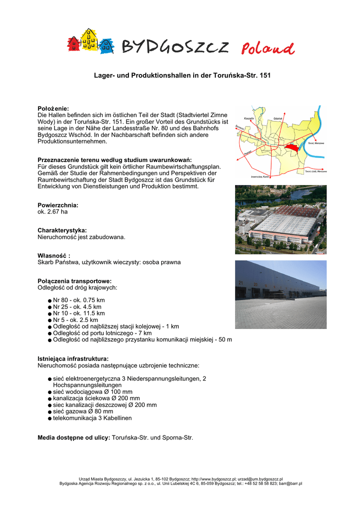Lager- und Produktionshallen in der Toruńska-Str. 151 Położenie: Die Hallen befinden sich im östlichen Teil der Stadt (Stadtviertel Zimne Wody) in der Toruńska-Str. 151. Ein großer Vorteil des Grundstücks ist seine Lage in der Nähe der Landesstraße Nr. 80 und des Bahnhofs Bydgoszcz Wschód. In der Nachbarschaft befinden sich andere Produktionsunternehmen. Przeznaczenie terenu według studium uwarunkowań: Für dieses Grundstück gilt kein örtlicher Raumbewirtschaftungsplan. Gemäß der Studie der Rahmenbedingungen und Perspektiven der Raumbewirtschaftung der Stadt Bydgoszcz ist das Grundstück für Entwicklung von Dienstleistungen und Produktion bestimmt. Powierzchnia: ok. 2.67 ha Charakterystyka: Nieruchomość jest zabudowana. Własność: Skarb Państwa, użytkownik wieczysty: osoba prawna Połączenia transportowe: Odległość od dróg krajowych: ● ● ● ● ● ● ● Nr 80 - ok. 0.75 km Nr 25 - ok. 4.5 km Nr 10 - ok. 11.5 km Nr 5 - ok. 2.5 km Odległość od najbliższej stacji kolejowej - 1 km Odległość od portu lotniczego - 7 km Odległość od najbliższego przystanku komunikacji miejskiej - 50 m Istniejąca infrastruktura: Nieruchomość posiada następnujące uzbrojenie techniczne: sieć elektroenergetyczna 3 Niederspannungsleitungen, 2 Hochspannungsleitungen ● sieć wodociągowa Ø 100 mm ● kanalizacja ściekowa Ø 200 mm ● siec kanalizacji deszczowej Ø 200 mm ● sieć gazowa Ø 80 mm ● telekomunikacja 3 Kabellinen ● Media dostępne od ulicy: Toruńska-Str. und Sporna-Str. Urząd Miasta Bydgoszczy, ul. Jezuicka 1, 85-102 Bydgoszcz; http://www.bydgoszcz.pl; [email protected] Bydgoska Agencja Rozwoju Regionalnego sp. z o.o., ul. Unii Lubelskiej 4C 6, 85-059 Bydgoszcz; tel.: +48 52 58 58 823; [email protected]