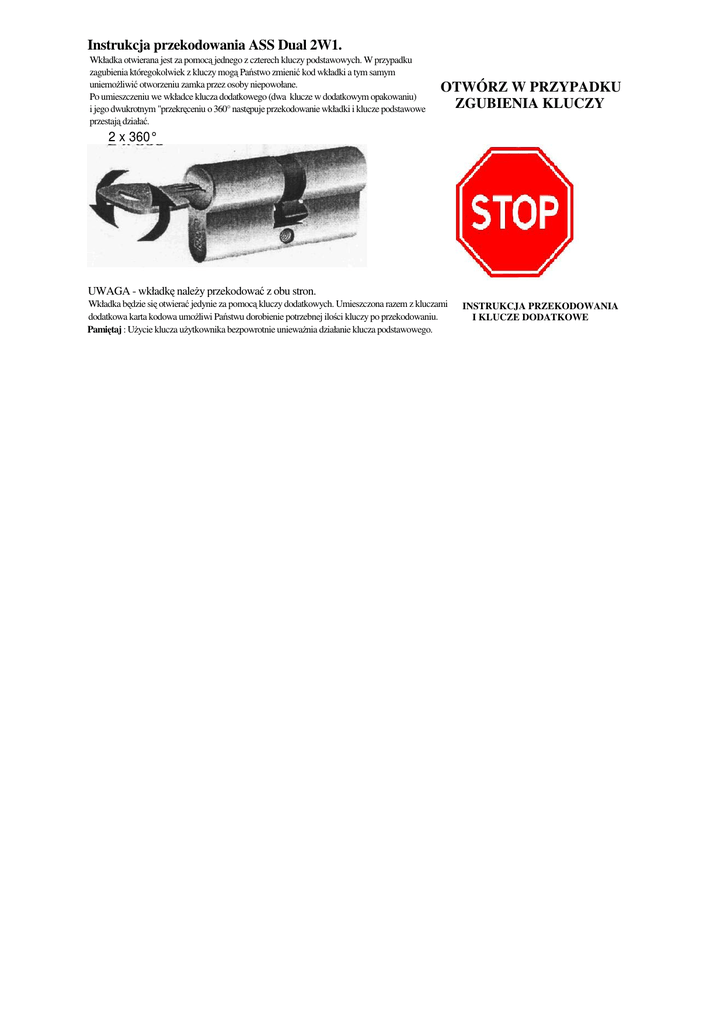 Instrukcja przekodowania ASS Dual 2W1. Wkładka otwierana jest za pomocą jednego z czterech kluczy podstawowych. W przypadku zagubienia któregokolwiek z kluczy mogą Państwo zmienić kod wkładki a tym samym uniemożliwić otworzeniu zamka przez osoby niepowołane. Po umieszczeniu we wkładce klucza dodatkowego (dwa klucze w dodatkowym opakowaniu) i jego dwukrotnym "przekręceniu o 360° następuje przekodowanie wkładki i klucze podstawowe przestają działać. OTWÓRZ W PRZYPADKU ZGUBIENIA KLUCZY 2 x 360° UWAGA - wkładkę należy przekodować z obu stron. Wkładka będzie się otwierać jedynie za pomocą kluczy dodatkowych. Umieszczona razem z kluczami dodatkowa karta kodowa umożliwi Państwu dorobienie potrzebnej ilości kluczy po przekodowaniu. Pamiętaj : Użycie klucza użytkownika bezpowrotnie unieważnia działanie klucza podstawowego. INSTRUKCJA PRZEKODOWANIA I KLUCZE DODATKOWE