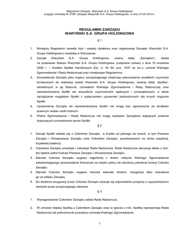 Regulamin Zarządu Waryński S.A. Grupa Holdingowa przyjęty Uchwałą Nr 3188 Zarządu Waryński S.A. Grupa Holdingowa w dniu 27.04.2015 r. REGULAMIN ZARZĄDU WARYŃSKI S.A. GRUPA HOLDINGOWA §1 1. Niniejszy Regulamin określa tryb i zasady działania oraz organizację Zarządu Waryński S.A. Grupa Holdingowa z siedzibą w Warszawie. 2. Zarząd Waryński S.A. Grupa Holdingowa, zwany dalej „Zarządem”, działa na podstawie Statutu Waryński S.A. Grupa Holdingowa, przepisów ustawy z dnia 15 września 2000 r. – Kodeks Spółek Handlowych (Dz. U. Nr 94, poz. 1037 ze zm.), uchwał Walnego Zgromadzenia i Rady Nadzorczej oraz niniejszego Regulaminu. 3. Kompetencje Zarządu jako organu zarządzającego obejmują wykonywanie wszelkich czynności koniecznych do realizacji zadań Waryński S.A. Grupa Holdingowa, zwanej dalej „Spółką”, określonych w jej Statucie, uchwałach Walnego Zgromadzenia i Rady Nadzorczej oraz reprezentowanie Spółki we wszystkich czynnościach sądowych i pozasądowych, a także zarządzanie majątkiem Spółki z wyłączeniem uprawnień zastrzeżonych dla innych organów Spółki. 4. Uprawnienia Zarządu do reprezentowania Spółki nie mogą być ograniczone ze skutkiem prawnym wobec osób trzecich. 5. Walne Zgromadzenie i Rada Nadzorcza nie mogą wydawać Zarządowi wiążących poleceń dotyczących prowadzenia spraw Spółki. §2 1. Zarząd Spółki składa się z Członków Zarządu w liczbie od jednego do trzech, w tym Prezesa Zarządu i Wiceprezesa Zarządu oraz Członków Zarządu, powoływanych na okres wspólnej, trzyletniej kadencji. 2. Członków Zarządu powołuje i odwołuje Rada Nadzorcza. Rada Nadzorcza decyduje także o tym, kto będzie pełnił funkcje Prezesa Zarządu i Wiceprezesa Zarządu. 3. Mandat Członka Zarządu wygasa najpóźniej z dniem odbycia Walnego Zgromadzenia zatwierdzającego sprawozdanie finansowe za ostatni pełny rok obrotowy pełnienia funkcji Członka Zarządu. 4. Mandat Członka Zarządu wygasa również wskutek śmierci, rezygnacji albo odwołania go ze składu Zarządu. 5. Do złożenia rezygnacji przez Członka Zarządu stosuje się odpowiednio przepisy o wypowiedzeniu zlecenia przez przyjmującego zlecenie. §3 1. Wynagrodzenie Członków Zarządu ustala Rada Nadzorcza. 2. W umowie między Spółką a Członkiem Zarządu oraz w sporze z nim, Spółkę reprezentuje Rada Nadzorcza lub pełnomocnik powołany uchwałą Walnego Zgromadzenia. 1 Regulamin Zarządu Waryński S.A. Grupa Holdingowa przyjęty Uchwałą Nr 3188 Zarządu Waryński S.A. Grupa Holdingowa w dniu 27.04.2015 r. §4 1. Bez zgody Rady Nadzorczej Członek Zarządu nie może zajmować się interesami konkurencyjnymi, ani tez uczestniczyć w spółce konkurencyjnej jako wspólnik spółki cywilnej, spółki osobowej lub jako członek organu spółki kapitałowej bądź uczestniczyć w innej konkurencyjnej osobie prawnej jako członek organu. Zakaz ten obejmuje także udział w konkurencyjnej spółce kapitałowej, w przypadku posiadania w niej przez Członka Zarządu co najmniej 10% udziałów albo akcji bądź prawa do powołania co najmniej jednego członka zarządu. 2. Wobec Członków Zarządu Waryński S.A. Grupa Holdingowa maja zastosowanie właściwe z obowiązujących w Spółce Zasad Ładu Korporacyjnego i Compliance MARS FIZ tj. : Członek zarządu spółek z grupy MARS FIZ powinien dawać rękojmię należytego wykonywania powierzonych jemu obowiązków. Osoba taka powinna posiadać odpowiednie kompetencje do pełnienia powierzonej funkcji oparte na zdobytej wiedzy i doświadczeniu, co weryfikowane powinno być przed powołaniem przez organ dokonujący wyboru oraz w ramach oceny okresowej obowiązującej w spółkach z grupy MARS FIZ, Skład zarządów spółek z grupy MARS FIZ powinien uwzględniać politykę różnorodności, w ramach której w organach kolegialnych powinny zasiadać osoby o różnych kompetencjach i obszarach doświadczenia. Polityka różnorodności powinna uwzględniać również równoprawny dostęp do pełnienia funkcji w organach spółek z grupy MARS FIZ przez przedstawicieli obojga płci, Pełnienie funkcji w organie zarządzającym powinno stanowić główny obszar aktywności zawodowej członka tego organu. Pozostała aktywność zawodowa nie może negatywnie wpłynąć na właściwe wykonywanie funkcji w spółce z grupy MARS FIZ, Członek organu zarządzającego powinien powstrzymywać się od podejmowania aktywności zawodowej lub pozazawodowej, która mogłaby prowadzić do powstawania konfliktu interesów lub wpływać negatywnie na jego reputację jako członka organu zarządzającego spółki z grupy MARS FIZ, Odpowiedzialność członków wieloosobowego zarządu jest kolegialna i występuje niezależnie od wprowadzenia wewnętrznego podziału odpowiedzialności za poszczególne obszary działalności spółki z grupy MARS FIZ pomiędzy członków organu zarządzającego lub delegowanie określonych uprawnień na niższe szczeble kierownicze, Członkowie zarządu podlegają corocznej ocenie przez radę nadzorczą, w szczególności w zakresie działań zmierzających do osiągnięcia celów wskazanych w strategii spółki. Przy 2 Regulamin Zarządu Waryński S.A. Grupa Holdingowa przyjęty Uchwałą Nr 3188 Zarządu Waryński S.A. Grupa Holdingowa w dniu 27.04.2015 r. sporządzaniu oceny, o której mowa w zdaniu poprzednim rada może skorzystać z pomocy zewnętrznego doradcy. §5 1. Do składania oświadczeń w imieniu Spółki uprawniony jest : a) w przypadku Zarządu jednoosobowego : Członek Zarządu samodzielnie; b) w przypadku Zarządu wieloosobowego : dwóch Członków Zarządu łącznie albo Członek Zarządu łącznie z prokurentem. 2. Członkowie Zarządu wykonują swoje obowiązki osobiście. 3. Postanowienia ust. 1 pkt a) i b) nie wyłączają ustanowienia prokury jednoosobowej lub łącznej i nie ograniczają praw prokurentów wynikających z przepisów o prokurze. 4. Prokura może być udziel