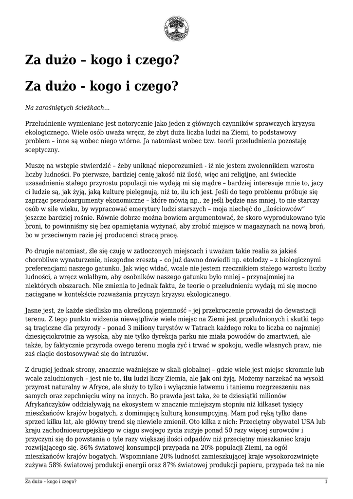 Za dużo – kogo i czego? Za dużo - kogo i czego? Na zarośniętych ścieżkach... Przeludnienie wymieniane jest notorycznie jako jeden z głównych czynników sprawczych kryzysu ekologicznego. Wiele osób uważa wręcz, że zbyt duża liczba ludzi na Ziemi, to podstawowy problem – inne są wobec niego wtórne. Ja natomiast wobec tzw. teorii przeludnienia pozostaję sceptyczny. Muszę na wstępie stwierdzić – żeby uniknąć nieporozumień - iż nie jestem zwolennikiem wzrostu liczby ludności. Po pierwsze, bardziej cenię jakość niż ilość, więc ani religijne, ani świeckie uzasadnienia stałego przyrostu populacji nie wydają mi się mądre – bardziej interesuje mnie to, jacy ci ludzie są, jak żyją, jaką kulturę pielęgnują, niż to, ilu ich jest. Jeśli do tego problemu próbuje się zaprząc pseudoargumenty ekonomiczne – które mówią np., że jeśli będzie nas mniej, to nie starczy osób w sile wieku, by wypracować emerytury ludzi starszych – moja niechęć do „ilościowców” jeszcze bardziej rośnie. Równie dobrze można bowiem argumentować, że skoro wyprodukowano tyle broni, to powinniśmy się bez opamiętania wyżynać, aby zrobić miejsce w magazynach na nową broń, bo w przeciwnym razie jej producenci stracą pracę. Po drugie natomiast, źle się czuję w zatłoczonych miejscach i uważam takie realia za jakieś chorobliwe wynaturzenie, niezgodne zresztą – co już dawno dowiedli np. etolodzy – z biologicznymi preferencjami naszego gatunku. Jak więc widać, wcale nie jestem rzecznikiem stałego wzrostu liczby ludności, a wręcz wolałbym, aby osobników naszego gatunku było mniej – przynajmniej na niektórych obszarach. Nie zmienia to jednak faktu, że teorie o przeludnieniu wydają mi się mocno naciągane w kontekście rozważania przyczyn kryzysu ekologicznego. Jasne jest, że każde siedlisko ma określoną pojemność – jej przekroczenie prowadzi do dewastacji terenu. Z tego punktu widzenia niewątpliwie wiele miejsc na Ziemi jest przeludnionych i skutki tego są tragiczne dla przyrody – ponad 3 miliony turystów w Tatrach każdego roku to liczba co najmniej dziesięciokrotnie za wysoka, aby nie tylko dyrekcja parku nie miała powodów do zmartwień, ale także, by faktycznie przyroda owego terenu mogła żyć i trwać w spokoju, wedle własnych praw, nie zaś ciągle dostosowywać się do intruzów. Z drugiej jednak strony, znacznie ważniejsze w skali globalnej – gdzie wiele jest miejsc skromnie lub wcale zaludnionych – jest nie to, ilu ludzi liczy Ziemia, ale jak oni żyją. Możemy narzekać na wysoki przyrost naturalny w Afryce, ale służy to tylko i wyłącznie łatwemu i taniemu rozgrzeszeniu nas samych oraz zepchnięciu winy na innych. Bo prawda jest taka, że te dziesiątki milionów Afrykańczyków oddziaływają na ekosystem w znacznie mniejszym stopniu niż kilkaset tysięcy mieszkańców krajów bogatych, z dominującą kulturą konsumpcyjną. Mam pod ręką tylko dane sprzed kilku lat, ale główny trend się niewiele zmienił. Oto kilka z nich: Przeciętny obywatel USA lub kraju zachodnioeuropejskiego w ciągu swojego życia zużyje ponad 50 razy więcej surowców i przyczyni się do powstania o tyle razy większej ilości odpadów niż przeciętny mieszkaniec kraju rozwijającego się. 86% światowej konsumpcji przypada na 20% populacji Ziemi, na ogół mieszkańców krajów bogatych. Wspomniane 20% ludności zamieszkującej kraje wysokorozwinięte zużywa 58% światowej produkcji energii oraz 87% światowej produkcji papieru, przypada też na nie Za dużo – kogo i czego? 1 87% światowej liczby samochodów. Kraje wysokorozwinięte, stanowiąc ok. 20% światowej populacji, wytwarzają 53% dwutlenku węgla. Co wynikłoby zatem z ewentualnego znacznego ograniczenia liczby ludności w ubogich krajach Afryki, Azji czy Ameryki Południowej? Niedużo – bo to nie oni najwięcej konsumują, a zatem „nacisk” na ziemski ekosystem zmniejszyłby się w niewielkim stopniu, jego skutki również. Inna rzecz, że demografowie już od dawna wiedzą, że ok. roku 2050 wzrost liczby ludności (współczynnik przyrostu naturalnego) osiągnie apogeum, a później światowa populacja zacznie maleć, choć oczywiście z wysokiego poziomu (prawdopodobnie nieco ponad 9 miliardów ludzi). Często pojawia się demagogiczny zarzut, że krytykując konsumpcję w taki właśnie sposób, odmawia się mieszkańcom ubogich krajów prawa do korzystania ze „zdobyczy cywilizacji”. To zarzut poważny i wyjątkowo podły, w domyśle zawiera bowiem sugestię, że ktoś chce, aby np. Afrykanie dalej umierali z głodu, z braku wody czy lekarstw, które to dobra mają zapewnione niemal wszyscy mieszkańcy „pierwszego świata”. Nie, tu chodzi o coś zupełnie innego – Ziemia chyba nie udźwignie cywilizacji, w której 6 czy 9 miliardów ludzi będzie miało po samochodzie, komputerze, telewizorze, domu i mnóstwie innych gadżetów – ale ta sama Ziemia nie udźwignie znacznie mniejszej, np. 3-miliardowej populacji, w której na osobę przypadną 2 samochody, 2 komputery, 2 telewizory itd. Oczywiście, jeśli miliard Chińczyków przesiądzie się z rowerów na samochody, to zniszczenie ekosystemu znacznie wzrośnie – ale to nie problem liczby Chińczyków, lecz presji ekonomiczno-kulturowej, która „skłania” ich do posiadania samochodu. O ile pożywienia, wody czy lekarstw nikt normalny nie będzie żałował umierającym Afrykanom, o tyle z pełną odpowiedzialnością mogę napisać, że żałuję Chińczykom zachodniego modelu konsumpcji spod znaku „jedna osoba, jeden samochód” – ale żałuję go także mieszkańcom państw zamożnych. Po prostu problem nie leży w przeludnieniu, lecz w tym, jak ogół mieszkańców globu żyje i do jakiego stanu posiadania i używania aspiruje. Taki wniosek jest jednak niemiły nie tylko dla zwolenników „rozwoju”, „postępu” i „wzrostu gospodarczego”, lecz rów
