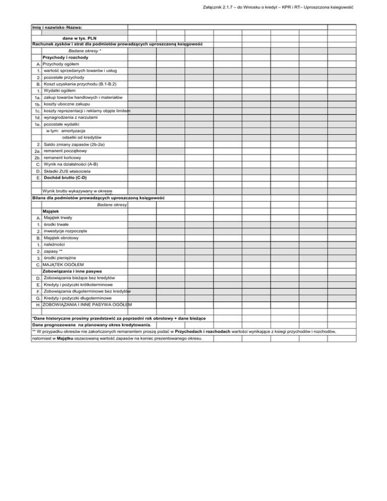 Załącznik 2.1.7 – do Wniosku o kredyt – KPR i RT– Uproszczona ksiegowość Imię i nazwisko /Nazwa: dane w tys. PLN Rachunek zysków i strat dla podmiotów prowadzących uproszczoną księgowość Badane okresy * Przychody i rozchody A. Przychody ogółem 1. wartość sprzedanych towarów i usług 2. pozostałe przychody B. Koszt uzyskania przychodu (B.1-B.2) 1. Wydatki ogółem 1a. zakup towarów handlowych i materiałów 1b. koszty uboczne zakupu 1c. koszty reprezentacji i reklamy objęte limitem 1d. wynagrodzenia z narzutami 1e. pozostałe wydatki: w tym: amortyzacja odsetki od kredytów 2. Saldo zmiany zapasów (2b-2a) 2a. remanent początkowy 2b. remanent końcowy C. Wynik na działalności (A-B) D. Składki ZUS właściciela E. Dochód brutto (C-D) Wynik brutto wykazywany w okresie (wg deklaracji podatkowej PIT) Bilans dla podmiotów prowadzących uproszczoną księgowość Badane okresy Majątek A. Majątek trwały 1. środki trwałe 2. inwestycje rozpoczęte B. Majątek obrotowy 1. należności 2. zapasy ** 3. środki pieniężne C. MAJĄTEK OGÓŁEM Zobowiązania i inne pasywa D. Zobowiązania bieżące bez kredytów E. Kredyty i pożyczki krótkoterminowe F. Zobowiązania długoterminowe bez kredytów G. Kredyty i pożyczki długoterminowe H. ZOBOWIĄZANIA I INNE PASYWA OGÓŁEM *Dane historyczne prosimy przedstawić za poprzedni rok obrotowy + dane bieżące Dane prognozowane na planowany okres kredytowania. ** W przypadku okresów nie zakończonych remanentem proszę podać w Przychodach i rozchodach wartości wynikające z ksiegi przychodów i rozchodów, natomiast w Majątku oszacowaną wartość zapasów na koniec prezentowanego okresu. 1 Załącznik 2.1.7 – do Wniosku o kredyt – KPR i RT– Uproszczona ksiegowość Komentarz Wnioskodawcy nt. sytuacji ekonomiczno-finansowej firmy, osiągniętego wyniku finansowego(informacja podawana fakultatywnie): Inne informacje Wnioskodawcy: data pieczęć i podpis Wnioskodawcy 2