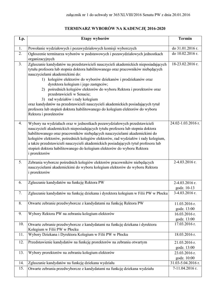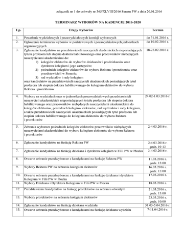 załącznik nr 1 do uchwały nr 365/XLVIII/2016 Senatu PW z dnia 20.01.2016 TERMINARZ WYBORÓW NA KADENCJĘ 2016-2020 Lp. 1. 2. 3. Etapy wyborów Powołanie wydziałowych i pozawydziałowych komisji wyborczych Ogłoszenie terminarza wyborów w podstawowych i pozawydziałowych jednostkach organizacyjnych Zgłaszanie kandydatów na przedstawicieli nauczycieli akademickich nieposiadających tytułu profesora lub stopnia doktora habilitowanego oraz pracowników niebędących nauczycielami akademickimi do: 1) kolegiów elektorów do wyborów dziekanów i prodziekanów oraz dyrektora kolegium i jego zastępców; 2) pośrednich kolegiów elektorów do wyboru Rektora i prorektorów oraz przedstawicieli w Senacie; 3) rad wydziałów i rady kolegium oraz kandydatów na przedstawicieli nauczycieli akademickich posiadających tytuł profesora lub stopień doktora habilitowanego do kolegium elektorów do wyboru Rektora i prorektorów Termin do 31.01.2016 r. do 10.02.2016 r. 18-23.02.2016 r. 4. Wybory na wydziałach oraz w jednostkach pozawydziałowych przedstawicieli nauczycieli akademickich nieposiadających tytułu profesora lub stopnia doktora habilitowanego oraz pracowników niebędących nauczycielami akademickimi do kolegiów elektorów, pośrednich kolegiów elektorów, rad wydziałów i rady kolegium, a także przedstawicieli nauczycieli akademickich posiadających tytuł profesora lub stopień doktora habilitowanego do kolegium elektorów do wyboru Rektora i prorektorów 5. Zebrania wyborcze pośrednich kolegiów elektorów pracowników niebędących nauczycielami akademickimi do wyboru kolegium elektorów do wyboru Rektora i prorektorów 2-4.03.2016 r. 6. Zgłaszanie kandydatów na funkcję Rektora PW 7. Zgłaszanie kandydatów na funkcję dziekana i dyrektora kolegium w Filii PW w Płocku 2-4.03.2016 r. godz. 10-13 3-4.03.2016 r. 8. Otwarte zebranie przedwyborcze z kandydatami na funkcję Rektora PW 9. Wybory Rektora PW na zebraniu kolegium elektorów 10. 11. Otwarte zebranie przedwyborcze z kandydatami na funkcję dziekana i dyrektora Kolegium w Filii PW w Płocku Wybory Dziekana i Dyrektora Kolegium w Filii PW w Płocku 12. Przedstawienie kandydatów na funkcję prorektorów na zebraniu otwartym 13. Wybory prorektorów na zebraniu kolegium elektorów 14. 15. Zgłaszanie kandydatów na funkcję dziekana wydziału Otwarte zebrania przedwyborcze z kandydatami na funkcję dziekana wydziału 24.02-1.03.2016 r. 11.03.2016 r. godz. 13:00 16.03.2016 r. godz. 13:00 17.03.2016 r. 18.03.2016 r. 21.03.2016 r. godz. 13:00 23.03.2016 r. godz. 10:00 31.03-5.04.2016 r. 7-11.04.2016 r. Etapy wyborów Lp. Termin 16. Wybory dziekanów na zebraniach kolegiów elektorów 14-19.04.2016 r. 17. Przedstawienie na zebraniach otwartych kandydatów na funkcję prodziekanów 20-26.04.2016 r. 18. Wybory prodziekanów na zebraniach kolegiów elektorów 20-26.04.2016 r. 19. Wybory na wydziałach do pośredniego kolegium elektorów do wyboru przedstawicieli w Senacie PW nauczycieli akademickich posiadających tytuł profesora lub stopień doktora habilitowanego 25-27.04.2016 r. 20. Wybory przedstawicieli do Senatu PW spośród nauczycieli akademickich posiadających tytuł naukowy profesora lub stopień naukowy doktora habilitowanego, nauczycieli akademickich nieposiadających tytułu profesora lub stopnia doktora habilitowanego oraz pracowników niebędących nauczycielami akademickimi Uczelni 21. Wybory do Rady Bibliotecznej 28.04.2016 r. do 31.05.2016 r.