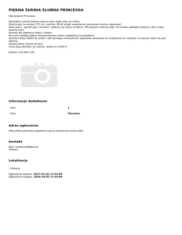 PIĘKNA ŚUKNIA ŚLUBNA PRINCESSA [Sprzedam] Princessa Sprzedam suknię ślubną szytą w lipcu tego roku na miarę. Suknia jest na wzrost 175 cm, rozmiar 38-42 dzięki wiązanemu gorsetowi można regulować. Góra sukni - gorset jest z koronki i pięknie się mieni w słońcu. Ma wszyte mseczki więc nie trzeba zakłądać bielizny. Dół z kilku warstw tiulu. Osobno do założenia halka z kołem. Do sukni dodaję piękny dwuwarstwowy welon ozdobiony kryształkami. Suknię trzeba oddać do pralni i dół wymaga minimalnych poprawek ponieważ od chodzenia tiul niestety na samym dole nie jest idealny. Suknię także można skrócić. Cena jaką płaciłam za suknię i welon to 2100 zł telefon: 510 822 233 Informacje dodatkowe Ilość 1 Stan Używany Adres ogłoszenia http://http.todoslubu.pl/piekna-suknia-slubna-princessa,o562 Kontakt Mail: [email protected] Telefon: Lokalizacja , - (Polska) Ogłoszenie dodano: 2017-01-02 17:43:09 Ogłoszenie wygasa: 2026-10-02 17:43:09 Powered by TCPDF (www.tcpdf.org)