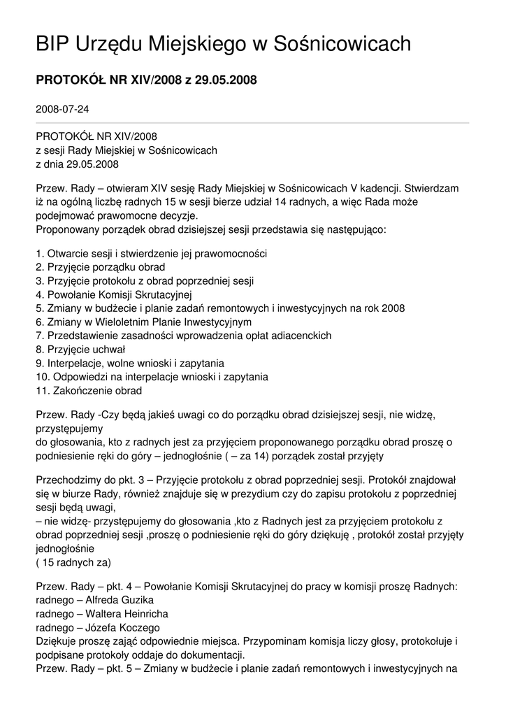 BIP Urzędu Miejskiego w Sośnicowicach PROTOKÓŁ NR XIV/2008 z 29.05.2008 2008-07-24 PROTOKÓŁ NR XIV/2008 z sesji Rady Miejskiej w Sośnicowicach z dnia 29.05.2008 Przew. Rady – otwieram XIV sesję Rady Miejskiej w Sośnicowicach V kadencji. Stwierdzam iż na ogólną liczbę radnych 15 w sesji bierze udział 14 radnych, a więc Rada może podejmować prawomocne decyzje. Proponowany porządek obrad dzisiejszej sesji przedstawia się następująco: 1. Otwarcie sesji i stwierdzenie jej prawomocności 2. Przyjęcie porządku obrad 3. Przyjęcie protokołu z obrad poprzedniej sesji 4. Powołanie Komisji Skrutacyjnej 5. Zmiany w budżecie i planie zadań remontowych i inwestycyjnych na rok 2008 6. Zmiany w Wieloletnim Planie Inwestycyjnym 7. Przedstawienie zasadności wprowadzenia opłat adiacenckich 8. Przyjęcie uchwał 9. Interpelacje, wolne wnioski i zapytania 10. Odpowiedzi na interpelacje wnioski i zapytania 11. Zakończenie obrad Przew. Rady -Czy będą jakieś uwagi co do porządku obrad dzisiejszej sesji, nie widzę, przystępujemy do głosowania, kto z radnych jest za przyjęciem proponowanego porządku obrad proszę o podniesienie ręki do góry – jednogłośnie ( – za 14) porządek został przyjęty Przechodzimy do pkt. 3 – Przyjęcie protokołu z obrad poprzedniej sesji. Protokół znajdował się w biurze Rady, również znajduje się w prezydium czy do zapisu protokołu z poprzedniej sesji będą uwagi, – nie widzę- przystępujemy do głosowania ,kto z Radnych jest za przyjęciem protokołu z obrad poprzedniej sesji ,proszę o podniesienie ręki do góry dziękuję , protokół został przyjęty jednogłośnie ( 15 radnych za) Przew. Rady – pkt. 4 – Powołanie Komisji Skrutacyjnej do pracy w komisji proszę Radnych: radnego – Alfreda Guzika radnego – Waltera Heinricha radnego – Józefa Koczego Dziękuje proszę zająć odpowiednie miejsca. Przypominam komisja liczy głosy, protokołuje i podpisane protokoły oddaje do dokumentacji. Przew. Rady – pkt. 5 – Zmiany w budżecie i planie zadań remontowych i inwestycyjnych na rok 2008 oraz pkt 6 Zmiany w Wieloletnim Planie Inwestycyjnym , o przedstawienie tych dwóch tematów Przewodnicząca Rada poprosiła Z-cy Burmistrza Joachimowi Skorupie Z-ca Burmistrza przedstawił zmiany w Wieloletnim Planie Inwestycyjnym , w planie zadań remontowych i inwestycyjnych na rok 2008 które zostały zapisane w załączniku nr 2 i 3 do uchwały w sprawie zmiany budżetu gminy Sośnicowice na rok 2008 Przew. Rady zapytała radnych czy mają pytania do Pana Burmistrza w związku z przedstawionymi zmianami, pytań nie było, poprosiła więc o zabranie głosu Pana Skarbnika Leszka Pietrasińskiego Skarbnik Leszek Pietrasiński stwierdził, iż przedłożony projekt uchwały w sprawie zmian w budżecie zawiera w sobie te elementy wynikające ze zmian wieloletniego planu inwestycyjnego w zakresie dotyczącym roku 2008 , zmiany wynikające ze zmian planu zadań inwestycyjnych i remontowych na rok bieżący jak również te decyzje o których wczoraj wspominałem, decyzje Pana Wojewody zmieniające wysokość dotacji dla gminy. Zawiera również pochodne tych uchwał które dzisiaj państwo będziecie jeszcze podejmować oraz pochodne wniosków , które zostały przegłosowane i przyjęte na komisjach, te wszystkie zagadnienia zostały już uwzględnione w projekcie uchwały w sprawie zmiany budżetu gminy Sośnicowice na rok 2008 przedłożonej radnym i Radzie. Przew. Rady zapytała radnych czy mają pytania do Pana Skarbnika , pytań nie było . Kolejny punkt porządku obrad to pkt. 7 – Przedstawienie zasadności wprowadzenia opłat adiacenckich , Przew. Rady udzieliła głosu Z-cy Burmistrza Z-ca Burmistrza Joachim Skorupa wyjaśnił czym są opłaty adiacenckie i czym się kierował Burmistrz przedkładając projekty uchwał dot. opłat adiacenckich,, mianowicie : mówiąc ogólnie opłata adiacencka to jest opłata od wzrostu wartości nieruchomości i w zależności w związku z czym ten wzrost wartości nieruchomości nastąpił takie są trzy rodzaje opłat adiacenckich. Z jedną w zasadzie nie ma większego problemu to jest opłata adiacencka w związku ze wzrostem wartości nieruchomości powstałej w wyniku scalenia. Procedura scalenia u nas w ostatnim czasie chyba nie była prowadzona, ale jest możliwa taka procedura i wtedy Rada przyjmie taką uchwałę i w tej uchwale obligatoryjnie określa jaka jest ta opłata adiacencka. To nas w zasadzie prawie nie dotyczy, ale może się taka sytuacja zdarzyć. Natomiast dwa pozostałe rodzaje opłat adiacenckich wiążą się również ze wzrostem wartości nieruchomości , dotyczącym wzrostu wartości nieruchomości wynikających z podziału nieruchomości i drugi rodzaj to opłata związana ze wzrostem wartości nieruchomości w związku z wybudowaniem elementów infrastruktury technicznej. Oczywiście istotnym tutaj czynnikiem decydującym o tym czy dana opłata adiacencka może być naliczana jest to z jakich środków urządzenia te zostały wybudowane, jeżeli one zostały wybudowane w całości albo w części ze środków gminnych , ze środków unijnych , ze środków z udziałem skarbu państwa wtedy ta opłata adiacencka może być naliczana. Żeby opłata ta mogła być naliczana musi być podjęta stosowana uchwała określająca wysokość procentu wzrostu wartości nieruchomości jaki może stanowić ta opłata. Dla podziału nieruchomości max. może stanowić 30 % dla infrastruktury to jest max. stawka 50 %. Wg. komentarzy nie może to być stawka zerowa i nie powinna to być również stawka, która powoduje że gmina ponosi z tego tytułu straty, tzn. gmina zleca wykonanie operatu który może ją kosztować więcej niż może wpłynąć z tego tytułu środków do budżetu. Gminy w Polsce dosyć niechętnie pobierają te opłaty , chociaż są takie gminy gdzie te opłaty funkcjonują już od wielu lat, i są również gminy gdzie te opłaty dopiero 