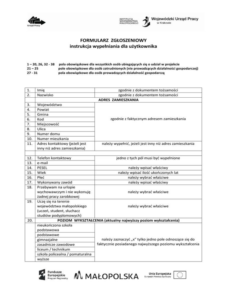 FORMULARZ ZGŁOSZENIOWY instrukcja wypełniania dla użytkownika 1 – 20, 26, 32 - 38 pola obowiązkowe dla wszystkich osób ubiegających się o udział w projekcie 21 – 25 pole obowiązkowe dla osób zatrudnionych (nie prowadzących działalności gospodarczej) 27 - 31 pola obowiązkowe dla osób prowadzących działalność gospodarczą 1. 2. Imię Nazwisko 3. 4. 5. 6. 7. 8. 9. 10. 11. Województwo Powiat Gmina Kod Miejscowość Ulica Numer domu Numer mieszkania Adres kontaktowy (jeżeli jest inny niż adres zamieszkania) 12. 13. 14. 15. 16. 17. 18. Telefon kontaktowy jedno z tych pól musi być wypełnione e-mail PESEL należy wpisać właściwy Wiek należy wpisać ilość ukończonych lat Płeć należy wybrać właściwe Wykonywany zawód należy wpisać właściwy Przebywam na urlopie wychowawczym i nie wykonuję należy wybrać właściwe żadnej pracy zarobkowej Uczę się na terenie województwa małopolskiego należy wybrać właściwe (uczeń, student, słuchacz studiów podyplomowych) POZIOM WYKSZTAŁCENIA (aktualny najwyższy poziom wykształcenia) nieukończona szkoła podstawowa podstawowe należy zaznaczyć „x” tylko jedno pole odnoszące się do gimnazjalne faktycznie posiadanego najwyższego poziomu wykształcenia zasadnicze zawodowe liceum / technikum szkoła policealna / pomaturalna wyższe 19. 20. zgodnie z dokumentem tożsamości zgodnie z dokumentem tożsamości ADRES ZAMIESZKANIA zgodnie z faktycznym adresem zamieszkania należy wypełnić, jeżeli jest inny niż adres zamieszkania 21. 22. 23. 24. 25. 26. 27. 28. 29. 30 31. 32. 33. 34. 35. 36. 37. 38. ZATRUDNIENIE Pracuję na terenie województwa małopolskiego należy wybrać właściwe Jestem osobą zatrudnioną (praca na umowę o pracę, umowę zlecenie, umowę o należy wybrać właściwe dzieło, na podstawie powołania, wyboru, mianowania lub spółdzielczej umowy o pracę) w należy wybrać właściwe należy wpisać właściwą Nazwa zakładu pracy należy wpisać właściwy Adres zakładu pracy Prowadzę działalność należy wybrać właściwe gospodarczą DANE DOT. PROWADZONEJ DZIAŁALNOŚCI (zgodne z wpisem do CEIDG) Zatrudniam pracowników należy wybrać właściwe (w jakiejkolwiek formie) należy wpisać właściwą Nazwa firmy należy wpisać właściwy Adres firmy należy wpisać właściwy NIP Czy działalność jest wykonywana na terenie należy wybrać właściwe województwa małopolskiego? INFORMACJE DODATKOWE osoba należąca do mniejszości narodowej lub etnicznej, należy wybrać właściwe migrant, osoba obcego pochodzenia¹ osoba bezdomna lub dotknięta wykluczeniem z dostępu do należy wybrać właściwe mieszkań² należy wybrać właściwe osoba z niepełnosprawnościami³ osoba przebywająca w gospodarstwie domowym bez osób należy wybrać właściwe (uwzględniając także sytuację pracujących własną) w tym – w gospodarstwie domowym z dziećmi pozostającymi na utrzymaniu należy wybrać właściwe osoba żyjąca w gospodarstwie składającym się z jednej osoby dorosłej i dzieci pozostających na utrzymaniu należy wybrać właściwe należy wybrać właściwe osoba w innej niekorzystnej sytuacji społecznej Oświadczam, że wszystkie informacje zawarte w niniejszym formularzu zgłoszeniowym są zgodne z prawdą. ………………………………………… Data , czytelny podpis (odręcznie, na wydrukowanym formularzu) ¹ Zgodnie z prawem krajowym mniejszości narodowe to mniejszość: białoruska, czeska, litewska, niemiecka, ormiańska, rosyjska, słowacka, ukraińska, żydowska. Mniejszości etniczne: karaimska, łemkowska, romska, tatarska. Osoby obcego pochodzenia to cudzoziemcy - każda osoba, która nie posiada polskiego obywatelstwa, bez względu na fakt posiadania lub nie obywatelstwa (obywatelstw) innych krajów lub osoba, której co najmniej jeden z rodziców urodził się poza terenem Polski. ² Bezdomność lub ekstremalne formy wykluczenia mieszkaniowego obejmują: osoby żyjące w surowych i alarmujących warunkach osoby przebywające w schroniskach dla bezdomnych, w schroniskach dla kobiet, schroniskach dla imigrantów, osoby opuszczające instytucje penitencjarne/karne, instytucje opiekuńcze, osoby otrzymujące długookresowe wsparcie z powodu bezdomności - specjalistyczne zakwaterowanie wspierane) osoby posiadające niepewny najem z nakazem eksmisji, osoby zagrożone przemocą konstrukcje tymczasowe, mieszkania substandardowe - lokale nienadające się do zamieszkania wg standardu krajowego, skrajne przeludnienie. ³ Za osoby niepełnosprawne uznaje się osoby niepełnosprawne w świetle przepisów ustawy z dnia 27 sierpnia 1997 r. o rehabilitacji zawodowej i społecznej oraz zatrudnieniu osób niepełnosprawnych (Dz.U. 1997 nr 123 poz. 776), a także osoby z zaburzeniami psychicznymi, o których mowa w ustawie z dnia 19 sierpnia 1994 r. o ochronie zdrowia psychicznego (Dz. U. 1994 nr 111, poz. 535), tj. osoby z odpowiednim orzeczeniem lub innym dokumentem poświadczającym stan zdrowia. Gospodarstwo domowe, w którym żaden członek nie pracuje. Wszyscy członkowie gospodarstwa domowego są albo bezrobotni albo bierni zawodowo. Gospodarstwo domowe to jednostka (ekonomiczna, społeczna): posiadająca wspólne zobowiązania dzieląca wydatki domowe lub codzienne potrzeby wspólnie zamieszkująca. Gospodarstwo domowe to zarówno osoba zamieszkująca samotnie, jak również grupa ludzi (niekoniecznie spokrewniona) mieszkająca pod tym samym adresem wspólnie prowadząca dom np. mająca przynajmniej jeden wspólny posiłek dziennie lub wspólny pokój dzienny. Dotyczy osób zagrożonych wykluczeniem społecznym, znajdujących się w innej niekorzystnej sytuacji niż wymienione powyżej.