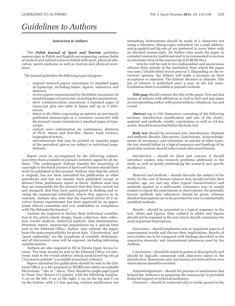 GUIDELINES TO AUTHORS Pol. J. Sport Tourism 2013, 20, 235-238 235 Guidelines to Authors Instruction to Authors The Polish Journal of Sport and Tourism publishes manuscripts in Polish and English encompassing various fields of medical and natural sciences linked with sport, physical education, sports medicine as well as tourism and physical recreation. The journal publishes the following types of papers: - - original research papers (maximum 12 standard pages of typescript, including tables, figures, references and abstract), review papers commissioned by the Editor (maximum 20 standard pages of typescript, including documentation), short communications (maximum 3 standard pages of typescript plus one table or figure and up to 5 references), letters to the Editor expressing an opinion on previously published manuscripts or a comment connected with the journal's issues (maximum 2 standard pages of typescript), current news (information on conferences, abstracts of Ph.D. theses and Post-Doc. theses, book reviews, biographical notes), advertisements that may be printed on separate pages of the periodical (prices are subject to individual negotiations). Papers must be accompanied by the following submission letter (form available at journal's website), signed by all Authors: “The undersigned Authors transfer the ownership of copyright to the Polish Journal of Sport and Tourism should their work be published in this journal. Authors state that the article is original, has not been submitted for publication in other periodicals and has not already been published except in abstract form, preliminary report or thesis. Authors state that they are responsible for the research that they have carried out and designed; that they have participated in drafting and revising the manuscript submitted, which they approve in its contents. Authors also state that the reported article (if it involves human experiments) has been approved by an appropriate ethical committee and was undertaken in compliance with The Helsinki Declaration”. Authors are required to declare their individual contribution to the article (study design, funds collection, data collection, results analysis, statistical analysis, data interpretation, literature search, manuscript preparation) on a special form sent to the Editorial Office. Author, who submits the paper, bears the main responsibility for given data. “Ghostwriting” and “guest authorship” are the symptoms of scientific dishonesty, and all discovered cases will be exposed, including informing suitable entities. Authors are also required to fill in Versita Open Access License. The form should be sent to the Editorial Office via electronic mail to the e-mail address: [email protected] (“License to publish” is available at journal's website). Papers submitted for publication should be sent to the Editorial Office as a file prepared in WORD text editor (acceptable file formats: *.doc or *.docx). They should be single-page typed in Times New Roman (12 points), with the following margins: 3 cm on the left, 2 cm on the right, 2 cm on the top and 2 cm on the bottom, with 1.5 line spacing, without justification nor formatting. Indentations should be made of 3 characters not using a tabulator. Manuscripts submitted via e-mail address: [email protected] are preferred (a cover letter with an attached manuscript). An Author who sends the paper in a printed version by traditional mail is recommended to enclose an electronic form of the manuscript (CD-ROM disc). Articles will be sent to two independent and anonymous referees from outside of the institution from which the paper was sent (“double-blind review process”). Depending on the reviewers' opinion, the Editors will make a decision on their acceptance or rejection. The Editors' decision is ultimate. The list of referees is published once a year, in the last issue. Evaluation sheet is available at journal's website. Title page should contain the title of the paper, first and last names of authors with affiliation as well as first and last name of corresponding author with postal address, telephone, fax and e-mail. Abstract (up to 250 characters) consisting of the following sections: introduction (justification and aim of the study), material and methods, results, conclusions as well as 3-6 key words, should be provided before the body text. Body text should be sectioned into: Introduction, Material and methods, Results, Discussion, Conclusions, Acknowledgements (if necessary), and Literature. In articles of other types, the text should follow in a logical sequence and headings of its particular sections should reflect issues discussed therein. Introduction – should be short and concise; it should introduce readers into research problems addressed in the study as well as justify undertaking the research and specify its objective. Material and methods – should describe the subject of the study (in the case of human subjects data should include their number, age, sex and any other typical characteristics) and methods applied in a sufficiently exhaustive way to enable readers to repeat the experiments or observations. For generally known methods only references should be given, whereas detailed descriptions are to be provided for new or substantially modified methods. Results – should be presented in a logical sequence in the text, tables and figures. Data collated in tables and figures should not be repeated in the text which should summarize the most important observations. Discussion – should emphasize new or important aspects of experimental results and discuss their implications. Results of own studies are to be compared with findings described in the respective domestic and international references used by the Authors. Conclusions – should be stated in points or descriptively and should be logically connected with objectives stated in the Introduction. Statements and conclusions not derived from own observa