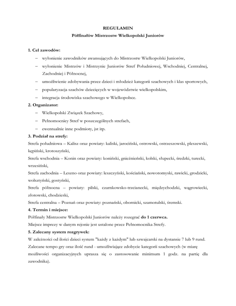 REGULAMIN Półfinałów Mistrzostw Wielkopolski Juniorów 1. Cel zawodów: wyłonienie zawodników awansujących do Mistrzostw Wielkopolski Juniorów, wyłonienie Mistrzów i Mistrzynie Juniorów Stref Południowej, Wschodniej, Centralnej, Zachodniej i Północnej, umożliwienie zdobywania przez dzieci i młodzież kategorii szachowych i klas sportowych, popularyzacja szachów dziecięcych w województwie wielkopolskim, integracja środowiska szachowego w Wielkopolsce. 2. Organizator: Wielkopolski Związek Szachowy, Pełnomocnicy Stref w poszczególnych strefach, ewentualnie inne podmioty, jst itp. 3. Podział na strefy: Strefa południowa – Kalisz oraz powiaty: kaliski, jarociński, ostrowski, ostrzeszowski, pleszewski, kępiński, krotoszyński, Strefa wschodnia – Konin oraz powiaty: koniński, gnieźnieński, kolski, słupecki, średzki, turecki, wrzesiński, Strefa zachodnia – Leszno oraz powiaty: leszczyński, kościański, nowotomyski, rawicki, grodzicki, wolsztyński, gostyński, Strefa północna – powiaty: pilski, czarnkowsko-trzcianecki, międzychodzki, wągrowiecki, złotowski, chodzieski, Strefa centralna – Poznań oraz powiaty: poznański, obornicki, szamotulski, śremski. 4. Termin i miejsce: Półfinały Mistrzostw Wielkopolski Juniorów należy rozegrać do 1 czerwca. Miejsce imprezy w danym rejonie jest ustalone przez Pełnomocnika Strefy. 5. Zalecany system rozgrywek: W zależności od ilości dzieci system "każdy z każdym" lub szwajcarski na dystansie 7 lub 9 rund. Zalecane tempo gry oraz ilość rund - umożliwiające zdobycie kategorii szachowych (w miarę możliwości organizacyjnych uprasza się o zastosowanie minimum 1 godz. na partię dla zawodnika). Łączenie grup w przypadku małej liczby startujących w danej grupie nie jest zalecane, niemniej, jeżeli w danej grupie wystartuje od 1-3 zawodników grupę można połączyć z najbliższą inną grupą wiekową z zachowaniem oddzielnej klasyfikacji. Turniej odbędzie się w następujących kategoriach wiekowych, oddzielnie dla dziewcząt i chłopców: C9 D9, C11 D11, C13 D13, C15 D15, C18 D18. Zawodnicy nie posiadający uprawnień do startu bezpośrednio w Mistrzostwach Wielkopolski Juniorów nie mają prawa startować w kategorii innej niż to wynika z ich daty urodzenia. Zgodnie z Regulaminem Mistrzostw Międzywojewódzkich (Strefowych), Mistrzostwa Wielkopolski nie stanowią turnieju klasyfikacyjnego do tychże Mistrzostw, i tym samym do Mistrzostw Polski Juniorów. 6. Uczestnictwo Prawo uczestnictwa w zawodach mają zarówno zawodnicy zrzeszeni w klubach deklarujących przynależność do Wielkopolskiego Związku Szachowego (zarówno z klubów posiadających osobowość prawną, jak i nie posiadających), jak i zawodnicy nie zrzeszeni, którzy zgłoszą się do zawodów w wyznaczonym terminie, opłacą wpisowe i spełniają kryteria wiekowe. Kategorie szachowe, zdobyte przez zawodników nie zrzeszonych, pozostają w zawieszeniu do czasu uzyskania przez nich przynależności klubowej. 7. Wpisowe Wysokość wpisowego do Półfinałów Mistrzostw Wielkopolski Juniorów jest ustalana przez pełnomocników WZSzach, nie może jednak przekraczać 20 zł. Sposób wpłacania wpisowego określa pełnomocnik strefy. Wpisowe w całości przeznaczone jest na fundusz nagród oraz na koszty organizacyjne. 8. Nagrody i wyróżnienia Zawodnicy zajmujący miejsca 1-6 w każdej grupie wiekowej uzyskują awans do Finałów Mistrzostw Wielkopolski Juniorów, w przypadku startu w danej grupie minimum 16 zawodników awans uzyskują zawodnicy zajmujący miejsca 1-8. Zawodnicy posiadający bezpośrednie prawo startu w Mistrzostwach Wielkopolski Juniorów (finaliści Mistrzostw Polski Juniorów z roku poprzedniego oraz zawodnicy z kategoriami centralnymi lub Elo minimum 2000) nie blokują miejsc awansujących. W grupie najstarszej (1998-2000) zawodnicy z rocznika 1998 nie blokują miejsc awansujących, natomiast awans uzyskują pod warunkiem zajęcia miejsca 1-6 lub 1-8 (w zależności od liczby zawodników w grupie). Zawodnicy zajmujący miejsca I-III otrzymują medale i dyplomy. Organizator może ufundować nagrody rzeczowe w zależności od możliwości finansowych. 9. Sędziowanie Sędziami zawodów mogą być tylko sędziowie posiadający aktualną licencję sędziowską, delegowani przez Kolegium Sędziów WZSzach na wniosek Pełnomocnika Strefy. Od decyzji Sędziego Rundowego można odwołać się do Sędziego Głównego. Podczas zawodów decyzja Sędziego Głównego jest nieodwołalna. Ewentualne odwołania można składać w terminie do 3 dni po zawodach na ręce Przewodniczącego Kolegium Sędziów WZSzach z odpisem do Wiceprezesa WZSzach ds. Młodzieży i Szkolenia oraz Przewodniczącego Komisji Młodzieżowej. 10. Koszty Koszty organizacyjne pokrywają organizatorzy. Koszty uczestnictwa pokrywają zawodnicy bądź delegujące ich kluby. 11. Uwagi końcowe Do startu w Półfinałach Mistrzostw Wielkopolski Juniorów nie jest wymagane posiadanie licencji szachowej. W uzasadnionych wypadkach Pełnomocnik Strefy, klub lub zawodnik może się zwrócić do Zarządu WZSzach o dopuszczenie do Finałów Mistrzostw Wielkopolski zawodników zajmujących wysokie, nie awansujące miejsca w Półfinałach. Wniosek należy złożyć za pośrednictwem Wiceprezesa ds. Młodzieży i Szkolenia. Zawodnik nie startujący w Półfinałach może być dopuszczony do Finału Mistrzostw Wielkopolski jedynie w przypadku choroby bądź innych udokumentowanych ważnych przyczyn rodzinnych, zgłaszając pisemne usprawiedliwienie do Wiceprezesa ds. Młodzieży i Szkolenia oraz Przewodniczącego Komisji Młodzieżowej najpóźniej w dniu rozpoczęcia Półfinałów MWJ. Opiekę wychowawczą mają obowiązek sprawować rodzice względnie opiekunowie klubowi. Do turnieju nie zostaną przyjęci zawodnicy bez opiekuna. Za zdolność zdrowotną oraz ubezpieczenie zawodnika odpowiedzialny jest zawodnik, klub lub rodzice. Zawodnik, który odda par