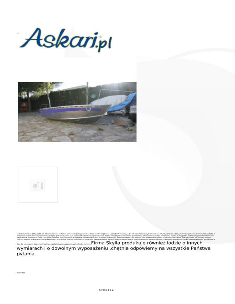 Łodzie aluminiowe SKYLLA 360 cm. Wyprodukowane w Polsce o niepowtarzalnej jakości. Łódki są w całości spawane ( ponad 100 m spawu ). Do ich produkcji nie użyto ani jednego nitu.Wykonane z blachy aluminiowej (marine aluminium)o grubości 3 mm (łodzie innych firm nie przekraczają z regóły grubości 1,7mm) są w tej klasie bezkonkurencyjne w europie .Łodzie firmy Skylla to prawdziwa ręczna robota.Okres oczekiwania po zamówieniu wynosi ok.2 tygodnie.Łodzie były przez nas testowane dwókrotnie w Hiszpanii na rzece Ebro gdzie kamienne dno i uzbrojona w naprawdę ostre kamienie linia brzegowa powodują u wędkarzy i włascicieli wypożyczalni poważne bóle głowy . Używaliśmy łodzi które pływają już tam bez przerwy od roku . Podczas oględzin zewnętrznych nie stwierdziliśmy praktycznie żadnych uszkodzeń co biorąc pod uwagę tamtejsze warunki świadczy bezsprzecznie o jakości produktu,do tego dochodzi rewelacyjna sterowność i żadko spotykana łatwość wchodzenia w Firma Skylla produkuje również łodzie o innych wymiarach i o dowolnym wyposażeniu ,chętnie odpowiemy na wszystkie Państwa pytania. ślizg .Po zakończeniu obszernych testów mogę Państwu zdecydowanie polecić łodze tej firmy. Model 360 Strona 1 z 2 długość 3,60 m szerokość 1,75 m waga 120 kg max. ilość osób – 4 max. ładowność 350 kg max. Moc silnika 13,4 kW Strona 2 z 2