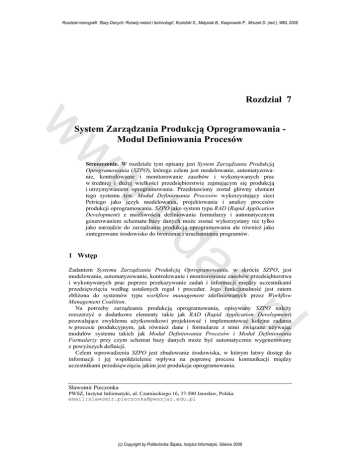 Rozdział monografii: 'Bazy Danych: Rozwój metod i technologii', Kozielski S., Małysiak B., Kasprowski P., Mrozek D. (red.), WKŁ 2008 Rozdział 7 w System Zarządzania Produkcją Oprogramowania Moduł Definiowania Procesów w da .b w Streszczenie. W rozdziale tym opisany jest System Zarządzania Produkcją Oprogramowania (SZPO), którego celem jest modelowanie, automatyzowanie, kontrolowanie i monitorowanie zasobów i wykonywanych prac w średniej i dużej wielkości przedsiębiorstwie zajmującym się produkcją i utrzymywaniem oprogramowania. Przedstawiony został główny element tego systemu tzw. Moduł Definiowania Procesów wykorzystujący sieci Petriego jako język modelowania, projektowania i analizy procesów produkcji oprogramowania. SZPO jako system typu RAD (Rapid Application Development) z możliwością definiowania formularzy i automatycznym generowaniem schematu bazy danych może zostać wykorzystany nie tylko jako narzędzie do zarządzania produkcją oprogramowania ale również jako zintegrowane środowisko do tworzenia i uruchamiania programów. 1 Wstęp pl s. Zadaniem Systemu Zarządzania Produkcją Oprogramowania, w skrócie SZPO, jest modelowanie, automatyzowanie, kontrolowanie i monitorowanie zasobów przedsiębiorstwa i wykonywanych prac poprzez przekazywanie zadań i informacji między uczestnikami przedsięwzięcia według ustalonych reguł i procedur. Jego funkcjonalność jest zatem zbliżona do systemów typu workflow management zdefiniowanych przez Workflow Management Coalition. Na potrzeby zarządzania produkcją oprogramowania, opisywany SZPO należy rozszerzyć o dodatkowe elementy takie jak RAD (Rapid Application Development) pozwalające zwykłemu użytkownikowi projektować i implementować kolejne zadania w procesie produkcyjnym, jak również dane i formularze z nimi związane używając modułów systemu takich jak Moduł Definiowania Procesów i Moduł Definiowania Formularzy przy czym schemat bazy danych może być automatycznie wygenerowany z powyższych definicji. Celem wprowadzenia SZPO jest zbudowanie środowiska, w którym łatwy dostęp do informacji i jej współdzielenie wpływa na poprawę procesu komunikacji między uczestnikami przedsięwzięcia jakim jest produkcja oprogramowania. Sławomir Pieczonka PWSZ, Instytut Informatyki, ul. Czarnieckiego 16, 37-500 Jarosław, Polska email:[email protected] (c) Copyright by Politechnika Śląska, Instytut Informatyki, Gliwice 2008 Rozdział monografii: 'Bazy Danych: Rozwój metod i technologii', Kozielski S., Małysiak B., Kasprowski P., Mrozek D. (red.), WKŁ 2008 S. Pieczonka w W niniejszym rozdziale uwaga skupiona jest na Module Definiowania Procesów (MDP) najważniejszym elemencie SZPO służącym modelowaniu, projektowaniu i tworzeniu procesów produkcji i opisującym reguły wykonywania zadań. Jako język opisu procesu wykorzystane są sieci Petriego. Klasyczne sieci Petriego zostały zaproponowane w latach 60-tych przez C. A. Petriego ([1]). Od tego czasu zostały użyte między innymi do modelowania i analizowania różnego rodzaju procesów takich jak protokoły komunikacyjne, sprzęt, systemy wbudowane, systemy przemysłowe, systemy biznesowe. W ostatnich 30 latach klasyczne sieci Petriego zostały rozszerzone tworząc nowe klasy sieci kolorowanych, z czasem, hierarchicznych, logicznych. Rozszerzenia te miały ogromne znaczenie szczególnie dla bardzo złożonych systemów, w których takie czynniki jak dane i czas odgrywały istotną rolę. Z wielu względów, które zdecydowały o wyborze sieci Petriego jako języka opisu procesów w Module Definiowania Procesów, najważniejsze to: 1) Graficzna reprezentacja. Jako język graficzny jest intuicyjny i prosty w użyciu oraz zrozumiały dla końcowych użytkowników. 2) Formalny opis. Proces zarządzania produkcją oprogramowania ma dokładną definicję gdyż sieci Petriego zdefiniowane są w formalny sposób. 3) Rozszerzalność i elastyczność. Możliwość modelowania wszystkich podstawowych procesów typu workflow. Wszystkie konstrukcje nowoczesnych systemów zarządzania mogą być przedstawione w postaci sieci Petriego. 4) Analiza. Możliwość użycia wielu technik w analizie właściwości procesu jakie dostarczają sieci Petriego pozwala sprawdzić czas oczekiwania i odpowiedzi, czy sieć jest bezpieczna, czy nie występują w niej zakleszczenia (deadlocks). da .b w w 2 Struktura SZPO pl s. Struktura systemu SZPO została zaprojektowana w sposób umożliwiający w krótkim czasie, bez angażowania zespołów programistów, tworzenie rozwiązań programowych ukierunkowanych na potrzeby procesu produkcyjnego, jednocześnie zmniejszając zasoby potrzebne na wsparcie techniczne jakiego wymagają tradycyjne systemy. SZPO jako system zaprojektowany dla przedsiębiorstw tworzących oprogramowanie musi spełniać ich wymagania co do funkcjonalności, które można ogólnie opisać jako: 1) Zarządzanie projektami. 2) Zarządzanie procesami biznesowymi. 3) Możliwość modyfikacji procesu, danych i interfejsu użytkownika. 4) Bezpieczny dostęp do wybranych elementów systemu z urządzeń mobilnych. 5) Definiowanie i zarządzanie procesami produkcyjnymi poprzez: a) definiowanie zadań i stanów oraz połączeń między nimi, b) możliwość modyfikacji procesu, danych i interfejsu użytkownika, c) definiowanie danych procesów i reguł biznesowych. 6) Współbieżne wykonywanie zadań i procesów. 7) Wsparcie dla zadań manualnych i automatycznych opartych na regułach. 8) Wsparcie dla podprocesów. 9) Wsparcie dla obsługi sytuacji wyjątkowych (eskalacja, przerwanie, powiadomienie). 10) Algorytm przydziału wykonawcy oparty na rolach i umiejętnościach. 11) Lista zadań użytkownika. 12) Zarządzanie i wyświetlanie listy zadań. 13) Definicja struktury przedsiębiorstwa. 92 (c) Copyright by Politechnika Śląska, Instytut Informatyki, Gliwice 2008 Rozdział monografii: 'Bazy Danych: Rozwój metod i technologii', Kozielski S.,