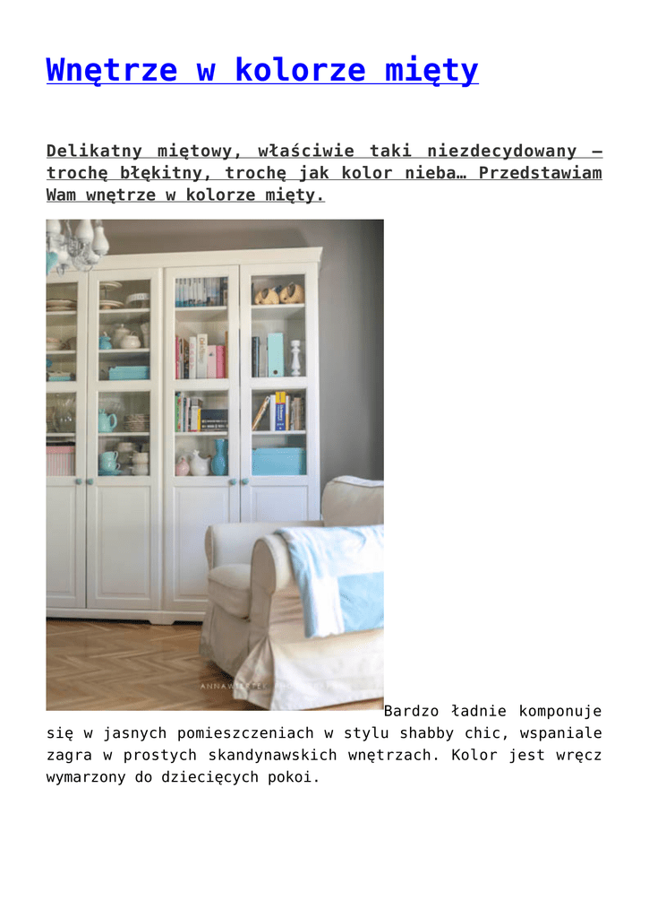 Wnętrze w kolorze mięty Delikatny miętowy, właściwie taki niezdecydowany – trochę błękitny, trochę jak kolor nieba… Przedstawiam Wam wnętrze w kolorze mięty. Bardzo ładnie komponuje się w jasnych pomieszczeniach w stylu shabby chic, wspaniale zagra w prostych skandynawskich wnętrzach. Kolor jest wręcz wymarzony do dziecięcych pokoi. salon w kolorze mięty Ważne, aby nie przesadzić z ilością kolorowych elementów – ja zaczęłam od zasłon i poduszek, a następnie stopniowo dodałam kilka miętowych drobiazgów. miętowe poszewki na poduszki biel kocha miętę miętowe poszewki na poduszki samodzielnie wykonany patchworkowy pled Nie udało mi się znaleźć koca w miętowym kolorze, z resztek zasłon dzianiny typu „frotte” uszyłam więc swój pierwszy patchworkowy pled. ceramiczne miętowe serca Ceramiczne miętowe serduszka kupione na Allegro ceramiczne gałki do mebli w kolorze mięty Ceramiczne serduszkowe gałki do mebli okazały się strzałem w dziesiątkę! Kilka kolorystycznych drobiazgów za szybą wzmacnia efekt i doskonale komponuje się z miętowymi tekstyliami. miętowy abażur do lampy Nie znalazłam także miętowego abażuru, więc akrylową niezmywalną farbą pomalowałam najzwyklejszy biały klosz z Ikei. Miętowy lubi sąsiedztwo błękitu, a wnętrze dzięki temu nie jest monotonne. Najważniejsze, że wszyscy domownicy czują się dobrze w „miętowym’ wnętrzu
