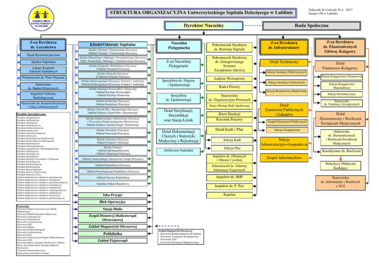 Załącznik do Uchwały Nr L /2017 Senatu UM w Lublinie STRUKTURA ORGANIZACYJNA Uniwersyteckiego Szpitala Dziecięcego w Lublinie Rada Społeczna Dyrektor Naczelny Z-ca Dyrektora ds. Lecznictwa Dział Krwiolecznictwa Apteka Szpitalna Lekarz Kontroli Zakażeń Szpitalnych Pełnomocnik ds. Praw Pacjenta Stanowisko ds. Badań Klinicznych Inspektor Ochrony Radiologicznej Stanowisko ds. Kontroli Rozliczeń Usług Laboratoryjnych Poradnie Specjalistyczne: -Poradnia Alergologiczna -Poradnia Audiologiczna -Poradnia Chirurgiczna -Poradnia Diabetologiczna -Poradnia Endokrynologiczna -Poradnia Foniatryczna -Poradnia Gastroenterologiczna -Poradnia Genetyczna -Poradnia Ginekologiczna dla Dziewcząt -Poradnia Hematologiczno-Onkologiczna -Poradnia Kardiologiczna -Poradnia Otolaryngologiczna -Poradnia Logopedyczna i Surdologopedyczna -Poradnia Nefrologiczna -Poradnia Neurologiczna -Poradnia Ortopedyczna -Poradnia Patologii Noworodków i Niemowląt -Poradnia Psychologiczna -Poradnia Pulmonologiczna -Poradnia Rehabilitacyjna -Poradnia Reumatologiczna -Poradnia Zdrowia Psychicznego -Poradnia Medycyny Pracy -Gabinet diagnostyczno-zabiegowy alergologiczny -Gabinet diagnostyczno-zabiegowy chirurgiczny -Gabinet diagnostyczno-zabiegowy gastroenterologiczny -Gabinet diagnostyczno-zabiegowy neurologiczny -Gabinet diagnostyczno-zabiegowy ortopedyczny -Gabinet diagnostyczno-zabiegowy otolaryngologiczny -Gabinet diagnostyczno-zabiegowy audiologiczny -Gabinet diagnostyczno-zabiegowy foniatryczny -Gabinet diagnostyczno-zabiegowy pulmonologiczny Kliniki/Oddziały Szpitalne Klinika Chirurgii i Traumatologii Dziecięcej Oddział Chirurgii i Traumatologii Dziecięcej Klinika Hematologii, Onkologii i Transplantologii Dziecięcej Oddz. Hematologii, Onkologii i Transplantologii Dziecięcej Klinika Ortopedii i Rehabilitacji Dziecięcej I Oddział Ortopedii Dziecięcej Naczelna Pielęgniarka Pełnomocnik Dyrektora ds. Rozwoju Szpitala Z-ca Naczelnej Pielęgniarki Pełnomocnik Dyrektora ds. Zintegrowanego Systemu Zarządzania Jakością Klinika Ortopedii Dziecięcej II Oddział Ortopedii Dziecięcej Klinika Otolaryngologii Dziecięcej, Foniatrii i Audiologii Oddział Otolaryngologii Dziecięcej, Foniatrii i Audiologii Klinika Patologii Noworodków i Niemowląt - Oddział Patologii Noworodków - Oddział Patologii Niemowląt Klinika Kardiologii Dziecięcej Oddział Kardiologii Dziecięcej Klinika Chorób Płuc i Reumatologii Dziecięcej Oddział Pediatrii, Chorób Płuc i Reumatologii Klinika Endokrynologii i Diabetologii Dziecięcej z Pracownią Endokrynologiczno-Metaboliczną Oddział Pediatrii, Endokrynologii i Diabetologii Klinika Neurologii Dziecięcej Oddział Neurologii Dziecięcej Klinika Nefrologii Dziecięcej Oddział Pediatrii i Nefrologii Klinika Pediatrii - Oddział Ogólnopediatryczny - Oddział Alergologii Dziecięcej Specjalista ds. Higieny i Epidemiologii -Pracownia Badań Czynnościowych Układu Oddechowego -Pracownia Badań Potencjałów Słuchowych -Pracownia Audiologiczna -Pracownia Endoskopowa -Pracownia Cytogenetyczna -Pracownia EKG -Pracownia Holtera -Pracownia ECHO-kardiografii -Pracownia Urodynamiczna -Pracownia EEG -Pracownia Nieinwazyjnych Badań Układu Krążenia -Pracownia EMG -Pracownia Doboru Aparatów Słuchowych u Małych Dzieci oraz Dopasowania Systemu Implantów Słuchowych - Pracownia Densytometryczna -Punkt pobrań materiałów do badań Dział Sterylizacji, Dezynfekcji oraz Stacja Łóżek Dział Dokumentacji Chorych i Statystyki Medycznej z Rejestracją Archiwum Szpitalne Dział Finansowo-Księgowy Sekcja Instalacji Elektrycznych Sekcja Księgowości Finansowej Sekcja Instalacji Sanitarnych Radca Prawny Sekcja Księgowości Materiałowej Biuro Dyrekcji Rzecznik Prasowy Dział Kadr i Płac Sekcja Kadr Sekcja Płac Oddział Neurologicznej Rehabilitacji Dziecięcej Pełnomocnik ds. Ochrony Informacji Niejawnych Oddział Dzienny Rehabilitacji Inspektor ds. BHP Szpitalny Oddział Ratunkowy Inspektor ds. P. Poż. Izba Przyjęć Kapelan Stacja Dializ Zespół Domowej Dializoterapii Otrzewnowej Zakład Diagnostyki Obrazowej Zakład Diagnostyki Obrazowej: - Pracownia Rentgenodiagnostyki Ogólnej - Pracownia Tomografii Komputerowej - Pracownia USG - Pracownia Rezonansu Magnetycznego Sekcja Inwentaryzacji Stanowisko ds. Organizacyjno-Prawnych Inspektor ds. Obronnych i Obrony Cywilnej Oddział Rehabilitacji Dziecięcej Zakład Fizjoterapii Dział Techniczny Audytor Wewnętrzny Biuro Obsługi Rady Społecznej Oddział Anestezjologii i Intensywnej Terapii Dziecięcej Poliklinika Z-ca Dyrektora ds. Ekonomicznych Główny Księgowy Sekcja Remontowo-Budowlana Specjalista ds. Epidemiologii Blok Operacyjny Pracownie: Z-ca Dyrektora ds. Infrastruktury Dział Zamówień Publicznych i Zakupów Zespół Zamówień Publicznych Sekcja Zaopatrzenia Sekcja Administracyjno-Gospodarcza Stanowisko ds. Funduszy Zewnętrznych Dział Ekonomiczny i Rozliczeń Świadczeń Medycznych Stanowiska ds. Ekonomicznych i Rozliczeń Świadczeń Medycznych Koordynator ds. Rozliczeń Zespół Informatyków Statystycy Medyczni Kodujący Stanowisko ds. Informatyki i Rozliczeń z NFZ