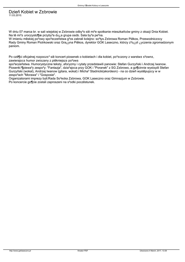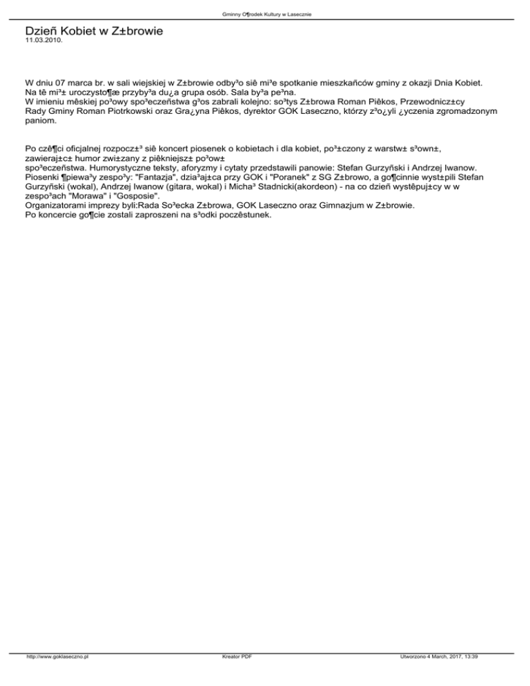 Gminny O¶rodek Kultury w Lasecznie Dzieñ Kobiet w Z±browie 11.03.2010. W dniu 07 marca br. w sali wiejskiej w Z±browie odby³o siê mi³e spotkanie mieszkañców gminy z okazji Dnia Kobiet. Na tê mi³± uroczysto¶æ przyby³a du¿a grupa osób. Sala by³a pe³na. W imieniu mêskiej po³owy spo³eczeñstwa g³os zabrali kolejno: so³tys Z±browa Roman Piêkos, Przewodnicz±cy Rady Gminy Roman Piotrkowski oraz Gra¿yna Piêkos, dyrektor GOK Laseczno, którzy z³o¿yli ¿yczenia zgromadzonym paniom. Po czê¶ci oficjalnej rozpocz±³ siê koncert piosenek o kobietach i dla kobiet, po³±czony z warstw± s³own±, zawieraj±c± humor zwi±zany z piêkniejsz± po³ow± spo³eczeñstwa. Humorystyczne teksty, aforyzmy i cytaty przedstawili panowie: Stefan Gurzyñski i Andrzej Iwanow. Piosenki ¶piewa³y zespo³y: "Fantazja", dzia³aj±ca przy GOK i "Poranek" z SG Z±browo, a go¶cinnie wyst±pili Stefan Gurzyñski (wokal), Andrzej Iwanow (gitara, wokal) i Micha³ Stadnicki(akordeon) - na co dzieñ wystêpuj±cy w w zespo³ach "Morawa" i "Gosposie". Organizatorami imprezy byli:Rada So³ecka Z±browa, GOK Laseczno oraz Gimnazjum w Z±browie. Po koncercie go¶cie zostali zaproszeni na s³odki poczêstunek. http://www.goklaseczno.pl Kreator PDF Utworzono 4 March, 2017, 13:39