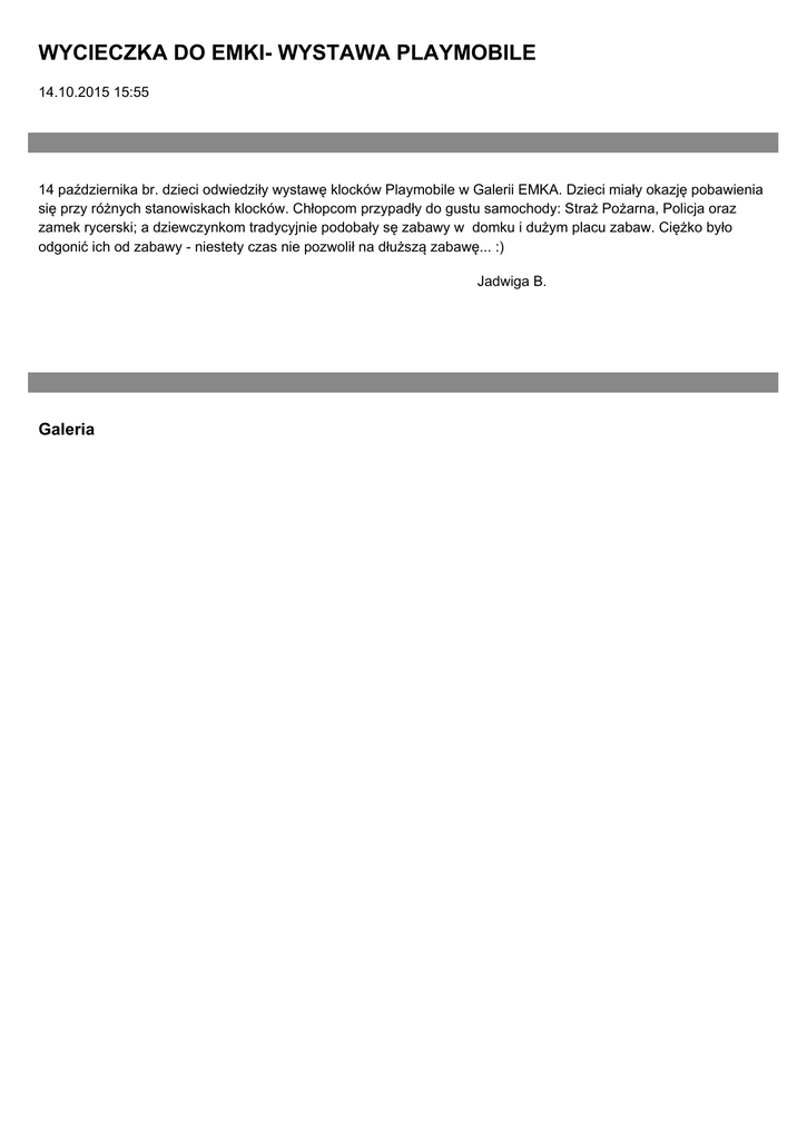 WYCIECZKA DO EMKI- WYSTAWA PLAYMOBILE 14.10.2015 15:55 14 października br. dzieci odwiedziły wystawę klocków Playmobile w Galerii EMKA. Dzieci miały okazję pobawienia się przy różnych stanowiskach klocków. Chłopcom przypadły do gustu samochody: Straż Pożarna, Policja oraz zamek rycerski; a dziewczynkom tradycyjnie podobały sę zabawy w domku i dużym placu zabaw. Ciężko było odgonić ich od zabawy - niestety czas nie pozwolił na dłuższą zabawę... :) Jadwiga B. Galeria