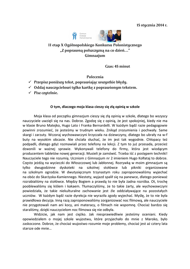 15 stycznia 2014 r. II etap X Ogólnopolskiego Konkursu Polonistycznego „Z poprawną polszczyzną na co dzień…” Gimnazjum Czas: 45 minut Polecenia Przepisz poniższy tekst, poprawiając wszystkie błędy. Oddaj nauczycielowi tylko kartkę z poprawionym tekstem. Pisz czytelnie. O tym, dlaczego moja klasa cieszy się złą opinią w szkole Moja klasa od początku gimnazjum cieszy się złą opinią w szkole, dlatego bo wszyscy nauczyciele uwzięli się na nas. Dobrze. Zgodzę się z opinią, że jest spokojniej, kiedy nie ma w klasie Bruno Matejko, Hugo Lato i Franka Bernardelli. W każdym bądź razie pedagogowie powinni zrozumieć, że jesteśmy w trudnym wieku. Znikąd zrozumienia i pochwały. Same skargi i zarzuty. Wczoraj wychowawczyni krzyczała na dziewczyny, dlatego bo ubrały na w-f buty na wysokim obcasie. Nie chciała słuchać, że im jest tak wygodnie. Chłopacy też podpadli, dlatego gdyż rozmawiali przez telefony na lekcji. Z tym to już przesada, przecież dzwonili w ważnej sprawie. Wykonywali telefony do firmy, która jest wiodącym producentem tabletów nowej generacji. Musieli je zamówić. Trzeba iść z postępem techniki! Nauczyciele tego nie rozumią. Uczniom z Gimnazjum nr 2 imieniem Hugo Kołłataj to dobrze. Często jeżdżą na wycieczki do Włoszczowej lub Jabłonnej. Rozrywką w moim gimnazjum są tylko dwugodzinne dyskoteki na szkolnej stołówce lub pikniki organizowane na szkolnym ogrodzie. W dwutysięcznym trzynastym roku zaproponowaliśmy wyjechać na obóz do Skarżyska-Kamiennego. Niestety, wyjazd spalił się na panewce, dlatego ponieważ rozrabialiśmy na stołówce. Między Bogiem a prawdą to nie była żadna rozróba. Ot, trochę pooblewaliśmy się kiślem i kakaem. Tłumaczyliśmy, że to takie żarty, ale wychowawczyni powiedziała, że takie niekulturalne zachowanie jest źle oddziaływające na pozostałych uczniów. W każdym bądź razie dyrekcja nie wyraziła zgody wyjechać. Myślę, że to nie była prawidłowa decyzja. Inną razą zaproponowaliśmy zorganizować noc filmową, ale nauczyciele nie przygotowali nam ani kocy, ani materacy, o filmach nie wspomnę. Chociaż bardzo się staraliśmy, dzięki nauczycielom noc filmowa się nie odbyła. Widzicie, jak nam jest ciężko. Jak niesprawiedliwie jesteśmy oceniani. Kiedy opowiedziałem o mojej szkole wujostwu, które przyjechało do mnie z Maroko, było zaskoczone. Dobrze, że chociaż wujostwo rozumie moje problemy, chociaż jest aż cztery lata starsze ode mnie…
