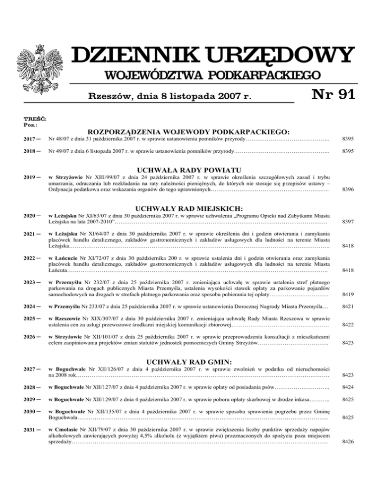 DZIENNIK URZĘDOWY WOJEWÓDZTWA PODKARPACKIEGO Rzeszów, dnia 8 listopada 2007 r. Nr 91 TREŚĆ: Poz.: ROZPORZĄDZENIA WOJEWODY PODKARPACKIEGO: 2017 ─ Nr 48/07 z dnia 31 października 2007 r. w sprawie ustanowienia pomników przyrody…………………………………….. 8395 2018 ─ Nr 49/07 z dnia 6 listopada 2007 r. w sprawie ustanowienia pomników przyrody………………………………………….. 8395 2019 ─ w Strzyżowie Nr XIII/99/07 z dnia 24 października 2007 r. w sprawie określenia szczegółowych zasad i trybu umarzania, odraczania lub rozkładania na raty należności pieniężnych, do których nie stosuje się przepisów ustawy – Ordynacja podatkowa oraz wskazania organów do tego uprawnionych…………………………………………………….. UCHWAŁA RADY POWIATU 8396 UCHWAŁY RAD MIEJSKICH: w Leżajsku Nr XI/63/07 z dnia 30 października 2007 r. w sprawie uchwalenia „Programu Opieki nad Zabytkami Miasta Leżajska na lata 2007-2010”………………………………………………………………………………………………… 8397 w Leżajsku Nr XI/64/07 z dnia 30 października 2007 r. w sprawie określenia dni i godzin otwierania i zamykania placówek handlu detalicznego, zakładów gastronomicznych i zakładów usługowych dla ludności na terenie Miasta Leżajska………………………………………………………………………………………………………………………. 8418 w Łańcucie Nr XI/72/07 z dnia 30 października 200 r. w sprawie ustalenia dni i godzin otwierania oraz zamykania placówek handlu detalicznego, zakładów gastronomicznych i zakładów usługowych dla ludności na terenie Miasta Łańcuta………………………………………………………………………………………………………………………. 8418 w Przemyślu Nr 232/07 z dnia 25 października 2007 r. zmieniająca uchwałę w sprawie ustalenia stref płatnego parkowania na drogach publicznych Miasta Przemyśla, ustalenia wysokości stawek opłaty za parkowanie pojazdów samochodowych na drogach w strefach płatnego parkowania oraz sposobu pobierania tej opłaty…………………………. 8419 2024 ─ w Przemyślu Nr 233/07 z dnia 25 października 2007 r. w sprawie ustanowienia Dorocznej Nagrody Miasta Przemyśla… 8421 2025 ─ w Rzeszowie Nr XIX/307/07 z dnia 30 października 2007 r. zmieniająca uchwałę Rady Miasta Rzeszowa w sprawie ustalenia cen za usługi przewozowe środkami miejskiej komunikacji zbiorowej…………………………………………… 8422 w Strzyżowie Nr XII/101/07 z dnia 25 października 2007 r. w sprawie przeprowadzenia konsultacji z mieszkańcami celem zaopiniowania projektów zmian statutów jednostek pomocniczych Gminy Strzyżów………………………………. 8423 2020 ─ 2021 ─ 2022 ─ 2023 ─ 2026 ─ UCHWAŁY RAD GMIN: w Boguchwale Nr XII/126/07 z dnia 4 października 2007 r. w sprawie zwolnień w podatku od nieruchomości na 2008 rok…………………………………………………………………………………………………………………… 8423 2028 ─ w Boguchwale Nr XII/127/07 z dnia 4 października 2007 r. w sprawie opłaty od posiadania psów……………………….. 8424 2029 ─ w Boguchwale Nr XII/129/07 z dnia 4 października 2007 r. w sprawie poboru opłaty skarbowej w drodze inkasa……….. 8425 2030 ─ w Boguchwale Nr XII/135/07 z dnia 4 października 2007 r. w sprawie sposobu sprawienia pogrzebu przez Gminę Boguchwała………………………………………………………………………………………………………………….. 8425 w Cmolasie Nr XII/79/07 z dnia 30 października 2007 r. w sprawie zwiększenia liczby punktów sprzedaży napojów alkoholowych zawierających powyżej 4,5% alkoholu (z wyjątkiem piwa) przeznaczonych do spożycia poza miejscem sprzedaży…………………………………………………………………………………………………………………….. 8426 2027 ─ 2031 ─ Dziennik Urzędowy Województwa Podkarpackiego 2032 ─ 2033 ─ 2034 ─ 2035 ─ - 8394 - w Czudcu Nr XII/85/07 z dnia 24 października 2007 r. w sprawie regulaminu udzielenia pomocy materialnej o charakterze socjalnym……………………………………………………………………………………………………… 8426 w Rakszawie Nr IX/52/07 z dnia 22 sierpnia 2007 r. w sprawie ustalenia stawek opłat za zajęcie pasa drogowego dróg gminnych……………………………………………………………………………………………………………….. 8429 w Rakszawie Nr X/55/07 z dnia 12 października 2007 r. w sprawie zmiany uchwały Nr IX/52/07 Rady Gminy w Rakszawie w sprawie ustalenia stawek opłat za zajęcie pasa drogowego dróg gminnych………………………………... 8429 w Tuszowie Narodowym Nr IX/67/07 z dnia 24 października 2007 r. w sprawie zmiany uchwały Nr XXVI/253/2005 Rady Gminy Tuszów Narodowy z dnia 28 listopada 2005 r. w sprawie programu gospodarowania mieszkaniowym zasobem Gminy Tuszów Narodowy w latach 2006 – 2011………………………………………………………………….. 8430 ROZPORZĄDZENIE POWIATOWEGO LEKARZA WETERYNARII 2036 ─ w Jarosławiu Nr 7/07 z dnia 30 października 2007 r. w sprawie zwalczania wścieklizny zwierząt na terenie części Gminy Pruchnik……………………………………………………………………………………………………………… 8430 POROZUMIENIE 2037 ─ zawarte w dniu 2 października 2007 r. w Leżajsku pomiędzy Powiatem Leżajskm a Gminą Nowa Sarzyna w sprawie wspólnego finansowania i realizacji projektu pod nazwą „Przebudowa odcinków drogi powiatowej Nr 1238R Łętownia Hucisko - Maleniska o długości odpowiednio 2,750 km i 4,108 km (km 0+000-2+750, 7+940-12+048)”………………… 84