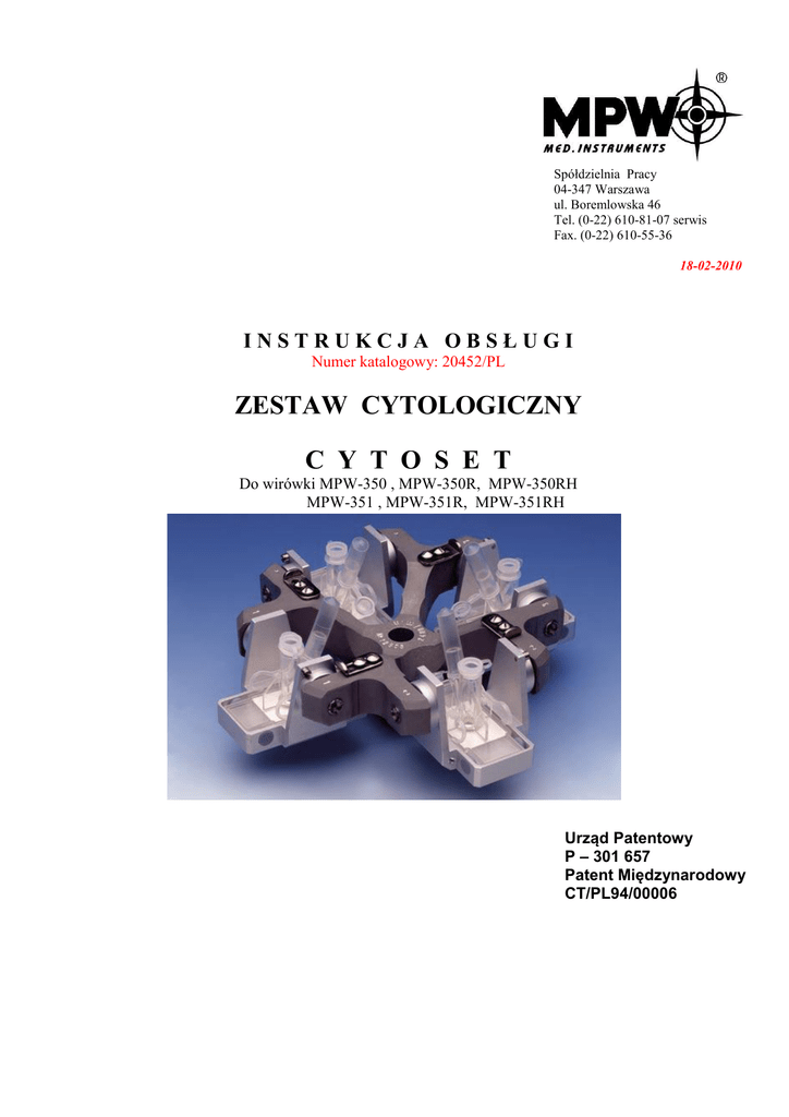 Spółdzielnia Pracy 04-347 Warszawa ul. Boremlowska 46 Tel. (0-22) 610-81-07 serwis Fax. (0-22) 610-55-36 18-02-2010 INSTRUKCJA OBSŁUGI Numer katalogowy: 20452/PL ZESTAW CYTOLOGICZNY C Y T O S E T Do wirówki MPW-350 , MPW-350R, MPW-350RH MPW-351 , MPW-351R, MPW-351RH Urząd Patentowy P – 301 657 Patent Międzynarodowy CT/PL94/00006 Spis-treści 1. ZASTOSOWANIE. 3 2. ZALETY CYTOSET. 3 3. PARAMETRY PRACY. 3 4. WYKAZ WYPOSAŻENIA. 4 5. SKŁAD ZESTAWU. 4 6. ZASADA DZIAŁANIA. 5 7. PRZYGOTOWANIE PREPARATÓW DO WIROWANIA. 5 8. TABELA ROZCIEŃCZEŃ HEMATOLOGII. 5 9. PRZYGOTOWANIE WKŁADKI Z FILTROWANIEM NADSĄCZU PRZEZ BIBUŁĘ / Z UTRATĄ NADSĄCZU /. 6 10. PRZYGOTOWANIE WKŁADKI Z ODZYSKIWANIEM NADSĄCZU. 6 11. PARAMETRY WIROWANIA. 6 12. KOLEJNOŚĆ CZYNNOŚCI PRZY OBSŁUDZE WIRÓWKI Z ZESTAWEM „CYTOSET”. 7 13. POSTĘPOWANIE PO WIROWANIU Z UTRATĄ NADSĄCZU. 8 14. POSTĘPOWANIE PO WIROWANIU Z ODZYSKIEM NASĄCZ. 8 15. WIDOK OGÓLNY. 9 16. CZYSZCZENIE, DEZYNFEKCJA, KONSERWACJA 9 16.1. CZYSZCZENIE WYPOSAŻENIA 16.2. CZYSZCZENIE WKŁADKI CYTO. 16.3. SMAROWANIE 16.4. STERYLIZACJA I DEZYNFEKCJA WYPOSAŻENIA 16.5. WALIDACJA PROCESU CZYSZCZENIA I DEZYNFEKCJI. 9 9 9 10 10 17. DANE PRODUCENTA 10 18. INFORMACJA O DYSTRYBUTORZE 10 2 1. Zastosowanie. Zestaw cytologiczny „CYTOSET” o numerze katalogowy 12452c może być stosowany jako wyposażenie wirówek firmy MPW Med. instruments: MPW-350, MPW-350R, MPW-350RH, MPW-351, MPW-351R, MPW-351RH. Zestaw cytologiczny „CYTOSET” o numerze katalogowym 12271c posiada specjalistyczna wirówka MPW-223c. Zastaw cytologiczny „CYTOSET” przeznaczony jest do diagnostyki in vitro (IVD); służy do odwirowania naturalnych płynów biologicznych, zawiesin w roztworach izotonicznych w celu uzyskania osadów i nadsączy. Elementy drobnowidowe osadzane są bezpośrednio na szkiełkach mikroskopowych, podstawowych, a nadsącz gromadzony jest po zakończonym osadzaniu zawieszonych w nim elementów drobnowidowych w specjalnych probówkach. Badane płyny biologiczne stanowią zawiesinę elementów drobnowidowych w części płynnej. Należą do nich: a) naturalne płyny biologiczne w tym: płyny mózgowo-rdzeniowe, mocze, wysięki, przesięki, ciecz stawowa, upławy, ropa i podobne, b) zawiesiny w roztworach izotonicznych rozmazów, punktatów tkankowych, plwociny, popłuczyn drzewa oskrzelowego, dróg rodnych i podobnych. Zawiesiny te mogą być badane zależnie od przeznaczenia: 1) Do uzyskiwania osadów drobnowidowych i nadsączy z tej samej próby badanej zawiesiny biologicznej. 2) Do uzyskiwania samych osadów drobnowidowych drogą filtrowania nadsączy do bibuły. Zestaw cytologiczny niezbędny jest w medycynie i weterynarii, może być również stosowany w przemyśle spożywczym i technice. 2. Zalety CYTOSET. szybkie osadzanie komórek na szkiełku mikroskopowym metodą wirowania z przenikaniem nadsączu do bibuły filtracyjnej, możliwość odzyskiwania nadsączu po osadzeniu komórek na szkiełku mikroskopowym przez automatyczne zlewanie do probówki, zabezpieczenie płynu przed wydostaniem się do komory wirowania (uniknięcie aerozolowania), zastosowane wkładki jako sprzęt jednorazowego użytku niejałowy pozwalają na unikanie infekcji, skażenia personelu czy środowiska, 3. Parametry pracy. prędkość obrotowa 100÷2500 rpm. max. przyspieszenie 750 x g max. pojemność wkładki cyto 2 ml średnica pola osadzania komórek na szkiełku mikroskopowym 8,7 mm. 3 4. Wykaz wyposażenia. W zależności od potrzeb można zamówić niżej wymieniony Zestaw „CYTOSET" Nr katalogowy Specyfikacja Max rpm RCF Ilość sztuk w komplecie 2500 750 1 13606 Wirnik cytologiczny do wirówki typu MPW-350, MPW-350R, MPW-350RH, MPW-351, MPW-351R, MPW-351RH Zawieszka 15123 Probówka zlewowa 2,2 ml z pokrywką 100 16610 Wkładka cyto kpl. 100 16614 Szkiełko mikroskopowe 100 16616 Bibuła filtracyjna 9,5 mm 100 Bibuła filtracyjna 12,5 mm 100 12452 lub 16617 4 gniazda 4 5. Skład zestawu. Zestaw składa się z wirnika horyzontalnego czterogniazdowego z zawieszkami, do których jest wkładana kompletna wkładka cyto. 6 8 7 4 5 3 2 1 Rys. 1. W skład wkładki kompletnej wchodzą: podstawka – zbiorniczek (1), szkiełko mikroskopowe podstawowe (2), bibuła filtracyjna (3), wkładka CYTO uszczelka 8,7 mm (60mm ) (5), korek korek (6), (7), probówka zlewowa (8). (4), 2 4 6. Zasada działania. W trakcie wirowania, wkładki cyto zmieniają położenie na horyzontalne, przy równoczesnym zablokowaniu tego położenia urządzeniami zatrzaskowymi znajdującymi się na ramionach wirnika w celu ewentualnego zlewania nadsączu. Pod wpływem siły odśrodkowej elementy morfotyczne (osad komórkowy) oddzielają się od zawiesiny i osadzają się na szkiełku mikroskopowym. Bezkomórkowy nadsącz w zależności od stosowanej metody jest wchłaniany przez bibułę filtracyjną lub zlewany do probówki zlewowej po zakończonym wirowaniu. Po zdjęciu probówki zlewowej z nadsączem w celu osuszenia osadu na szkiełku mikroskopowym poddajemy próbkę wtórnemu wirowaniu. Osad komórek CYTO Nadsącz SUPERNATANT Rys. 2. Wkładka CYTO po zakończonym osadzaniu elementów morfotycznych na szkiełku podstawowym wirowaniem z odzyskaniem nadsączu. 7. Przygotowanie preparatów do wirowania. Ilość płynu, jaką należy użyć do wirowania zależna jest od ilości zawartych w nim komórek, jak również jego dostępności. Przy znacznej cytozie płynu, aby uniknąć ułożenia warstwowego komórek na szkiełku lub zbyt dużego zagęszczenia, należy rozcieńczyć płyn w 0,9% roztworze NaCL lub roztworze PBS. 8. Tabela rozcieńczeń hematologii. Liczba białych krwinek Współczynnik rozcieńczenia Krople próbki Krople roztworu soli 101 - 300 301 - 700 701 - 1500 1501 - 3000 -1:2 1:5 1 : 10 20 10 4 2 0 10 16 18 Przy badaniu płynu ubogiego w komórki z nieznaczną zawartością białka (ok. 0,2 mg/ml) istnieje niebezpieczeństwo, że odwirowane komórki na szkiełku mogą być popękane, jak r
