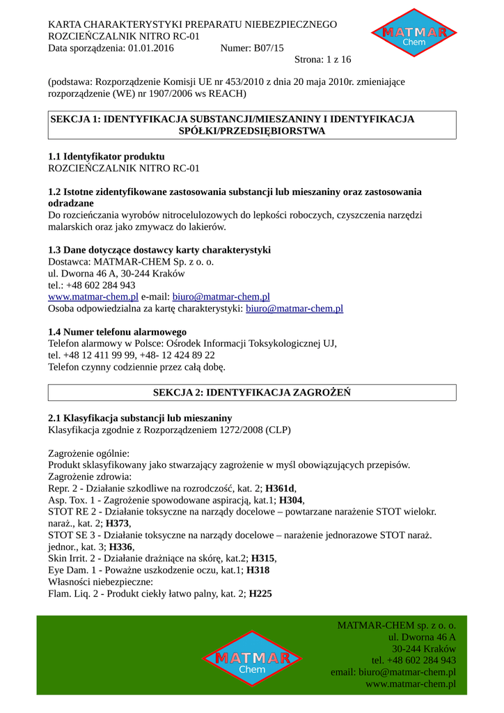 KARTA CHARAKTERYSTYKI PREPARATU NIEBEZPIECZNEGO ROZCIEŃCZALNIK NITRO RC-01 Data sporządzenia: 01.01.2016 Numer: B07/15 Strona: 1 z 16 (podstawa: Rozporządzenie Komisji UE nr 453/2010 z dnia 20 maja 2010r. zmieniające rozporządzenie (WE) nr 1907/2006 ws REACH) SEKCJA 1: IDENTYFIKACJA SUBSTANCJI/MIESZANINY I IDENTYFIKACJA SPÓŁKI/PRZEDSIĘBIORSTWA 1.1 Identyfikator produktu ROZCIEŃCZALNIK NITRO RC-01 1.2 Istotne zidentyfikowane zastosowania substancji lub mieszaniny oraz zastosowania odradzane Do rozcieńczania wyrobów nitrocelulozowych do lepkości roboczych, czyszczenia narzędzi malarskich oraz jako zmywacz do lakierów. 1.3 Dane dotyczące dostawcy karty charakterystyki Dostawca: MATMAR-CHEM Sp. z o. o. ul. Dworna 46 A, 30-244 Kraków tel.: +48 602 284 943 www.matmar-chem.pl e-mail: [email protected] Osoba odpowiedzialna za kartę charakterystyki: [email protected] 1.4 Numer telefonu alarmowego Telefon alarmowy w Polsce: Ośrodek Informacji Toksykologicznej UJ, tel. +48 12 411 99 99, +48- 12 424 89 22 Telefon czynny codziennie przez całą dobę. SEKCJA 2: IDENTYFIKACJA ZAGROŻEŃ 2.1 Klasyfikacja substancji lub mieszaniny Klasyfikacja zgodnie z Rozporządzeniem 1272/2008 (CLP) Zagrożenie ogólnie: Produkt sklasyfikowany jako stwarzający zagrożenie w myśl obowiązujących przepisów. Zagrożenie zdrowia: Repr. 2 - Działanie szkodliwe na rozrodczość, kat. 2; H361d, Asp. Tox. 1 - Zagrożenie spowodowane aspiracją, kat.1; H304, STOT RE 2 - Działanie toksyczne na narządy docelowe – powtarzane narażenie STOT wielokr. naraż., kat. 2; H373, STOT SE 3 - Działanie toksyczne na narządy docelowe – narażenie jednorazowe STOT naraż. jednor., kat. 3; H336, Skin Irrit. 2 - Działanie drażniące na skórę, kat.2; H315, Eye Dam. 1 - Poważne uszkodzenie oczu, kat.1; H318 Własności niebezpieczne: Flam. Liq. 2 - Produkt ciekły łatwo palny, kat. 2; H225 MATMAR-CHEM sp. z o. o. ul. Dworna 46 A 30-244 Kraków tel. +48 602 284 943 email: [email protected] www.matmar-chem.pl KARTA CHARAKTERYSTYKI PREPARATU NIEBEZPIECZNEGO ROZCIEŃCZALNIK NITRO RC-01 Data sporządzenia: 01.01.2016 Numer: B07/15 Strona: 2 z 16 Zagrożenie środowiska: nie dotyczy 2.2 Elementy oznakowania Piktogramy określające rodzaj zagrożenia: Hasło ostrzegawcze: NIEBEZPIECZEŃSTWO Zwroty wskazujące rodzaj zagrożenia H318 - Powoduje poważne uszkodzenie oczu H361d - Podejrzewa się, że działa szkodliwie na dziecko w łonie matki H373 - Może powodować uszkodzenie narządów, poprzez długotrwałe lub powtarzane narażenie H336 - Może wywoływać uczucie senności lub zawroty głowy H304 - Połknięcie i dostanie się przez drogi oddechowe może grozić śmiercią H225 - Wysoce łatwo palna ciecz i pary H315 - Działa drażniąco na skórę Zwroty określające warunki bezpiecznego stosowania: P210 - Przechowywać z dala od źródeł ciepła/iskrzenia/ otwartego ognia/gorących powierzchni. – Palenie wzbronione. P233 - Przechowywać pojemnik szczelnie zamknięty P403+P235 - Przechowywać w dobrze wentylowanym miejscu. Przechowywać w chłodnym miejscu. P308+P313 - W przypadku narażenia lub styczności: Zasięgnąć porady/zgłosić się pod opiekę lekarza. P301+P310 - W przypadku połknięcia: Natychmiast skontaktować się z Ośrodkiem Zatruć lub z lekarzem. P331 - NIE wywoływać wymiotów. P260 - Nie wdychać pyłu/dymu/gazu/mgły/par/rozpylonej cieczy. P271 - Stosować wyłącznie na zewnątrz lub w dobrze wentylowanym pomieszczeniu. P280 - Stosować rękawice ochronne/odzież ochronną/ochronę oczu/ochronę twarzy. P305+P351+P338 - W przypadku dostania się do oczu: Ostrożnie płukać wodą przez kilka minut. Wyjąć soczewki kontaktowe, jeżeli są i można je łatwo usunąć. nadal płukać. Usuwanie P501 Zawartość/pojemnik usuwać do: składowisk substancji niebezpiecznych. MATMAR-CHEM sp. z o. o. ul. Dworna 46 A 30-244 Kraków tel. +48 602 284 943 email: [email protected] www.matmar-chem.pl KARTA CHARAKTERYSTYKI PREPARATU NIEBEZPIECZNEGO ROZCIEŃCZALNIK NITRO RC-01 Data sporządzenia: 01.01.2016 Numer: B07/15 Strona: 3 z 16 Informacje uzupełniające EUH 066 Powtarzające się narażenie może powodować wysuszanie lub pękanie skóry. 2.3 Inne zagrożenia Składniki mieszaniny nie spełniają kryteriów PBT lub vPvB zgodnie z załącznikiem XIII Rozporządzenia Reach. SEKCJA 3: SKŁAD / INFORMACJA O SKŁADNIKACH 3 Skład/informacje o składnikach Nazwa substancji Numery identyfikacyjne Klasyfikacja i oznakowanie uł. masowy w% toluen WE: 203-625-9 CAS: 108-88-3 Nr indeksu: 601-021-00-3 Nr rejestracji: 01-2119471310-51XXXX Flam. Liq. 2, H225; 50-70 Repr. 2, H361d; Asp. Tox. 1, H304; STOT RE 2, H373; Skin Irrit. 2, H315; STOT SE 3, H336 alkohol izobutylowy WE: 201-148-0 CAS: 78-83-1 Nr indeksu: 603-108-00-1 Nr rejestracji: 01-2119484609-23XXXX Flam. Liq. 3, H226, STOT SE 3, H335, Skin Irrit. 2, H315,Eye Dam. 1, H318, STOT SE 3, H336 5-15 octan n-butylu WE: 204-658-1 CAS: 123-86-4 Nr indeksu: 607-025-00-1 Nr rejestracji: 0121194849-29-XXXX Flam. Liq. 3; H226, STOT SE 3; H336, EUH066 5-15 Flam. Liq. 2, H225; Eye Irrit. 2, H319; STOT SE 3, H336; EUH 066 5 aceton WE: 200-662-2 CAS: 67-64-1 Nr indeksu: 606-001-00-8 Nr rejestracji: 01-2119471330-49XXXX Pełne znaczenie zwrotów ujęto w sekcji 16. SEKCJA 4: ŚRODKI PIERWSZEJ POMOCY 4.1 Opis środków pierwszej pomocy Wdychanie: W razie narażenia inhalacyjnego wezwać pomoc medyczną. Gdy poszkodowany jest przytomny MATMAR-CHEM sp. z o. o. ul. Dworna 46 A 30-244 Kraków tel. +48 602 284 943 email: [email protected] www.matmar-chem.pl KARTA CHARAKTERYSTYKI PREPARATU NIEBEZPIECZNEGO ROZCIEŃCZALNIK NITRO RC-01 Data sporządzenia: 01.01.2016 Numer: B07/15 Strona: 4 z 16 wyprowadzić poszkodowanego z miejsca narażenia. Zapewnić spokój w dowolnej pozycji, chronić przed utratą ciepła. W przypadku duszności - wykwalifikowany personel medyczny powienien podać tlen. Nieprzytomnego - wynieść z miejsca narażenia, ułożyć w pozycji boczne