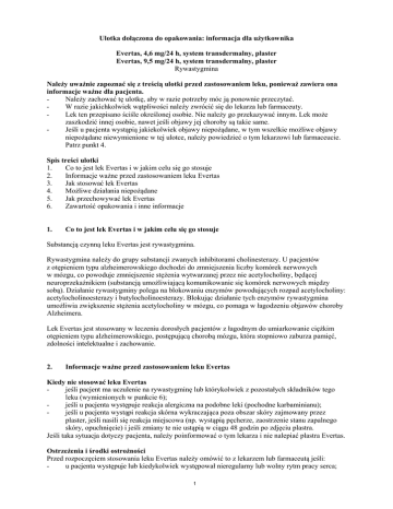Ulotka dołączona do opakowania: informacja dla użytkownika Evertas, 4,6 mg/24 h, system transdermalny, plaster Evertas, 9,5 mg/24 h, system transdermalny, plaster Rywastygmina Należy uważnie zapoznać się z treścią ulotki przed zastosowaniem leku, ponieważ zawiera ona informacje ważne dla pacjenta. Należy zachować tę ulotkę, aby w razie potrzeby móc ją ponownie przeczytać. W razie jakichkolwiek wątpliwości należy zwrócić się do lekarza lub farmaceuty. Lek ten przepisano ściśle określonej osobie. Nie należy go przekazywać innym. Lek może zaszkodzić innej osobie, nawet jeśli objawy jej choroby są takie same. Jeśli u pacjenta wystąpią jakiekolwiek objawy niepożądane, w tym wszelkie możliwe objawy niepożądane niewymienione w tej ulotce, należy powiedzieć o tym lekarzowi lub farmaceucie. Patrz punkt 4. Spis treści ulotki 1. Co to jest lek Evertas i w jakim celu się go stosuje 2. Informacje ważne przed zastosowaniem leku Evertas 3. Jak stosować lek Evertas 4. Możliwe działania niepożądane 5. Jak przechowywać lek Evertas 6. Zawartość opakowania i inne informacje 1. Co to jest lek Evertas i w jakim celu się go stosuje Substancją czynną leku Evertas jest rywastygmina. Rywastygmina należy do grupy substancji zwanych inhibitorami cholinesterazy. U pacjentów z otępieniem typu alzheimerowskiego dochodzi do zmniejszenia liczby komórek nerwowych w mózgu, co powoduje zmniejszenie stężenia wytwarzanej przez nie acetylocholiny, będącej neuroprzekaźnikiem (substancją umożliwiającą komunikowanie się komórek nerwowych między sobą). Działanie rywastygminy polega na blokowaniu enzymów powodujących rozpad acetylocholiny: acetylocholinoesterazy i butylocholinoesterazy. Blokując działanie tych enzymów rywastygmina umożliwia zwiększenie stężenia acetylocholiny w mózgu, co pomaga w łagodzeniu objawów choroby Alzheimera. Lek Evertas jest stosowany w leczeniu dorosłych pacjentów z łagodnym do umiarkowanie ciężkim otępieniem typu alzheimerowskiego, postępującą chorobą mózgu, która stopniowo zaburza pamięć, zdolności intelektualne i zachowanie. 2. Informacje ważne przed zastosowaniem leku Evertas Kiedy nie stosować leku Evertas jeśli pacjent ma uczulenie na rywastygminę lub którykolwiek z pozostałych składników tego leku (wymienionych w punkcie 6); jeśli u pacjenta występuje reakcja alergiczna na podobne leki (pochodne karbaminianu); jeśli u pacjenta wystąpi reakcja skórna wykraczająca poza obszar skóry zajmowany przez plaster, jeśli nasili się reakcja miejscowa (np. wystąpią pęcherze, zaostrzenie stanu zapalnego skóry, opuchnięcie) i jeśli zmiany te nie ustąpią w ciągu 48 godzin po zdjęciu plastra. Jeśli taka sytuacja dotyczy pacjenta, należy poinformować o tym lekarza i nie nalepiać plastra Evertas. Ostrzeżenia i środki ostrożności Przed rozpoczęciem stosowania leku Evertas należy omówić to z lekarzem lub farmaceutą jeśli: u pacjenta występuje lub kiedykolwiek występował nieregularny lub wolny rytm pracy serca; 1 u pacjenta występuje lub kiedykolwiek występował czynny wrzód żołądka; u pacjenta występują lub kiedykolwiek występowały trudności w oddawaniu moczu; u pacjenta występują lub kiedykolwiek występowały napady padaczkowe; u pacjenta występuje lub kiedykolwiek występowała astma lub ciężka choroba układu oddechowego; u pacjenta występuje drżenie mięśniowe; pacjent ma małą masę ciała; u pacjenta występują reakcje ze strony żołądka i jelit, takie jak: nudności (mdłości), wymioty i biegunka. Pacjent może się odwodnić (tracąc zbyt dużo płynu), jeśli wymioty czy biegunka utrzymują się przez dłuższy czas; u pacjenta występują zaburzenia czynności wątroby. Jeśli którakolwiek z tych sytuacji dotyczy pacjenta, potrzebna może być dokładniejsza obserwacja pacjenta przez lekarza w czasie stosowania tego leku. - Jeśli pacjent nie nalepiał plastra przez dłużej niż trzy dni, nie powinien nalepiać kolejnego plastra zanim nie porozmawia o tym z lekarzem. Dzieci i młodzież Stosowanie leku Evertas u dzieci i młodzieży w leczeniu otępienia typu alzheimerowskiego nie jest właściwe. Lek Evertas a inne leki Należy powiedzieć lekarzowi lub farmaceucie o wszystkich lekach przyjmowanych przez pacjenta obecnie lub ostatnio, a także o lekach, które pacjent planuje przyjmować. Evertas może wpływać na działanie leków przeciwcholinergicznych, z których niektóre są stosowane w łagodzeniu skurczów żołądka (np. dicyklomina), w leczeniu choroby Parkinsona (np. amantadyna) lub w zapobieganiu chorobie lokomocyjnej (np. difenhydramina, skopolamina lub meklizyna). Leku Evertas system transdermalny, plaster nie należy stosować jednocześnie z metoklopramidem (lekiem używanym w łagodzeniu lub zapobieganiu nudnościom i wymiotom). Jednoczesne przyjmowanie tych dwóch leków może spowodować takie zaburzenia, jak sztywność kończyn i drżenie dłoni. Jeśli pacjent ma być poddany operacji w czasie leczenia lekiem Evertas systemy transdermalne, plastry, powinien powiedzieć lekarzowi o ich stosowaniu, ponieważ mogą one nasilać działanie niektórych środków zwiotczających mięśnie, podawanych w trakcie znieczulenia. Należy zachować ostrożność, gdy Evertas system transdermalny, plaster jest stosowany razem z lekami beta-adrenolitycznymi (lekami, takimi jak atenolol, stosowanymi w leczeniu nadciśnienia, dławicy piersiowej i innych chorób serca). Jednoczesne przyjmowanie tych dwóch leków może spowodować takie zaburzenia, jak spowolnienie pracy serca (bradykardia) prowadzące do omdlenia lub utraty przytomności. Ciąża, karmienie piersią i wpływ na płodność Jeśli pacjentka jest w ciąży lub karmi piersią, przypuszcza, że może być w ciąży lub gdy planuje mieć dziecko, powinna poradzić się lekarza lub farmaceuty przed zastosowaniem tego leku. Jeśli pacjentka jest w ciąży, należy doko