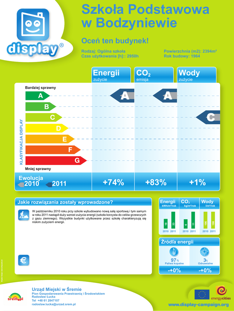 Szkoła Podstawowa w Bodzyniewie Oceń ten budynek! Rodzaj: Ogólna szkoła Czas użytkowania [h]:: 2950h Powierzchnia (m2): 2394m² Rok budowy: 1964 Energii Wody zużycie emisja zużycie Bardziej sprawny A A KLASYFIKACJA DISPLAY C Mniej sprawny +74% +83% Jakie rozwiązania zostały wprowadzone? +1% Energii Wody kg/m²/rok 2010 2011 6 33 W październiku 2010 roku przy szkole wybudowano nową salę sportową i tym samym w roku 2011 nastąpił duży wzrost zużycia energii (szkoła korzysta do celów grzewczych z gazu ziemnego). Wszystkie budynki użytkowane przez szkołę charakteryzują się niskim zużyciem energii. 19 kWh/m²/rok 2010 2011 l/m²/rok 198 2011 196 2010 11 Ewolucja 2010 2011 Żródſa energii Urząd Miejski w Śremie Pion Gospodarowania Przestrzenią i Środowiskiem Radosław Łucka Tel +48 61 2847107 [email protected] % Paliwa kopalne 97 % Odnawialne 3 -+0% -+0%