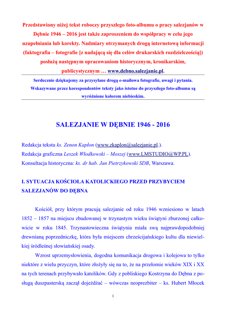 Przedstawiony niżej tekst roboczy przyszłego foto-albumu o pracy salezjanów w Dębnie 1946 – 2016 jest także zaproszeniem do współpracy w celu jego uzupełniania lub korekty. Nadmiary otrzymanych drogą internetową informacji (faktografia – fotografie [z nadającą się dla celów drukarskich rozdzielczością]) posłużą następnym opracowaniom historycznym, kronikarskim, publicystycznym … www.debno.salezjanie.pl. Serdecznie dziękujemy za przysyłane drogą e-mailowa fotografie, uwagi i pytania. Wskazywane przez korespondentów teksty jako istotne do przyszłego foto-albumu są wyróżnione kolorem niebieskim. SALEZJANIE W DĘBNIE 1946 - 2016 Redakcja tekstu ks. Zenon Kapłon ([email protected].). Redakcja graficzna Leszek Włodkowski – Moszej ([email protected]). Konsultacja historyczna: ks. dr hab. Jan Pietrzykowski SDB, Warszawa. I. SYTUACJA KOŚCIOŁA KATOLICKIEGO PRZED PRZYBYCIEM SALEZJANÓW DO DĘBNA Kościół, przy którym pracują salezjanie od roku 1946 wzniesiono w latach 1852 – 1857 na miejscu zbudowanej w trzynastym wieku świątyni zburzonej całkowicie w roku 1845. Trzynastowieczna świątynia miała swą najprawdopodobniej drewnianą poprzedniczkę, która była miejscem chrześcijańskiego kultu dla niewielkiej śródleśnej słowiańskiej osady. Wzrost uprzemysłowienia, dogodna komunikacja drogowa i kolejowa to tylko niektóre z wielu przyczyn, które złożyły się na to, że na przełomie wieków XIX i XX na tych terenach przybywało katolików. Gdy z pobliskiego Kostrzyna do Dębna z posługą duszpasterską zaczął dojeżdżać – wówczas neoprezbiter – ks. Hubert Młocek 1 powstała inicjatywa budowy katolickiego kościoła. Po wybudowaniu w roku 1932 kościoła, dokonano podziału parafii kostrzyńskiej a wrocławski kardynał Adam Bertram w dniu 1 października 1934 roku utworzył nową parafię, w skład której wchodziło 52 miejscowości z okręgu chojeńskiego, kostrzyńskiego, gorzowskiego i myśliborskiego. Taki rozległy teren objął swą troską duszpasterską ks. Hubert, którego wśród wielu życzliwych mieszkańców w nowo utworzonej katolickiej parafii w Neudamm wspierali duchowo również rodzice wybierający się w podróż koleją ze Śląska. Jeszcze w latach pięćdziesiątych ojciec ks. Huberta przyjeżdżał do Dębna na grób swego jedynego syna, który zmarł w dniu 12 listopada 1945 roku. W czasie działań wojennych mający aktualnie wezwanie św. Apostołów Piotra i Pawła kościół nie doznał większych uszkodzeń ale kilkakrotnie miał pełnić funkcję domu kultury dla żołnierzy sowieckich. W lutym 1945 roku do miasta przybywali pierwsi osadnicy, którzy na spotkania liturgiczne gromadzili się w Kościele pod wezwaniem św. Antoniego Padewskiego. W dniu 7 lipca 1945 przeniosły się do Dębna władze powiatu chojeńskiego. Chociaż konferencja poczdamska zakończyła się 2 sierpnia już poprzedniego dnia miasto otrzymało nową nazwę Dąb Nowy1. W dniu 24 grudnia tegoż roku ks. Wiktor Markiewicz dokonał poświęcenia opuszczonego przez protestantów zboru2. II. OKOLICZNOŚCI PRZYBYCIA SALEZJANÓW DO DĘBNA I POSŁUGA DUSZPASTERSKA KS. ANTONIEGO KOLODZIEJCZAKA SDB Przebywający w Rzymie (14 IV – 11 VII 1945 r.) prymas August Hlond przygotował propozycje odnowy życia kościelnego i religijnego w Polsce i 28 czerwca 1945 r. przedstawił je pisemnie mons. Domenico Tardiniemu, sekretarzowi Kongre1 2 Konferencja odbyła się w dniach 17 lipca – 2 sierpnia 1945 w Poczdamie koło Berlina. Po konferencji teherańskiej (28 listopada – 1 grudnia 1943) i konferencji jałtańskiej (4 – 11 lutego 1945) była to ostatnia z trzech konferencji tak zwanej „wielkiej trójki”. Stosowne do wzrastającej lawinowo liczby katolików władze miasta udzieliły ks. Markiewiczowi zezwolenie na ad aptację protestanckiego zboru dla celów kultu katolickiego. Wraz z zezwoleniem ks. Markiewicz otrzymał klucze do świątyni, które polskiej administracji przekazali opuszczający miasto sowieci. 2 gacji do Spraw Nadzwyczajnych Kościoła. Projekty te zostały zreferowane papieżowi Piusowi XII, który 8 lipca udzielił kardynałowi Hlondowi nadzwyczajnych pełnomocnictw (facolta specjalissime), z których mógł korzystać na całym terytorium polskim. Odpowiadając na apel prymasa Augusta Hlonda salezjanie oddelegowali kilku księży do dyspozycji administratora apostolskiego w Gorzowie Wielkopolskim, prosząc, aby przydzielono im parafie blisko siebie. Od lutego do września 1946 roku na Pomorzu Zachodnim salezjanie objęli opieką duszpasterską placówki duszpasterskie: Banie, Dębno, Stare Czarnowo, Swobnicę, Szczecin-Gumieńce, Widuchową. Pierwsza nazwa miasta Dąb Nowy od 1 stycznia 1946 została zmieniona na Dębno Lubuskie3. Zatem pierwszy salezjanin, ks. Kołodziejczak na początku marca dotarł do miejscowości o nazwie Dębno Lubuskie i taka nazwa miasta jest dostrzegalna na korespondencji i drukach urzędowych z tamtych miesięcy. Po przejęciu już poświęconego kościoła i parafii, ks. Antoni Kołodziejczak rozpoczął poszukiwanie niezbędnego sprzętu liturgicznego i zajął się spontaniczną organizacją życia katolickiej parafii. Od dnia 7 maja 1946 nazwa miasta została zmieniona na Dębno. Natomiast nazwa Dębno Lubuskie utrzymała się jako nazwa stacji PKP, i w zależności od tego jakim adresem dysponuje nadawca, sporadycznie pojawia się w korespondencji. Dębno było siedzibą powiatu do 31 maja 1975 roku. Ludność miasta, która w roku 1948 nie przekraczała 4 tysięcy, w 1997 roku liczyła 14,5 tysiąca. Przynależące wcześniej do województwa szczecińskiego, od 1 czerwca 1975 roku do 31 grudnia 1998 Dębno przejściowo wchodziło w skład utworzonego wtedy między innymi województwa gorzowskiego, ażeby następnie znaleźć się w nowo utworzonym województwie zachodniopomorskim. Potrzeby wojenne Trzeciej Rzeszy – jednoczenie Europy pod znakiem swastyki od Atlantyku po Ural 