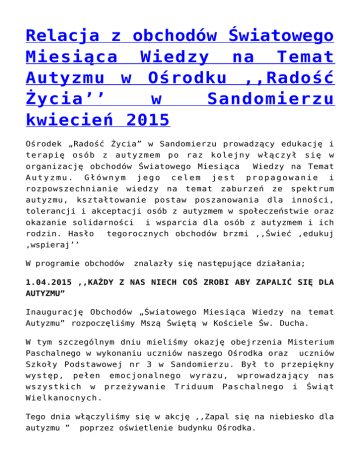 Relacja z obchodów Światowego Miesiąca Wiedzy na Temat Autyzmu w Ośrodku ,,Radość Życia’’ w Sandomierzu kwiecień 2015 Ośrodek „Radość Życia” w Sandomierzu prowadzący edukację i terapię osób z autyzmem po raz kolejny włączył się w organizację obchodów Światowego Miesiąca Wiedzy na Temat Autyzmu. Głównym jego celem jest propagowanie i rozpowszechnianie wiedzy na temat zaburzeń ze spektrum autyzmu, kształtowanie postaw poszanowania dla inności, tolerancji i akceptacji osób z autyzmem w społeczeństwie oraz okazanie solidarności i wsparcia dla osób z autyzmem i ich rodzin. Hasło tegorocznych obchodów brzmi ,,Świeć ,edukuj ,wspieraj’’ W programie obchodów znalazły się następujące działania; 1.04.2015 ,,KAŻDY Z NAS NIECH COŚ ZROBI ABY ZAPALIĆ SIĘ DLA AUTYZMU” Inaugurację Obchodów „Światowego Miesiąca Wiedzy na temat Autyzmu” rozpoczęliśmy Mszą Świętą w Kościele Św. Ducha. W tym szczególnym dniu mieliśmy okazję obejrzenia Misterium Paschalnego w wykonaniu uczniów naszego Ośrodka oraz uczniów Szkoły Podstawowej nr 3 w Sandomierzu. Był to przepiękny występ, pełen emocjonalnego wyrazu, wprowadzający nas wszystkich w przeżywanie Triduum Paschalnego i Świąt Wielkanocnych. Tego dnia włączyliśmy się w akcję ,,Zapal się na niebiesko dla autyzmu ” poprzez oświetlenie budynku Ośrodka. 2.04.2015 „TY TEŻ ŚWIEĆ NA NIEBIESKO” Drugiego kwietnia świętowaliśmy z bliskimi w domach rodzinnych poprzez oglądanie programów telewizyjnych poświęconych obchodom Dnia Wiedzy na Temat Autyzmu w Polsce i na świecie, wspólną modlitwę ,wspominanie Św. Jana Pawła II w X rocznicę śmierci, oglądanie albumów, filmów. Jako symbol solidarności z osobami z autyzmem i ich rodzinami o godzinie 20:00 zapaliliśmy niebieskie światła w swoich domach. 9.04.2015 –„PAMIETAJCIE, ABY KAŻDY CZŁOWIEK BYŁ DLA CZŁOWIEKA BRATEM” Inaugurację obchodów Roku Św. Jana Pawła II rozpoczęliśmy Mszą Świętą z udziałem uczniów i kadry Ośrodka, następnie wszyscy przeszliśmy na Plac Papieski, gdzie przy pomniku św. Jana Pawła II modliliśmy się wypraszając za jego pośrednictwem potrzebne łaski. Z radością w sercach wspólnie śpiewaliśmy jego ulubione pieśni. Uczniowie reprezentujący poszczególne zespoły klasowe zapalili znicze pod pomniku. Tego dnia prowadzone były zajęcia poświęcone osobie Wielkiego Polaka: oglądaliśmy filmy, prezentacje multimedialne, albumy, kroniki, słuchaliśmy utworów muzycznych, wykonywaliśmy prace plastyczne związane ze Świętym Janem Pawłem II. 10.04.2015 „DZIEŃ DLA ZDROWIA” 10 kwietnia w naszym Ośrodku obchodziliśmy Światowy Dzień Zdrowia pod hasłem „Bezpieczeństwo żywności”. Z tej okazji zaproszeni zostali przedstawiciele Powiatowej Stacji Sanitarno- Epidemiologicznej w Sandomierzu, którzy poprzez prezentację multimedialną ukazali nam tematykę tegorocznej kampanii WHO. Uczniowie gimnazjum naszego Ośrodka przygotowali dla swoich kolegów i koleżanek niespodziankę w formie przedstawienia pt. „Ruch i dieta to zdrowie”. 13.04.2015 – ,,NAJWAŻNIEJSZYM NARZĘDZIEM TERAPEUTYCZNYM W PRZYPADKU OSOBY Z AUTYZMEM JEST DRUGI CZŁOWIEK – JEGO ŻYCZLIWOŚĆ I ZROZUMIENIE” W celu propagowania i rozpowszechniania wiedzy na temat autyzmu w społeczeństwie, nasi uczniowie wraz z nauczycielami odbyli wizyty w placówkach oświatowych na terenie miasta Sandomierz– wręczyli plakaty i ulotki edukacyjne o autyzmie. Ponadto w Ośrodku odbywały się zajęcia integracyjne i wspólna zabawa przy muzyce. 14.04.2015 „KULTURA PRZYJAZNA OSOBOM Z AUTYZMEM” Grupa uczniów z autyzmem wraz z nauczycielami udała się do Tarnobrzeskiego Domu Kultury na przedstawienie Teatru Banasiów pt „Wiosna jest tuż tuż ”. Wszyscy uczniowie z zainteresowaniem śledzili wydarzenia rozgrywające się na scenie, prezentując odpowiednią postawę w roli widza. 15-17.04 2015 r. ,,BY Z AUTYZMEM ŻYŁO SIĘ ŁATWIEJ” Przez trzy dni w naszym Ośrodku gościliśmy psychologa klinicznego z Warszawy, Panią dr Marię Piszczek, która diagnozowała naszych uczniów, udzielała cennych wskazówek, prowadziła konsultacje dla rodziców i chętnych osób. 20.04.2015 – ,,CHCEMY MIEĆ SZANSĘ NA SAMODZIELNE ŻYCIE W PRZYSZŁOŚCI” Dziewiętnastoosobowa grupa uczniów, nauczycieli i rodziców wybrała się do Wilczej Góry by zwiedzić Pracownię Rzeczy Różnych i Zakład Aktywizacji Zawodowej. Mieliśmy okazję poznania specyfiki działania i funkcjonowania tej placówki. Zostaliśmy bardzo serdecznie i życzliwie przyjęci przez wszystkich pracowników i dyrekcję. Po obejrzeniu wszystkich pracowni i burzliwych rozmowach zaproszeni zostaliśmy na integracyjny spacer po lesie który znajduje się w bezpośrednim sąsiedztwie ZAZ-u. Wyjazd obfitował w wiele atrakcji. Wróciliśmy bogatsi o nową wiedzę i doświadczenia. 22.04.2015 – ,,ZAPAL SIĘ NA NIEBIESKO DLA AUTYZMU” Uroczyste obchody Światowego Dnia Wiedzy na Temat Autyzmu miały miejsce 22 kwietnia w Katolickim Domu Kultury w Sandomierzu. ,,Wielką siłę mam w sobie” to hasło części artystycznej, która zainaugurowała nasze spotkanie. Głównymi aktorami przedstawienia byli wychowankowie Szkoły dla Uczniów z Autyzmem funkcjonującej przy naszym Ośrodku. Każdy uczeń miał możliwość zaprezentowania się na scenie. Wielu wzruszeń dostarczył wszystkim montaż taneczno-muzyczny pt „Róża”, którego przesłaniem były słowa „ Tak jak kwiat, który potrzebuje do wzrostu słońca, deszczu, wiatru, tak każdy z nas pragnie miłości, troski, bezpieczeństwa i wsparcia drugiej osoby”. Ważnym wydarzeniem tego dnia była premiera filmu „Droga do samodzielności”, którego bohaterami są uczniowie naszej szkoły ukazani podczas zdobywania umiejętności, które mają im pomóc w osiągnięciu autonomii, niezależności. Niezwykle atrakcyjnym punktem programu był recital w wykonaniu 