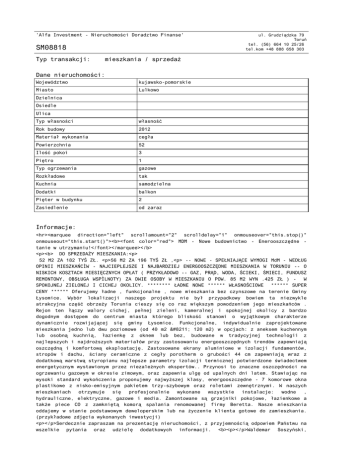 'Alfa Investment - Nieruchomości Doradztwo Finanse' SM08818 Typ transakcji: ul. Grudziądzka 79 Toruń tel. (56) 664 10 25/26 tel.kom +48 888 658 303 mieszkania / sprzedaż Dane nieruchomości: Województwo kujawsko-pomorskie Miasto Lulkowo Dzielnica Osiedle Ulica Typ własności własność Rok budowy 2012 Materiał wykonania cegła Powierzchnia 52 Ilość pokoi 3 Piętro 1 Typ ogrzewania gazowe Rozkładowe tak Kuchnia samodzielna Dodatki balkon Pięter w budynku 2 Zasiedlenie od zaraz Informacje: <hr><marquee direction="left" scrollamount="2" scrolldelay="1" onmouseover="this.stop()" onmouseout="this.start()"><b><font color="red"> MDM - Nowe budownictwo - Enerooszczędne tanie w utrzymaniu!</font></marquee></b> <p><b> DO SPRZEDAŻY MIESZKANIA:<p> 52 M2 ZA 182 TYŚ ZŁ. <p>56 M2 ZA 196 TYŚ ZŁ ,<p> -- NOWE - SPEŁNIAJĄCE WYMOGI MdM - WEDŁUG OPINII MIESZKAŃCÓW - NAJCIEPLEJSZE I NAJBARDZIEJ ENERGOOSZCZĘDNE MIESZKANIA W TORUNIU -- O NISKICH KOSZTACH MIESIĘCZNYCH OPŁAT ( PRZYKŁADOWO -- GAZ, PRĄD, WODA, ŚCIEKI, ŚMIECI, FUNDUSZ REMONTOWY, OBSŁUGA WSPÓLNOTY) ZA DWIE OSOBY W MIESZKANIU O POW. 85 M2 WYN .425 ZŁ ) W SPOKOJNEJ ZIELONEJ I CICHEJ OKOLICY. ******** ŁADNE NOWE ****** WŁASNOŚCIOWE ****** SUPER CENY ****** Oferujemy ładne , funkcjonalne , nowe mieszkania bez czynszowe na terenie Gminy Łysomice. Wybór lokalizacji naszego projektu nie był przypadkowy bowiem ta niezwykle atrakcyjna część obrzeży Torunia cieszy się co raz większym powodzeniem jego mieszkańców . Rejon ten łączy walory cichej, pełnej zieleni, kameralnej i spokojnej okolicy z bardzo dogodnym dostępem do centrum miasta którego bliskość stanowi o wyjątkowym charakterze dynamicznie rozwijającej się gminy Łysomice. Funkcjonalne, indywidualnie zaprojektowane mieszkania jedno lub dwu poziomowe (od 40 m2 – 120 m2) w opcjach: z aneksem kuchennym lub osobną kuchnią, łazienkę z oknem lub bez, budowane w tradycyjnej technologii z najlepszych i najdroższych materiałów przy zastosowaniu energooszczędnych trendów zapewniają oszczędną i komfortową eksploatację. Zastosowane ekrany aluminiowe w izolacji fundamentów, stropów i dachu, ściany ceramiczne z cegły porotherm o grubości 44 cm zapewniają wraz z dodatkową warstwą styropianu najlepsze parametry izolacji termicznej potwierdzone świadectwem energetycznym wystawionym przez niezależnych ekspertów.. Przynosi to znaczne oszczędności na ogrzewaniu gazowym w okresie zimowym, oraz zapewnia ulgę od upalnych dni latem. Stawiając na wysoki standard wykończenia proponujemy najwyższej klasy, energooszczędne - 7 komorowe okna plastikowe z nisko-emisyjnym pakietem trzy-szybowym oraz roletami zewnętrznymi. W naszych mieszkaniach otrzymuje się profesjonalnie wykonane wszystkie instalacje: wodne , hydrauliczne, elektryczne, gazowe i media. Zamontowane są grzejniki pokojowe, łazienkowe a także piece CO z zamkniętą komorą spalania renomowanej firmy Beretta. Nasze mieszkania oddajemy w stanie podstawowym deweloperskim lub na życzenie klienta gotowe do zamieszkania. (przykładowe zdjęcia wykonanych inwestycji) <p></p>Serdecznie zapraszam na prezentację nieruchomości, z przyjemnością odpowiem Państwu na wszelkie pytania oraz udzielę dodatkowych informacji. <b><p></p>Waldemar Soszyński, <p></p>tel.885 786 687, <p></p>[email protected]</b> <p></p> Pośrednik odpowiedzialny zawodowo:<font color="navy"> Paweł Dawidowicz licencja pośrednika w obrocie nieruchomościami 7432 Andrzej Pamin licencja pośrednika w obrocie nieruchomościami 1145<p></p> </font> <big>UWAGA!!! BEZPŁATNIE POMAGAMY W UZYSKANIU KREDYTU NA ZAKUP NIERUCHOMOŚCI. WSPÓŁPRACUJEMY Z WIELOMA BANKAMI.</big> Treść niniejszego ogłoszenia nie stanowi oferty handlowej w rozumieniu przepisów Kodeksu Cywilnego. Więcej ofert na <a href="http://www.alfa-investment.pl">www.alfa-investment.pl</a> Cena: 182 000 PLN Dokument wygenerowany ze strony www.alfa-investment.pl Strona 2