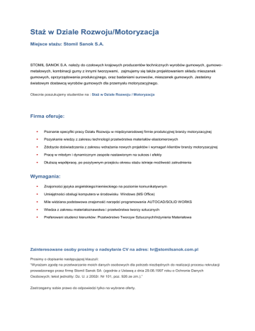 Staż w Dziale Rozwoju/Motoryzacja Miejsce stażu: Stomil Sanok S.A. STOMIL SANOK S.A. należy do czołowych krajowych producentów technicznych wyrobów gumowych, gumowometalowych, kombinacji gumy z innymi tworzywami, zajmujemy się także projektowaniem składu mieszanek gumowych, oprzyrządowania produkcyjnego, oraz badaniami surowców, mieszanek gumowych. Jesteśmy światowym dostawcą wyrobów gumowych dla przemysłu motoryzacyjnego. Obecnie poszukujemy studentów na : Staż w Dziale Rozwoju / Motoryzacja Firma oferuje: Poznanie specyfiki pracy Działu Rozwoju w międzynarodowej firmie produkcyjnej branży motoryzacyjnej Pozyskanie wiedzy z zakresu technologii przetwórstwa materiałów elastomerowych Zdobycie doświadczenia z zakresu wdrażania nowych projektów i wymagań klientów branży motoryzacyjnej Pracę w młodym i dynamicznym zespole nastawionym na sukces i efekty Dłuższą współpracę, po pozytywnym przejściu okresu stażu istnieje możliwość zatrudnienia Wymagania: Znajomości języka angielskiego/niemieckiego na poziomie komunikatywnym Umiejętności obsługi komputera w środowisku Windows (MS Office) Mile widziana podstawowa znajomość narzędzi programowania AUTOCAD/SOLID WORKS Wiedza z zakresu materiałoznawstwa i przetwórstwa tworzy sztucznych Preferowani studenci kierunków: Przetwórstwo Tworzyw Sztucznych/Inżynieria Materiałowa Zainteresowane osoby prosimy o nadsyłanie CV na adres: [email protected] Prosimy o dopisanie następującej klauzuli: “Wyrażam zgodę na przetwarzanie moich danych osobowych dla potrzeb niezbędnych do realizacji procesu rekrutacji prowadzonego przez firmę Stomil Sanok SA (zgodnie z Ustawą z dnia 29.08.1997 roku o Ochronie Danych Osobowych; tekst jednolity: Dz. U. z 2002r. Nr 101, poz. 926 ze zm.).” Zastrzegamy sobie prawo do odpowiedzi tylko na wybrane oferty.