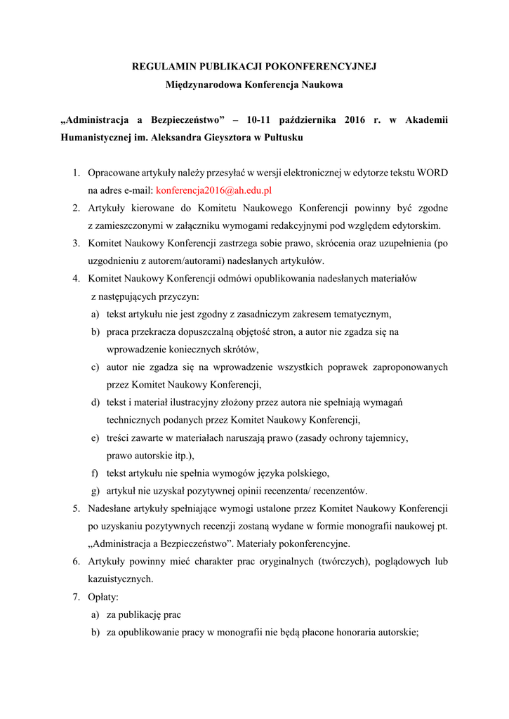 Regulamin publikacji pokonferencyjnej