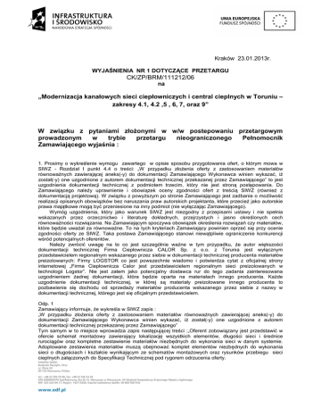 Kraków 23.01.2013r. WYJAŚNIENIA NR 1 DOTYCZĄCE PRZETARGU CK/ZP/BRM/111212/06 na „Modernizacja kanałowych sieci ciepłowniczych i central cieplnych w Toruniu – zakresy 4.1, 4.2 ,5 , 6, 7, oraz 9” W związku z pytaniami złożonymi w w/w postepowaniu przetargowym prowadzonym w trybie przetargu nieograniczonego Pełnomocnik Zamawiającego wyjaśnia : 1. Prosimy o wykreślenie wymogu zawartego w opisie sposobu przygotowania ofert, o którym mowa w SIWZ - Rozdział I punkt 4.4 o treści: „W przypadku złożenia oferty z zastosowaniem materiałów równoważnych zawierającej aneks(-y) do dokumentacji Zamawiającego Wykonawca winien wykazać, iż został(-y) one uzgodnione z autorem dokumentacji technicznej przekazanej przez Zamawiającego” to jest uzgodnienia dokumentacji technicznej z podmiotem trzecim, który nie jest stroną postępowania. Do Zamawiającego należy uprawnienie i obowiązek oceny zgodności ofert z treścią SIWZ (również z dokumentacją projektową). W związku z powyższym po stronie Zamawiającego jest zadbanie o możliwość realizacji opisanych obowiązków bez naruszania praw autorskich projektanta, które przecież jako autorskie prawa majątkowe mogą być przeniesione na inny podmiot (nie wyłączając Zamawiającego). Wymóg uzgodnienia, który jako warunek SIWZ jest niezgodny z przepisami ustawy i nie spełnia wskazanych przez orzecznictwo i literaturę dokładnych, przejrzystych i jasno określonych cech równoważności rozwiązania. Na Zamawiającym spoczywa obowiązek określenia rozwiązań czy materiałów, które będzie uważał za równoważne. To na tych kryteriach Zamawiający powinien oprzeć się przy ocenie zgodności oferty ze SIWZ. Taka postawa Zamawiającego stanowi niewątpliwie ograniczenie konkurencji wśród potencjalnych oferentów. Należy zwrócić uwagę na to co jest szczególnie ważne w tym przypadku, że autor większości dokumentacji technicznej Firma Ciepłownicza CALOR Sp. z o.o. z Torunia jest wyłącznym przedstawicielem regionalnym wskazanego przez siebie w dokumentacji technicznej producenta materiałów preizolowanych: Firmy LOGSTOR co jest powszechnie wiadomo i potwierdza cytat z oficjalnej strony internetowej „Firma Ciepłownicza Calor jest przedstawicielem regionalnym sieci preizolowanych w technologii Logstor”. Nie jest zatem jako potencjalny dostawca rur do tego zadania zainteresowana uzgodnieniem żadnej dokumentacji, która będzie oparta na materiałach innego producenta. Każde uzgodnienie dokumentacji technicznej, w której są materiały preizolowane innego producenta to pozbawienie się dochodu od sprzedaży materiałów producenta wskazanego przez siebie z nazwy w dokumentacji technicznej, którego jest się oficjalnym przedstawicielem. Odp. 1 Zamawiający informuje, że wykreśla w SIWZ zapis : „W przypadku złożenia oferty z zastosowaniem materiałów równoważnych zawierającej aneks(-y) do dokumentacji Zamawiającego Wykonawca winien wykazać, iż został(-y) one uzgodnione z autorem dokumentacji technicznej przekazanej przez Zamawiającego” Tym samym w to miejsce wprowadza zapis następującej treści :„Oferent zobowiązany jest przedstawić w ofercie schemat montażowy zawierający lokalizację wszystkich elementów, długości sieci i średnice rurociągów oraz kompletne zestawienie materiałów niezbędnych do wykonania sieci w danym systemie. Adoptowane zestawienia materiałów muszą obejmować komplet elementów niezbędnych do wykonania sieci o długościach i kształcie wynikającym ze schematów montażowych oraz rysunków przebiegu sieci cieplnych załączonych do Specyfikacji Technicznej pod rygorem odrzucenia oferty. W przypadku gdy zmiana technologii skutkowała będzie wymogiem uzyskania dodatkowych decyzji administracyjnych wykonawca zobowiązuje się do uzyskania takowych na własny koszt.” 2. Dotyczy pkt. 2 Instrukcji dla wykonawców i harmonogramów ramowych - załącznik nr 6. Czy Zamawiający dopuszcza wcześniejsze przygotowanie większych odcinków sieci na zewnątrz wykopu a w okresie wskazanym ułożenie ich w wykopie i podłączenie z obu stron? Odp.2 Tak, Zamawiający dopuszcza wcześniejsze przygotowanie większych odcinków sieci na zewnątrz wykopu a w okresie wskazanym ułożenie ich w wykopie i podłączenie z obu stron. 3. Dotyczy pkt. 3.1c Instrukcji dla wykonawców. Zamawiający postawił warunek: „Przedstawienie, że w okresie ostatnich 5 lat zrealizował należycie …” Proszę o odpowiedź na pytanie: W okresie ostatnich 5 lat przed ogłoszeniem o zamówieniu czy przed terminem składania ofert? Odp. 3 Zamawiający informuje, iż okres 5 lat przed ogłoszeniem o zamówieniu. 4. W nawiązaniu do §3 ust. 3 wzoru umowy prosimy o potwierdzenie, że płatności fakturami częściowymi za wykonanie poszczególnych etapów/rodzajów robót w ramach danego zadania będą odbywać się po ich wykonaniu zgodnie z datami przedstawionymi w harmonogramach ramowych i w wysokości zgodnej z % udziałem płatności względem całości kosztów zadania wskazanymi w załączniku nr 5 do SIWZ? Odp. 4 Zamawiający informuje, że płatności fakturami częściowymi za wykonanie poszczególnych etapów/rodzajów robót w ramach danego zadania będą odbywać się zgodnie z etapami i datami wskazanymi w Załączniku nr 4 – Formularz Cenowy, będący załącznikiem do Formularza Oferty, po dokonaniu potwierdzonych podpisanymi obustronnie protokołami odbioru. 5. W nawiązaniu do zapisów § 3 ust. 7 wzoru umowy prosimy o precyzyjne wskazanie jakie zastrzeżenia względem wykonanych robót uprawniają Zamawiającego do wstrzymania się od zapłaty faktur? Umowny zwrot "jakiekolwiek zastrzeżenia" jest zwrotem niedookreślonym. Jakie mają to być zastrzeżenia względem wykonanych robót. Powinny to być zastrzeżenia istotne, wymienione w umowie. Odp. 5 Zamawiający informuje, iż zmienia zapisy §3 ust. 7: Było: Jakiekolwiek zastrzeżenia względem wykonan