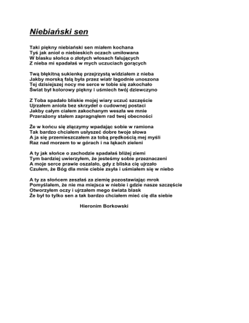 Niebiański sen Taki piękny niebiański sen miałem kochana Tyś jak anioł o niebieskich oczach umiłowana W blasku słońca o złotych włosach falujących Z nieba mi spadałaś w mych uczuciach gorących Twą błękitną sukienkę przejrzystą widziałem z nieba Jakby morską falą była przez wiatr łagodnie unoszona Tej dzisiejszej nocy me serce w tobie się zakochało Świat był kolorowy piękny i uśmiech twój dziewczyno Z Toba spadało bliskie mojej wiary uczuć szczęście Ujrzałem anioła bez skrzydeł o cudownej postaci Jakby całym ciałem zakochanym weszła we mnie Przerażony stałem zapragnąłem rad twej obecności Że w końcu się złączymy wpadając sobie w ramiona Tak bardzo chciałem usłyszeć dobre twoje słowa A ja się przemieszczałem za tobą prędkością mej myśli Raz nad morzem to w górach i na łąkach zieleni A ty jak słońce o zachodzie spadałaś bliżej ziemi Tym bardziej uwierzyłem, że jesteśmy sobie przeznaczeni A moje serce prawie oszalało, gdy z bliska cię ujrzało Czułem, że Bóg dla mnie ciebie zsyła i uśmiałem się w niebo A ty za słońcem zeszłaś za ziemię pozostawiając mrok Pomyślałem, że nie ma miejsca w niebie i gdzie nasze szczęście Otworzyłem oczy i ujrzałem mego świata blask Że był to tylko sen a tak bardzo chciałem mieć cię dla siebie Hieronim Borkowski