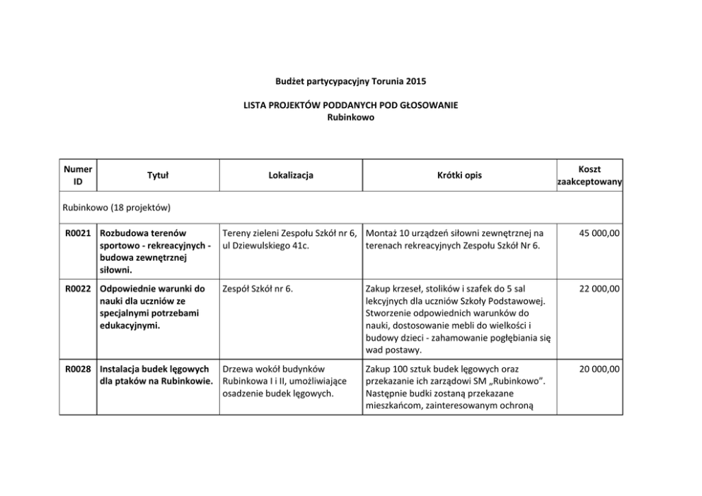 Budżet partycypacyjny Torunia 2015 LISTA PROJEKTÓW PODDANYCH POD GŁOSOWANIE Rubinkowo Numer ID Tytuł Lokalizacja Krótki opis Koszt zaakceptowany Rubinkowo (18 projektów) R0021 Rozbudowa terenów sportowo - rekreacyjnych budowa zewnętrznej siłowni. Tereny zieleni Zespołu Szkół nr 6, Montaż 10 urządzeń siłowni zewnętrznej na ul Dziewulskiego 41c. terenach rekreacyjnych Zespołu Szkół Nr 6. 45 000,00 R0022 Odpowiednie warunki do nauki dla uczniów ze specjalnymi potrzebami edukacyjnymi. Zespół Szkół nr 6. Zakup krzeseł, stolików i szafek do 5 sal lekcyjnych dla uczniów Szkoły Podstawowej. Stworzenie odpowiednich warunków do nauki, dostosowanie mebli do wielkości i budowy dzieci - zahamowanie pogłębiania się wad postawy. 22 000,00 Zakup 100 sztuk budek lęgowych oraz przekazanie ich zarządowi SM „Rubinkowo”. Następnie budki zostaną przekazane mieszkańcom, zainteresowanym ochroną 20 000,00 R0028 Instalacja budek lęgowych Drzewa wokół budynków dla ptaków na Rubinkowie. Rubinkowa I i II, umożliwiające osadzenie budek lęgowych. przyrody celem zawieszenia na wytypowanych większych drzewach. Realizacja możliwa pod warunkiem uzyskania zgody właściciela terenu. R0029 Przebudowa drogi dojazdowej na ul. Wierzbowej. Ul. Wierzbowa. Wykonanie twardej nawierzchni (kruszywo) całej ul. Wierzbowej (odcinek ok. 500 m) umożliwiający swobodny dojazd do działek ROD i garaży. 141 000,00 R0030 Szkoła Dziecięcych Marzeń. Zespół Szkół nr 31, ul. Dziewulskiego 41B. Zakup pomocy dydaktycznych (min. laptopy, programy multimedialne i edukacyjne, materiały do diagnozy zaburzeń rozwoju) oraz mebli do 8 sal przeznaczonych dla dzieci klas 0-III oddziałów integracyjnych dla dzieci z autyzmem. W sali rekreacji „Radosna szkoła” zostanie zainstalowany basen z piłkami, huśtawki oraz rowerki i hulajnogi dla młodszych dzieci. 40 500,00 R0031 Rewitalizacja terenu zieleni Teren zieleni zlokalizowany przy ul. Klonowej. pomiędzy mostkami (nad ciepłociągiem oraz nad Strugą Toruńską) w ciągu ul. Klonowej. Uporządkowanie terenu, odchwaszczenie i posianie trawy, pielęgnacja istniejącej zieleni i ewentualnie drobne nasadzenia. Budowa 2 alejek utwardzonych tłuczniem. Montaż ławek i koszy na śmieci. Remont oświetlenia ulicznego. 50 000,00 R0033 Wybieg dla psów z udziałem behawiorysty Uporządkowanie terenu całej łąki. Montaż 3 murowanych grilli, 3 stołów drewnianych i 6 Ul. Rydygiera 38, łąka naprzeciwko bloków przy ul. 105 000,00 oraz miejsce spotkań młodzieży. Kasztanowej - między Strugą Toruńską a ogrodami działkowymi - obok Torseedu. ławek, koszy na śmieci oraz 2 stołów do ping ponga i 1 do gry w szachy. Ponadto zostaną powieszone siatki oraz pomalowane linie na istniejącym boisku piłkarskim. Posadzenie 10 drzewek tui. Przygotowany zostanie wybieg dla psów z osobnym wejściem (teren odgrodzony od reszty placu) z 2 ławkami i pojemnikami na odchody. Na wybiegu zostanie zatrudniony behawiorysta. R0036 Boisko wielofunkcyjne na Rubinkowie. Boisko przy Rydygiera 42 (dz. 7/25). Stworzenie, na bazie istniejącego boiska, boiska wielofunkcyjnego (koszówka, tenis, siatkówka, piłka ręczna, unihokej) o nawierzchni poliuretanowej wraz z ogrodzeniem. Realizacja możliwa pod warunkiem uzyskania zgody właściciela terenu. R0037 Wyginam ciało śmiało siłownia zewnętrzna. Ul. Dziewulskiego 41b, Zespół Szkół nr 31. Zakup 12 stanowisk treningowych odpowiednich zarówno dla dzieci i młodzieży, jak i dorosłych oraz seniorów. 45 000,00 R0038 Rewitalizacja alei przed Zespołem Szkół nr 8, etap drugi. Aleja łącząca Szkołę nr 8 z ul. Łyskowskiego, odcinek od wejścia głównego, w stronę północną, w kierunku ul. Klonowej, do mostka na Baszce. Wymiana nawierzchni chodnika na kostkę brukową. Wymiana istniejących ławek, koszy na śmieci, oświetlenia ulicznego oraz rewitalizacja terenu zieleni. Realizacja możliwa pod warunkiem uzyskania zgody właściciela terenu. 225 000,00 300 000,00 R0039 Zagospodarowanie Zespołu Szkół nr 16 im. Wandy przestrzeni wokół Zespołu Szuman ul. Dziewulskiego 2. Szkół nr 16 do celów rekreacyjnych dla uczniów i mieszkańców Rubinkowa. Ułożenie kolorowej kostki brukowej w taki sposób, aby przedstawiała tor przeszkód, grę „planszową”, klasy czy szachownicę. Montaż ławek i betonowych stołów do gry w tenisa stołowego, szachy, chińczyka. Budowa toru do mini golfa oraz ustawienie trybun przy boisku sportowym. Zakup dużych szachów. Zagospodarowanie terenów zielonych. 261 000,00 R0041 Rewitalizacja terenów Tereny zielone przylegające do przylegających do Fortu II Fortu II wzdłuż odcinka ul. im. Stefana Czarnieckiego Rydygiera oraz ul. Mocarskiego. wraz z budową ścianki do wspinaczki boulderingowej. Wykonanie ścieżek spacerowych z kostki brukowej. Instalacja 8 ławek oraz 12 koszy na śmieci. Budowa ścianki do wspinaczki boulderingowej w formie obelisku. 120 000,00 R0042 Wyposażenie ogrodu Osiedle Rubinkowo; teren żłobka w zabawki ogrodu Żłobka Miejskiego nr 2. ogrodowe w celu utworzenia całorocznego bezpiecznego dla małych dzieci placu zabaw wraz z wymianą betonowego chodnika wewnątrz ogrodu na bezpieczną nawierzchnię typu tartan lub płyty kauczukowe gwarantujące bezpieczne przemieszczanie się małych dzieci. W ramach projektu zostanie urządzona specjalna strefa zabaw dla małych dzieci wyposażona w zabawki ogrodowe zamontowane na stałe. Wykonanie nawierzchni tartanowej lub z płyt kauczukowych. Montaż ławek, koszy na śmieci i stojaków dla rowerów. 100 000,00 R0043 Mural. Wieżowiec - ul. Rydygiera 28. Ściana południowa. Wykonanie muralu przedstawiającego postać Jakuba Kazimierza Rubinkowskiego oraz inne elementy historyczne. Wykonawca (w tym autor projektu) zostanie wyłoniony w trybie publicznego naboru ofert. Realizacja możliwa pod warunkiem uzyskania zgody właściciela terenu. 38 000,00 R0044 Era komputera doposażenie prac