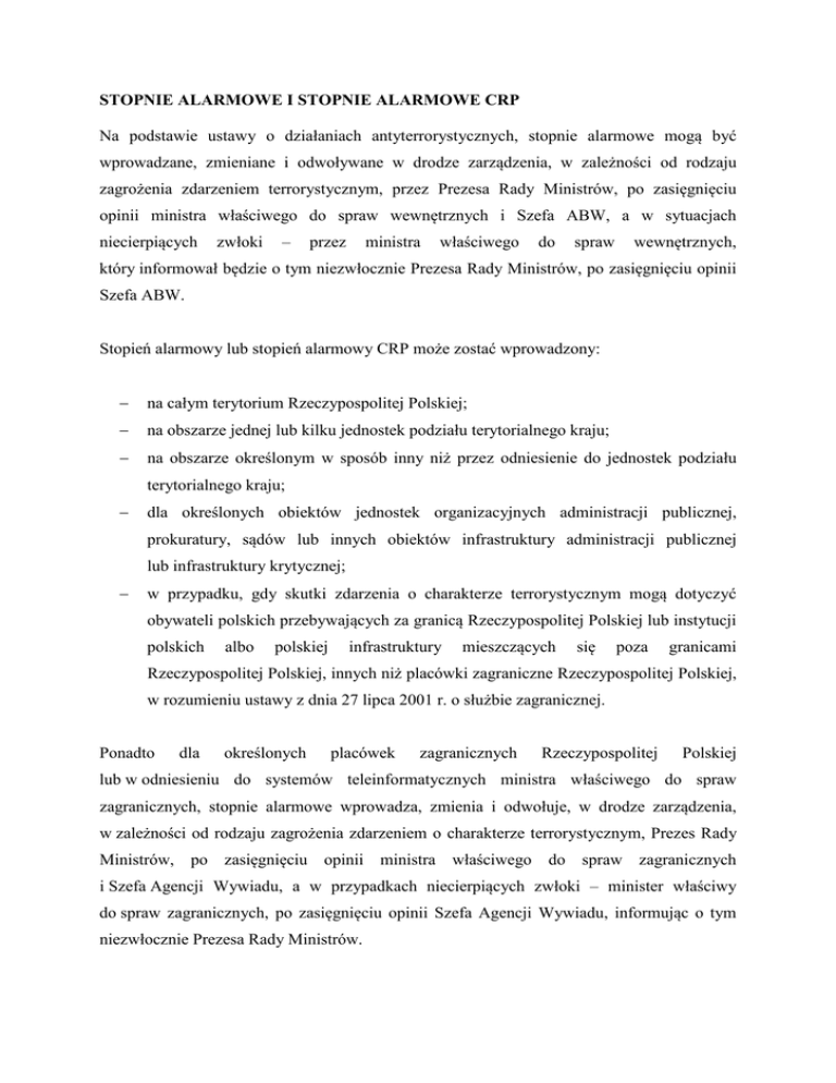 STOPNIE ALARMOWE I STOPNIE ALARMOWE CRP Na podstawie ustawy o działaniach antyterrorystycznych, stopnie alarmowe mogą być wprowadzane, zmieniane i odwoływane w drodze zarządzenia, w zależności od rodzaju zagrożenia zdarzeniem terrorystycznym, przez Prezesa Rady Ministrów, po zasięgnięciu opinii ministra właściwego do spraw wewnętrznych i Szefa ABW, a w sytuacjach niecierpiących zwłoki – przez ministra właściwego do spraw wewnętrznych, który informował będzie o tym niezwłocznie Prezesa Rady Ministrów, po zasięgnięciu opinii Szefa ABW. Stopień alarmowy lub stopień alarmowy CRP może zostać wprowadzony: − na całym terytorium Rzeczypospolitej Polskiej; − na obszarze jednej lub kilku jednostek podziału terytorialnego kraju; − na obszarze określonym w sposób inny niż przez odniesienie do jednostek podziału terytorialnego kraju; − dla określonych obiektów jednostek organizacyjnych administracji publicznej, prokuratury, sądów lub innych obiektów infrastruktury administracji publicznej lub infrastruktury krytycznej; − w przypadku, gdy skutki zdarzenia o charakterze terrorystycznym mogą dotyczyć obywateli polskich przebywających za granicą Rzeczypospolitej Polskiej lub instytucji polskich albo polskiej infrastruktury mieszczących się poza granicami Rzeczypospolitej Polskiej, innych niż placówki zagraniczne Rzeczypospolitej Polskiej, w rozumieniu ustawy z dnia 27 lipca 2001 r. o służbie zagranicznej. Ponadto dla określonych placówek zagranicznych Rzeczypospolitej Polskiej lub w odniesieniu do systemów teleinformatycznych ministra właściwego do spraw zagranicznych, stopnie alarmowe wprowadza, zmienia i odwołuje, w drodze zarządzenia, w zależności od rodzaju zagrożenia zdarzeniem o charakterze terrorystycznym, Prezes Rady Ministrów, po zasięgnięciu opinii ministra właściwego do spraw zagranicznych i Szefa Agencji Wywiadu, a w przypadkach niecierpiących zwłoki – minister właściwy do spraw zagranicznych, po zasięgnięciu opinii Szefa Agencji Wywiadu, informując o tym niezwłocznie Prezesa Rady Ministrów. Stopień alarmowy1 pierwszy stopień alarmowy (stopień ALFA) drugi stopień alarmowy (stopień BRAVO) trzeci stopień alarmowy (stopień CHARLIE) czwarty stopień alarmowy (stopień DELTA) Stopień alarmowy CRP2 pierwszy stopień alarmowy CRP (stopień ALFA–CRP) Przesłanki do wprowadzenia stopnia alarmowego W przypadku uzyskania informacji o możliwości wystąpienia zdarzenia o charakterze terrorystycznym, którego rodzaj i zakres jest trudny do przewidzenia. W przypadku zaistnienia zwiększonego i przewidywalnego drugi stopień alarmowy zagrożenia wystąpieniem zdarzenia o charakterze CRP terrorystycznym, jednak konkretny cel ataku nie został (stopień BRAVO–CRP) zidentyfikowany. W przypadku: 1) wystąpienia zdarzenia potwierdzającego prawdopodobny cel ataku o charakterze terrorystycznym, godzącego w: a) bezpieczeństwo lub porządek publiczny, albo b) bezpieczeństwo Rzeczypospolitej Polskiej, albo c) bezpieczeństwo innego państwa lub organizacji międzynarodowej oraz stwarzającego potencjalne trzeci stopień alarmowy zagrożenie dla Rzeczypospolitej Polskiej, lub CRP 2) uzyskania wiarygodnych i potwierdzonych informacji o planowanym zdarzeniu o charakterze terrorystycznym (stopień CHARLIE–CRP) na terytorium Rzeczypospolitej Polskiej, lub 3) uzyskania wiarygodnych i potwierdzonych informacji o planowanym zdarzeniu o charakterze terrorystycznym, którego skutki mogą dotyczyć obywateli polskich przebywających za granicą lub instytucji polskich albo polskiej infrastruktury mieszczących się poza granicami Rzeczypospolitej Polskiej. W przypadku: 1) wystąpienia zdarzenia o charakterze terrorystycznym powodującego zagrożenie: a) bezpieczeństwa lub porządku publicznego, albo b) bezpieczeństwa Rzeczypospolitej Polskiej, albo c) bezpieczeństwa innego państwa lub organizacji międzynarodowej oraz stwarzającego zagrożenie dla Rzeczypospolitej Polskiej, lub czwarty stopień alarmowy 2) gdy uzyskane informacje wskazują na zaawansowaną fazę CRP przygotowań do zdarzenia o charakterze terrorystycznym na terytorium Rzeczypospolitej Polskiej, lub (stopień DELTA–CRP) 3) gdy uzyskane informacje wskazują na zaawansowaną fazę przygotowań do zdarzenia o charakterze terrorystycznym, które ma być wymierzone w obywateli polskich przebywających za granicą lub w instytucje polskie albo polską infrastrukturę mieszczące się poza granicami Rzeczypospolitej Polskiej, a zebrane informacje wskazują jednocześnie na nieuchronność takiego zdarzenia 1 Wprowadzany w przypadku zagrożenia wystąpieniem zdarzenia o charakterze terrorystycznym albo w przypadku wystąpienia takiego zdarzenia. 2 Wprowadzany w przypadku zagrożenia wystąpieniem zdarzenia o charakterze terrorystycznym dotyczącego systemów teleinformatycznych organów administracji publicznej lub systemów teleinformatycznych wchodzących w skład infrastruktury krytycznej albo w przypadku wystąpienia takiego zdarzenia. Źródło: http://www.antyterroryzm.gov.pl/CAT/stopnie-alarmowe/858,Stopnie-alarmowe-i-stopnie-alarmowe-crp.html