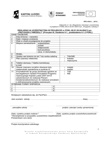 POWIAT BYDGOSKI RFE-I.042.8…..2013/… Załącznik nr 1 do „Regulaminu rekrutacji i uczestnictwa w projekcie nr POKL-09.01.02.04--094/13 pn. „Przygoda z wiedzą 2” DEKLARACJA UCZESTNICTWA W PROJEKCIE nr POKL.09.01.02-04-094/13 pn. „PRZYGODA Z WIEDZĄ 2” (Priorytet IX, Działanie 9.1., poddziałanie 9.1.2 POKL) DANE OSOBOWE 1 Imię (imiona) i nazwisko 2 Data i miejsce urodzenia 3 Wiek w chwili przystąpienia do projektu 4 Miejsce zamieszkania województwo powiat miejscowość kod pocztowy ulica, nr domu/lokalu 5 PESEL 6 Opieka nad dziećmi do lat 7 lub osoba zależną o TAK/NIE 7 Płeć (zaznacz właściwe) o kobieta o mężczyzna 8 Telefon domowy / Telefon komórkowy 9 e-mail 10 Obszar (zaznacz na jakim obszarze leży o miejski miejscowość wymieniona w punkcie 4) o wiejski o TAK 11 Przynależność do grupy docelowej zgodnie ze o NIE Szczegółowym Opisem Priorytetów Programu Operacyjnego Kapitał Ludzki 2007-2013/ zatwierdzonym do realizacji Planem Działania/zatwierdzonym do realizacji wnioskiem o dofinansowanie projektu (zaznaczyć) WYBRANE FORMY WSPARCIA 1 4 2 5 3 6 Niniejszym zaświadcza się, że Pan/Pani:…………………………………………….…………...………… Jest uczniem szkoły: ……………………………………………………………………. klasy …………… …………………………….. pieczątka szkoły .……………………………………………………… podpis i pieczęć osoby uprawnionej ……....……………………………………………… .............................................................................. Data, czytelny podpis rodzica/ * Data, czytelny podpis uczestnika/uczestniczki *Obowiązkowe w przypadku uczestników niepełnoletnich Potwierdzam w/w dane: ……………………………… Podpis koordynatora szkolnego 1 P r o j e k t w s p ó ł f i n a n s o w a n y p r z e z U n i ę E u r o p e j s k ą w r a m a c h E u r o p e j s k i e g o F u n d u s z u S p o ł e c z n e g o POWIAT BYDGOSKI RFE-I.042.8…..2013/… 1. Wyrażam zgodę na uczestnictwo w Projekcie „Przygoda z wiedzą 2”, realizowanym przez Powiat Bydgoski w ramach Priorytetu IX, działania 9.2, poddziałania 9.1.2 „Wyrównanie szans edukacyjnych uczniów z grup o utrudnionym dostępie do edukacji oraz zmniejszanie różnic w jakości usług edukacyjnych” Programu Operacyjnego Kapitał Ludzki od 01.11.2013 do 30.07.2015 r. 2. Zapoznałem/łam się i akceptuję Regulamin rekrutacji i uczestnictwa w projekcie i zgodnie z jego zapisami jestem uprawniony/a do uczestnictwa w projekcie. 3. Zostałem/łam poinformowany/na, że projekt jest finansowany ze środków Unii Europejskiej z Europejskiego Funduszu Społecznego oraz w ramach Programu Operacyjnego Kapitał Ludzki. 4. Mam świadomość, że zajęcia mogą odbywać się poza szkołą oraz w miejscowości innej od mojego miejsca zamieszkania. 5. W przypadku mojej rezygnacji z projektu w trakcie trwania wybranej przeze mnie formy wsparcia, zobowiązuję się do zwrotu kosztów za wszystkie otrzymane w ramach projektu materiały dydaktyczne. 6. Oświadczam, że dane osobowe podane przeze mnie w związku z ubieganiem się o udział w projekcie są prawdziwe i zostałem/łam pouczony/a o odpowiedzialności za składanie oświadczeń niezgodnych z prawdą. ……....……………………………………………… .............................................................................. Data, czytelny podpis rodzica/ * Data, czytelny podpis uczestnika/uczestniczki *Obowiązkowe w przypadku uczestników niepełnoletnich OŚWIADCZENIE UCZESTNIKA PROJEKTU O WYRAŻENIU ZGODY NA PRZETWARZANIE DANYCH OSOBOWYCH W związku z przystąpieniem do projektu pn. „Przygoda z wiedzą 2” oświadczam, że przyjmuję do wiadomości, iż: 1) administratorem moich danych osobowych jest Minister Rozwoju Regionalnego pełniący funkcję Instytucji Zarządzającej dla Programu Operacyjnego Kapitał Ludzki, mający siedzibę przy ul. Wspólnej 2/4, 00-926 Warszawa. 2) podstawę prawną przetwarzania moich danych osobowych stanowi art. 23 ust. 1 pkt 2 lub art. 27 ust. 2 pkt 2 ustawy z dnia 29 sierpnia 1997 r. o ochronie danych osobowych (tekst jednolity: Dz.U. z 2002 r. Nr 101 poz. 926, ze zm.) – dane osobowe są niezbędne dla realizacji Programu Operacyjnego Kapitał Ludzki 3) moje dane osobowe będą przetwarzane wyłącznie w celu udzielenia wsparcia, realizacji projektu „Przygoda z wiedzą 2”, ewaluacji, kontroli, monitoringu i sprawozdawczości w ramach Programu Operacyjnego Kapitał Ludzki (POKL); 4) moje dane osobowe zostały powierzone do przetwarzania Instytucji Wdrażającej/Instytucji Pośredniczącej – Województwu Kujawsko-Pomorskiemu, z siedzibą w Toruniu, ul. M. SkłodowskiejCurie 73 oraz beneficjentowi realizującemu projekt „Przygoda z wiedzą 2” - Powiatowi Bydgoskiemu z siedzibą w Bydgoszczy, ul. Konarskiego 1-3. Moje dane osobowe mogą zostać udostępnione firmom badawczym realizującym na zlecenie Instytucji Zarządzającej POKL, Instytucji Wdrażającej/Instytucji Pośredniczącej lub beneficjenta badania ewaluacyjne w ramach POKL oraz specjalistycznym firmom realizującym na zlecenie Instytucji Zarządzającej POKL lub Instytucji Wdrażającej/Instytucji Pośredniczącej kontrole w ramach POKL; 5) podanie danych jest dobrowolne, aczkolwiek odmowa ich podania jest równoznaczna z brakiem możliwości udzielenia wsparcia w ramach Projektu; 6) mam prawo dostępu do treści swoich danych i ich poprawiania. ………………………………………………… ............................................................... Miejscowość, data, czytelny podpis rodzica * Miejscowość, data, czytelny podpis uczestnika/-czki *Obowiązkowe w przypadku uczestników niepełnoletnich 2 P r o j e k t w s p ó ł f i n a n s o w a n y p r z e z U n i ę E u r o p e j s k ą w r a m a c h E u r o p e j s k i e g o F u n d u s 