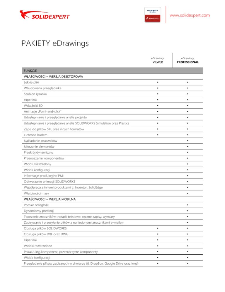 www.solidexpert.com PAKIETY eDrawings eDrawings VIEWER eDrawings PROFESSIONAL • • • • • • • • • • • • • • • • • • • • • • • • • • • • • • FUNKCJE WŁAŚCIWOŚCI – WERSJA DESKTOPOWA Lekkie pliki Wbudowana przeglądarka Szablon rysunku Hiperlinki Wskaźniki 3D Animacje „Point-and-click” Udostępnianie i przeglądanie analiz projektu Udostepnianie i przeglądanie analiz SOLIDWORKS Simulation oraz Plastics Zapis do plików STL oraz innych formatów Ochrona hasłem Nakładanie znaczników Mierzenie elementów Przekrój dynamiczny Przenoszenie komponentów Widok rozstrzelony Widok konfiguracji Informacje produkcyjne PMI Odtwarzanie animacji SOLIDWORKS Współpraca z innymi produktami tj. Inventor, SolidEdge Właściwości masy WŁAŚCIWOŚCI – WERSJA MOBILNA Pomiar odległości Dynamiczny przekrój Tworzenie znaczników: notatki tekstowe, ręczne zapisy, wymiary Zapisywanie i przesyłanie plików z naniesionymi znacznikami e-mailem Obsługa plików SOLIDWORKS Obsługa plików DXF oraz DWG Hiperlinki Widoki rozstrzelone Pokaż/ukryj komponent, przezroczyste komponenty Widok konfiguracji Przeglądanie plików zapisanych w chmurze (tj. DropBox, Google Drive oraz inne) • • • • • • • • • • • • • • • • • •