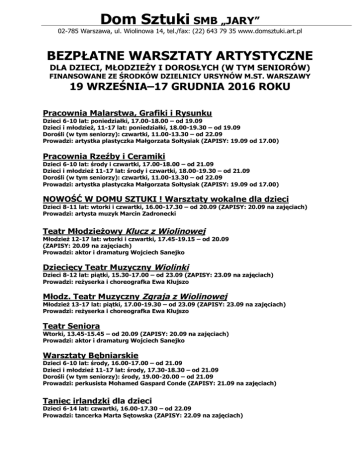 Dom Sztuki SMB „JARY” 02-785 Warszawa, ul. Wiolinowa 14, tel./fax: (22) 643 79 35 www.domsztuki.art.pl BEZPŁATNE WARSZTATY ARTYSTYCZNE DLA DZIECI, MŁODZIEŻY I DOROSŁYCH (W TYM SENIORÓW) FINANSOWANE ZE ŚRODKÓW DZIELNICY URSYNÓW M.ST. WARSZAWY 19 WRZEŚNIA–17 GRUDNIA 2016 ROKU Pracownia Malarstwa, Grafiki i Rysunku Dzieci 6-10 lat: poniedziałki, 17.00-18.00 – od 19.09 Dzieci i młodzież, 11-17 lat: poniedziałki, 18.00-19.30 – od 19.09 Dorośli (w tym seniorzy): czwartki, 11.00-13.30 – od 22.09 Prowadzi: artystka plastyczka Małgorzata Sołtysiak (ZAPISY: 19.09 od 17.00) Pracownia Rzeźby i Ceramiki Dzieci 6-10 lat: środy i czwartki, 17.00-18.00 – od 21.09 Dzieci i młodzież 11-17 lat: środy i czwartki, 18.00-19.30 – od 21.09 Dorośli (w tym seniorzy): czwartki, 11.00-13.30 – od 22.09 Prowadzi: artystka plastyczka Małgorzata Sołtysiak (ZAPISY: 19.09 od 17.00) NOWOŚĆ W DOMU SZTUKI ! Warsztaty wokalne dla dzieci Dzieci 8-11 lat: wtorki i czwartki, 16.00-17.30 – od 20.09 (ZAPISY: 20.09 na zajęciach) Prowadzi: artysta muzyk Marcin Zadronecki Teatr Młodzieżowy Klucz z Wiolinowej Młodzież 12-17 lat: wtorki i czwartki, 17.45-19.15 – od 20.09 (ZAPISY: 20.09 na zajęciach) Prowadzi: aktor i dramaturg Wojciech Sanejko Dziecięcy Teatr Muzyczny Wiolinki Dzieci 8-12 lat: piątki, 15.30-17.00 – od 23.09 (ZAPISY: 23.09 na zajęciach) Prowadzi: reżyserka i choreografka Ewa Kłujszo Młodz. Teatr Muzyczny Zgraja z Wiolinowej Młodzież 13-17 lat: piątki, 17.00-19.30 – od 23.09 (ZAPISY: 23.09 na zajęciach) Prowadzi: reżyserka i choreografka Ewa Kłujszo Teatr Seniora Wtorki, 13.45-15.45 – od 20.09 (ZAPISY: 20.09 na zajęciach) Prowadzi: aktor i dramaturg Wojciech Sanejko Warsztaty Bębniarskie Dzieci 6-10 lat: środy, 16.00-17.00 – od 21.09 Dzieci i młodzież 11-17 lat: środy, 17.30-18.30 – od 21.09 Dorośli (w tym seniorzy): środy, 19.00-20.00 – od 21.09 Prowadzi: perkusista Mohamed Gaspard Conde (ZAPISY: 21.09 na zajęciach) Taniec irlandzki dla dzieci Dzieci 6-14 lat: czwartki, 16.00-17.30 – od 22.09 Prowadzi: tancerka Marta Sętowska (ZAPISY: 22.09 na zajęciach)