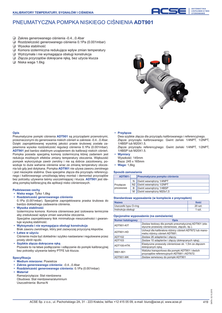 KALIBRATORY TEMPERATURY, SYGNAŁÓW I CIŚNIENIA PNEUMATYCZNA POMPKA NISKIEGO CIŚNIENIA ADT901 Zakres generowanego ciśnienia -0.4...0.4bar Rozdzielczość generowanego ciśnienia 0.1Pa (0.001mbar) Wysoka stabilność Komora izotermiczna redukująca wpływ zmian temperatury Wytrzymała i nie wymagająca obsługi konstrukcja Złącza przyrządów dokręcane ręką, bez użycia klucza Niska waga 1.6kg Opis Pneumatyczne pompki ciśnienia ADT901 są przyrządami przenośnymi, przeznaczonymi do generowania niskich ciśnień w zakresie -0.4...0.4bar. Dzięki zaprojektowanej wysokiej jakości prasie śrubowej została zapewniona wysoka rozdzielczość regulacji ciśnienia 0.1Pa (0.001mbar). ADT901 jest bardzo stabilnym urządzeniem do kalibracji niskich ciśnień. Pompka posiada specjalną komorę izotermiczną której zadaniem jest redukcja możliwych efektów zmiany temperatury otoczenia. Większość pompek wykorzystuje zawór zwrotny i nie są dobrze zaizolowany, powoduje to duże wahania ciśnienia wraz ze zmianą temperatury otoczenia lub gdy jest dotykana. Pompka ADT901 nie używa zaworu zwrotnego i jest niezwykle stabilna. Dwa specjalne złącza dla przyrządu referencyjnego i kalibrowanego umożliwiają łatwy montaż i demontaż przyrządów bez potrzeby używania taśmy uszczelniającej i klucza. ADT901 jest idealną pompką kalibracyjną dla aplikacji nisko ciśnieniowych. Podstawowe cechy • Niska waga: Tylko 1,6kg • Rozdzielczość generowanego ciśnienia 0.1Pa (0.001mbar). Specjalnie zaprojektowana praska śrubowa do bardzo dokładnego zadawania ciśnienia. • Wysoka stabilność Izotermiczna komora: Komora ciśnieniowa jest izolowana termicznie aby zredukować wpływ zmian warunków otoczenia. Specjalne zaprojektowany tłok minimalizuje nieszczelności i gwarantuje wysoką stabilność. • Wytrzymała i nie wymagająca obsługi konstrukcja Brak zaworu zwrotnego, który jest zazwyczaj przyczyną kłopotów. • Łatwa w użyciu Ciśnienie może być dokładnie i szybko nastawiane i regulowane przez prosty obrót rączki. • Szybkie złącza dokręcane ręką Pozwala to na łatwe podłączanie i odłączanie do pompki kalibracyjnej bez potrzeby używania taśmy PTFE lub klucza. Specyfikacja • Medium mierzone: Powietrze • Zakres generowanego ciśnienia: -0.4...0.4bar • Rozdzielczość generowanego ciśnienia: 0.1Pa (0.001mbar) • Materiał Rama/przyłącza: Stal nierdzewna Obudowa: Stal nierdzewna/aluminium Uszczelnienia: Buma-N • Przyłącza Dwa szybkie złącza dla przyrządu kalibrowanego i referencyjnego. Złącze przyrządu kalibrowanego: Gwint żeński 1/4NPT, 1/2NPT, 1/4BSP lub M20X1.5. Złącze przyrządu referencyjnego: Gwint żeński 1/4NPT, 1/2NPT, 1/4BSP lub M20X1.5. • Wymiary Wysokość: 145mm Baza: 245 x 165mm • Waga: 1,6kg Sposób zamawiania ADT901Przyłącze procesowe Pneumatyczna pompka ciśnienia N N2 B M Gwint wewnętrzny 1/4NPT Gwint wewnętrzny 1/2NPT Gwint wewnętrzny 1/4BSP Gwint wewnętrzny M20x1,5 Standardowe wyposażenie (w komplecie z przyrządem) Nazwa Uszczelki typu O-ring Instrukcja obsługi Ilość 20 szt. 1 szt. Opcjonalne wyposażenie (na zamówienie) Numer katalogowy ADT901-KIT ADT901-HD ADT102 ADT103 ADT100-HTK 9901-901 ADT901-MK Opis Zestaw testowy dla pompki pneumatycznej ADT901 (elastyczne przewody ciśnieniowe, złączki, itp.). Uchwyt dla kalibratora różnicy ciśnień ADT672 lub manometru różnicy ciśnień ADT681. Zestaw 26 adapterów i złączy. Zestaw 10 adapterów i złączy (dokręcanych ręką). Elastyczne przewody ciśnieniowe ok. 1,5m ze złączem dokręcanym ręką. Walizka transportowa dla pompki ADT901 i dwóch przyrządów referencyjnych ADT681 i ADT672. Zestaw serwisowy do pompki ADT901 ACSE Sp. z o.o., ul. Pachońskiego 2A, 31 - 223 Kraków, tel/fax +12 415 05 09, e-mail: [email protected], www.acse.pl 419 DATA: 02.10.2015