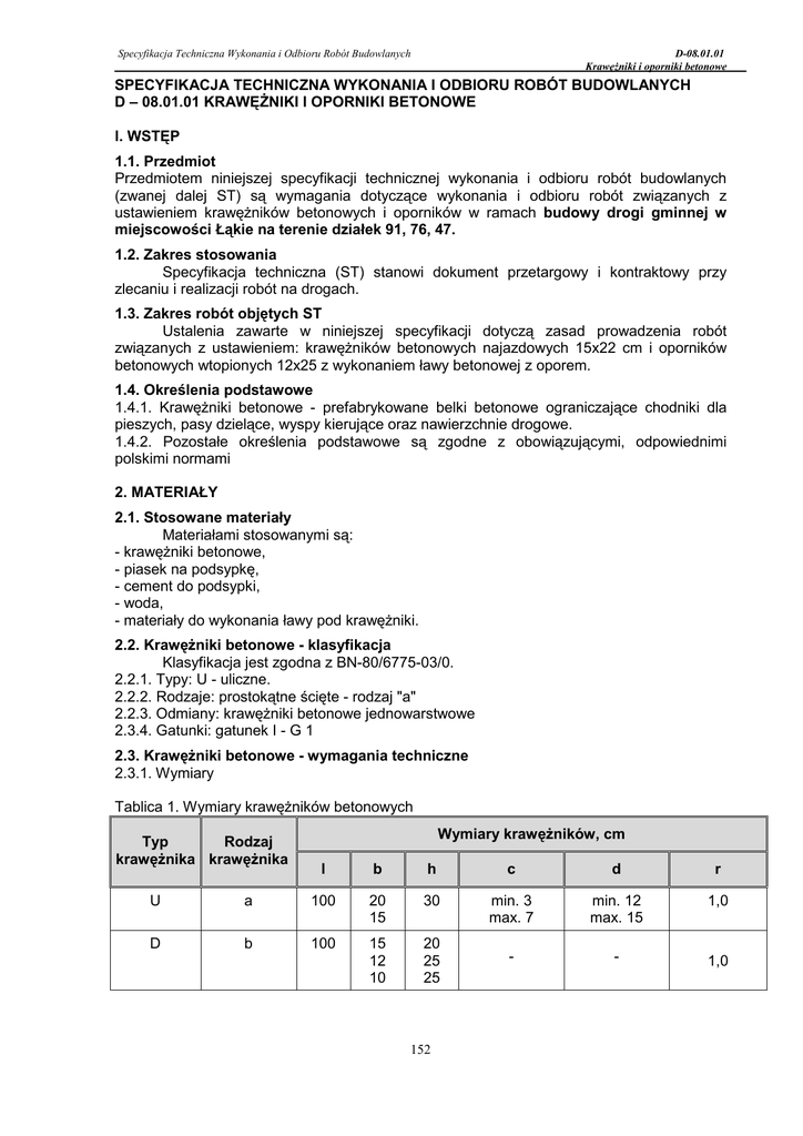 Specyfikacja Techniczna Wykonania i Odbioru Robót Budowlanych D-08.01.01 KrawęŜniki i oporniki betonowe SPECYFIKACJA TECHNICZNA WYKONANIA I ODBIORU ROBÓT BUDOWLANYCH D – 08.01.01 KRAWĘśNIKI I OPORNIKI BETONOWE l. WSTĘP 1.1. Przedmiot Przedmiotem niniejszej specyfikacji technicznej wykonania i odbioru robót budowlanych (zwanej dalej ST) są wymagania dotyczące wykonania i odbioru robót związanych z ustawieniem krawęŜników betonowych i oporników w ramach budowy drogi gminnej w miejscowości Łąkie na terenie działek 91, 76, 47. 1.2. Zakres stosowania Specyfikacja techniczna (ST) stanowi dokument przetargowy i kontraktowy przy zlecaniu i realizacji robót na drogach. 1.3. Zakres robót objętych ST Ustalenia zawarte w niniejszej specyfikacji dotyczą zasad prowadzenia robót związanych z ustawieniem: krawęŜników betonowych najazdowych 15x22 cm i oporników betonowych wtopionych 12x25 z wykonaniem ławy betonowej z oporem. 1.4. Określenia podstawowe 1.4.1. KrawęŜniki betonowe - prefabrykowane belki betonowe ograniczające chodniki dla pieszych, pasy dzielące, wyspy kierujące oraz nawierzchnie drogowe. 1.4.2. Pozostałe określenia podstawowe są zgodne z obowiązującymi, odpowiednimi polskimi normami 2. MATERIAŁY 2.1. Stosowane materiały Materiałami stosowanymi są: - krawęŜniki betonowe, - piasek na podsypkę, - cement do podsypki, - woda, - materiały do wykonania ławy pod krawęŜniki. 2.2. KrawęŜniki betonowe - klasyfikacja Klasyfikacja jest zgodna z BN-80/6775-03/0. 2.2.1. Typy: U - uliczne. 2.2.2. Rodzaje: prostokątne ścięte - rodzaj "a" 2.2.3. Odmiany: krawęŜniki betonowe jednowarstwowe 2.3.4. Gatunki: gatunek I - G 1 2.3. KrawęŜniki betonowe - wymagania techniczne 2.3.1. Wymiary Tablica 1. Wymiary krawęŜników betonowych Typ Rodzaj krawęŜnika krawęŜnika Wymiary krawęŜników, cm l b h c d r min. 3 max. 7 min. 12 max. 15 1,0 - - 1,0 U a 100 20 15 30 D b 100 15 12 10 20 25 25 152 Specyfikacja Techniczna Wykonania i Odbioru Robót Budowlanych D-08.01.01 KrawęŜniki i oporniki betonowe Tablica 2. Dopuszczalne odchyłki wymiarów krawęŜników betonowych Rodzaj wymiaru Dopuszczalna odchyłka, mm Gatunek I Gatunek II l ±8 ± 12 b, h ±3 ±3 2.3.2. Dopuszczalne wady i uszkodzenia Powierzchnie krawęŜników betonowych powinny być bez rys, pęknięć i ubytków betonu, o fakturze z formy lub zatartej. Krawędzie elementów powinny być równe i proste. Dopuszczalne wady oraz uszkodzenia powierzchni i krawędzi elementów, zgodnie z BN80/6775-03/01, nie powinny przekraczać wartości podanych w tablicy 3. Tablica 3. Dopuszczalne wady i uszkodzenia krawęŜników betonowych Rodzaj wad i uszkodzeń Wklęsłość lub wypukłość powierzchni krawęŜników w mm Szczerby i Ograniczających powierzchnie górne uszkodzenia krawędzi i (ścieralne), mm naroŜy Ograniczających pozostałe powierzchnie: - liczba max Dopuszczalna wielkość wad i uszkodzeń Gatunek I Gatunek II 2 3 niedopuszczalne 2 2 - długość, mm, max 20 40 - głębokość, mm, max 6 10 2.3.3. Składowanie KrawęŜniki betonowe i oporniki mogą być przechowywane na składowiskach otwartych, posegregowane według typów, rodzajów, odmian, gatunków i wielkości. NaleŜy je układać z zastosowaniem podkładek i przekładek drewnianych o wymiarach: grubość 2,5 cm, szerokość 5 cm, długość min. 5 cm większa niŜ szerokość krawęŜnika. 2.4. Materiały na ławy Do wykonania ław pod krawęŜniki naleŜy stosować, dla ławy betonowej - beton klasy B 15 lub B 10, wg PN-B-06250. 2.5. Masa zalewowa Masa zalewowa, do wypełnienia szczelin dylatacyjnych na gorąco, powinna odpowiadać wymaganiom BN-74/6771-04 lub aprobaty technicznej. 3. SPRZĘT Roboty wykonuje się ręcznie przy zastosowaniu: - wibratorów płytowych, ubijaków ręcznych lub mechanicznych. 4. TRANSPORT KrawęŜniki betonowe i oporniki mogą być przewoŜone dowolnymi środkami transportowymi. KrawęŜniki betonowe i oporniki układać naleŜy na środkach transportowych w pozycji pionowej z nachyleniem w kierunku jazdy. 153 Specyfikacja Techniczna Wykonania i Odbioru Robót Budowlanych D-08.01.01 KrawęŜniki i oporniki betonowe Powinny być zabezpieczone przed przemieszczeniem się i uszkodzeniami w czasie transportu, a górna warstwa nie powinna wystawać poza ściany środka transportowego więcej niŜ 1/3 wysokości tej warstwy. 5. WYKONANIE ROBÓT 5.1. Wykonanie koryta pod ławy Koryto pod ławy naleŜy wykonywać zgodnie z PN-B-06050. Wymiary wykopu powinny odpowiadać wymiarom ławy w planie z uwzględnieniem w szerokości dna wykopu ew. konstrukcji szalunku. Wskaźnik zagęszczenia dna wykonanego koryta pod ławę powinien wynosić co najmniej 0,97 według normalnej metody Proctora. 5.2. Wykonanie ław betonowych Wykonanie ław powinno być zgodne z BN-64/8845-02. Ławy betonowe zwykłe w gruntach spoistych wykonuje się bez szalowania, przy gruntach sypkich naleŜy stosować szalowanie. Ławy betonowe z oporem wykonuje się w szalowaniu. Beton rozścielony w szalowaniu lub bezpośrednio w korycie powinien być wyrównywany warstwami. Betonowanie ław naleŜy wykonywać zgodnie z wymaganiami PN-B-06251, przy czym naleŜy stosować co 50 m szczeliny dylatacyjne wypełnione bitumiczną masą zalewową. 5.3. Ustawienie krawęŜników betonowych i oporników 5.3.1. Zasady ustawiania Światło (odległość górnej powierzchni krawęŜnika lub opornika od jezdni) powinno być zgodne z ustaleniami dokumentacji projektowej, a w przypadku braku takich ustaleń powinno wynosić od 10 do 12 cm, a w przypadkach wyjątkowych (np. ze względu na "wyrobienie" ścieku) moŜe być zmniejszone do 6 cm lub zwiększone do 16 cm. Zewnętrzna ściana krawęŜnika od strony chodnika powinna być po ustawieniu krawęŜnika obsypana piaskiem, Ŝwirem, tłuczniem lub miejscowym gruntem przepuszczalnym, starannie ubitym. Ustawienie krawęŜników i oporników powinno być zgodne z BN-64/8845-02. 5.3.2. Wypełnianie spoin Spo