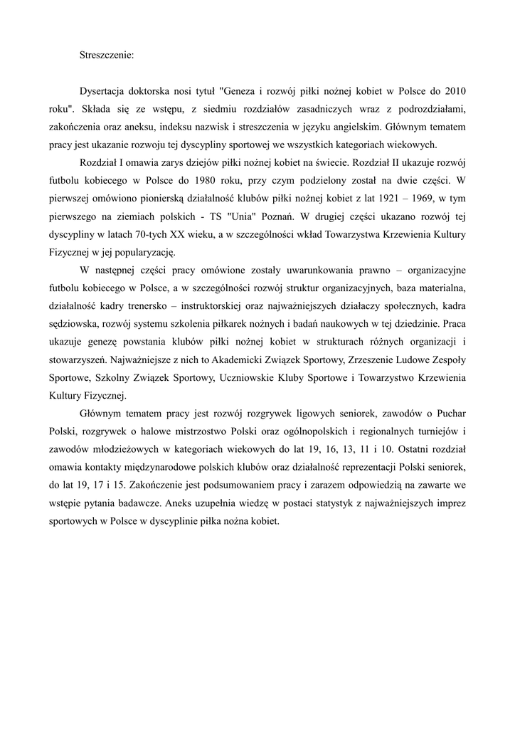 Streszczenie: Dysertacja doktorska nosi tytuł "Geneza i rozwój piłki noŜnej kobiet w Polsce do 2010 roku". Składa się ze wstępu, z siedmiu rozdziałów zasadniczych wraz z podrozdziałami, zakończenia oraz aneksu, indeksu nazwisk i streszczenia w języku angielskim. Głównym tematem pracy jest ukazanie rozwoju tej dyscypliny sportowej we wszystkich kategoriach wiekowych. Rozdział I omawia zarys dziejów piłki noŜnej kobiet na świecie. Rozdział II ukazuje rozwój futbolu kobiecego w Polsce do 1980 roku, przy czym podzielony został na dwie części. W pierwszej omówiono pionierską działalność klubów piłki noŜnej kobiet z lat 1921 – 1969, w tym pierwszego na ziemiach polskich - TS "Unia" Poznań. W drugiej części ukazano rozwój tej dyscypliny w latach 70-tych XX wieku, a w szczególności wkład Towarzystwa Krzewienia Kultury Fizycznej w jej popularyzację. W następnej części pracy omówione zostały uwarunkowania prawno – organizacyjne futbolu kobiecego w Polsce, a w szczególności rozwój struktur organizacyjnych, baza materialna, działalność kadry trenersko – instruktorskiej oraz najwaŜniejszych działaczy społecznych, kadra sędziowska, rozwój systemu szkolenia piłkarek noŜnych i badań naukowych w tej dziedzinie. Praca ukazuje genezę powstania klubów piłki noŜnej kobiet w strukturach róŜnych organizacji i stowarzyszeń. NajwaŜniejsze z nich to Akademicki Związek Sportowy, Zrzeszenie Ludowe Zespoły Sportowe, Szkolny Związek Sportowy, Uczniowskie Kluby Sportowe i Towarzystwo Krzewienia Kultury Fizycznej. Głównym tematem pracy jest rozwój rozgrywek ligowych seniorek, zawodów o Puchar Polski, rozgrywek o halowe mistrzostwo Polski oraz ogólnopolskich i regionalnych turniejów i zawodów młodzieŜowych w kategoriach wiekowych do lat 19, 16, 13, 11 i 10. Ostatni rozdział omawia kontakty międzynarodowe polskich klubów oraz działalność reprezentacji Polski seniorek, do lat 19, 17 i 15. Zakończenie jest podsumowaniem pracy i zarazem odpowiedzią na zawarte we wstępie pytania badawcze. Aneks uzupełnia wiedzę w postaci statystyk z najwaŜniejszych imprez sportowych w Polsce w dyscyplinie piłka noŜna kobiet. Summary: The PhD thesis is titled "Genesis and development of women’s football in Poland until 2010". It consists of an introduction, seven main chapters and subchapters, the conclusion and an annex, an index of names and summaries in English. The main topic of the paper is to show the development of the sport across all age categories. Chapter I discusses the outline of women's football in the world. Chapter II shows the development of women's football in Poland until 1980, but it has been divided into two parts. The first discusses the pioneering work of women’s football clubs in the years 1921 - 1969, including the first on Polish soil - TS "Union" Poznan. The second part shows the development of the discipline in the 70's of the twentieth century, and in particular the contribution of the Society for Promotion of Physical Culture to its promotion. In the next part of the paper, the author discusses legal and organisational considerations of women's football in Poland, and in particular the development of its organizational structures, infrastructure, the operations of the couching and instructional staff as well as the most important social activists, referees, the development of the players’ training system and the scientific research in this field. The thesis reveals the origins of women's football clubs in the structures of the various organizations and associations. The most important of these are the Academic Sports Association, the Association of Folk Teams Sports, School Sports Association, Students' Clubs Association of Sports and Physical Culture. The main topic of the thesis, however, is the development of the senior league, Polish Cup competitions, indoor games for the Polish championship as well as national and regional youth tournaments and competitions in age groups under 19, 16, 13, 11 and 10. The final chapter discusses the international contacts of Polish clubs and the activities of Polish national senior team, Under-19, 17 and 15. The conclusion serves as a summary of the work and, at the same time, a response to the questions contained in the introductory research. The appendix complements the knowledge in the form of statistics of the most important sporting events in Poland in women's football.