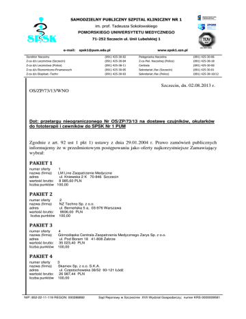SAMODZIELNY PUBLICZNY SZPITAL KLINICZNY NR 1 im. prof. Tadeusza Sokołowskiego POMORSKIEGO UNIWERSYTETU MEDYCZNEGO 71-252 Szczecin ul. Unii Lubelskiej 1 e-mail: [email protected] www.spsk1.szn.pl Dyrektor Naczelny (091) 425-30-02 Pielęgniarka Naczelna (091) 425-30-06 Z-ca d/s Lecznictwa (Szczecin) (091) 425-30-04 Z-ca Piel. Naczelnej (Police) (091) 425-38-18 Z-ca d/s Lecznictwa (Police) (091) 425-38-11 Centrala (091) 425-30-00 Z-ca d/s Ekonomiczno-Finansowych (091) 425-30-05 Sekretariat /fax (Szczecin) (091) 425-30-01 Z-ca d/s Eksploat.-Techn (091) 425-30-03 Sekretariat /fax (Police) (091) 425-38-10/12 Szczecin, dn. 02.08.2013 r. OS/ZP/73/13/WNO Dot: przetargu nieograniczonego Nr OS/ZP/73/13 na dostawę czujników, okularków do fototerapii i cewników do SPSK Nr 1 PUM Zgodnie z art. 92 ust 1 pkt 1) ustawy z dnia 29.01.2004 r. Prawo zamówień publicznych informujemy że w przedmiotowym postępowaniu jako oferty najkorzystniejsze Zamawiający wybrał: PAKIET 1 numer oferty 1 nazwa (firma) LM Line Zaopatrzenie Medyczne adres ul. Kniewska 2 K 70-846 Szczecin wartość brutto: 8 985,60 PLN liczba punktów 100,00 PAKIET 2 numer oferty nazwa (firma) adres wartość brutto: liczba punktów 2 NZ Techno Sp. z o.o. ul. Berneńska 5 a, 03-976 Warszawa 9936,00 PLN 100,00 PAKIET 3 numer oferty nazwa (firma) adres wartość brutto: liczba punktów 4 Górnośląska Centrala Zaopatrzenia Medycznego Zarys Sp. z o.o. ul. Pod Borem 18 41-808 Zabrze 35 023,40 PLN 100,00 PAKIET 4 numer oferty 3 nazwa (firma) Skamex Sp. z o.o. S.K.A. adres ul. Częstochowska 38/52 93-121 Łódź wartość brutto: 26 987,44 PLN liczba punktów 100,00 NIP: 852-22-11-119 REGON: 000288892 Sąd Rejonowy w Szczecinie XVII Wydział Gospodarczy; numer KRS 0000009581 PAKIET 5 numer oferty 4 nazwa (firma) Górnośląska Centrala Zaopatrzenia Medycznego Zarys Sp. z o.o. adres ul. Pod Borem 18 41-808 Zabrze wartość brutto: 79 293,14 PLN liczba punktów 100,00 Zbiorcze zestawienie ofert: Złożono 7 ofert w tym: Pakiet 1 – 2 oferty 1.Aksis Hurtownia Sprzętu Medycznego Ignaciuk Spigarski S.J ul. Uczniowska 33 80-530 Gdańsk z ceną netto: 14 075,00 PLN ,wartość brutto: 15 201,00 PLN – 59,11 PKT 6. LM Line Zaopatrzenie Medyczne ul. Kniewska 2 K 70-846 Szczecin z ceną netto: 8 320,00 PLN ,wartość brutto: 8 985,60 PLN – 100,00 PKT Pakiet 2 – 4 oferty 1.Aksis Hurtownia Sprzętu Medycznego Ignaciuk Spigarski S.J z ceną netto: 11 500,00 PLN, wartość brutto: 12 420,00 PLN 80,00 PKT 2. NZ TECHNO Sp. z o.o. ul. Berneńska 5 a, 03-976 Warszawa z ceną netto: 9 200,00 PLN, wartość brutto: 9 936,00 PLN 100,00 PKT 4. Górnośląska Centrala Zaopatrzenia Medycznego Zarys Sp. z o.o. ul. Pod Borem 18 41-808 Zabrze z ceną netto: 9 360,00 PLN ,wartość brutto: 10 108,80 PLN – 78,32 PKT 5. Hurtownia Sprzętu Medycznego Rexomed Sp. z o.o. ul. Mączna 31 70-780 Szczecin z ceną netto: 6 410,00 PLN ,wartość brutto: 6 922,80 PLN – 0,00 PKT Pakiet 3 – 4 oferty 3. Skamex Sp. z o.o. S.K.A. ul. Częstochowska 38/52 93-121 Łódź z ceną netto: 52 548,48 PLN ,wartość brutto: 56 752,36 PLN – 61,71 PKT 4. Górnośląska Centrala Zaopatrzenia Medycznego Zarys Sp. z o.o. ul. Pod Borem 18 41-808 Zabrze z ceną netto: 32 429,05 PLN, wartość brutto: 35 023,40 PLN – 100,00 PKT 5. Hurtownia Sprzętu Medycznego Rexomed Sp. z o.o. ul. Mączna 31 70-780 Szczecin z ceną netto: 41 403,47 PLN ,wartość brutto: 44 715,75 PLN – 78,32 PKT 7. Bialmed Sp. z o.o. ul. Konopnickiej 11 a 12-230 Biała Piska z ceną netto: 39 926,48 PLN ,wartość brutto: 43 120,56 PLN – 81,22 PKT Pakiet 4 – 1 oferta 3. Skamex Sp. z o.o. S.K.A. ul. Częstochowska 38/52 93-121 Łódź z ceną netto: 24 988,37 PLN, wartość brutto: 26 987,44 PLN – 100,00 PKT Pakiet 5 – 4 oferty 3. Skamex Sp. z o.o. S.K.A. ul. Częstochowska 38/52 93-121 Łódź z ceną netto: 109 382,48 PLN ,wartość brutto: 118 133,08 PLN – 67,12 PKT 4. Górnośląska Centrala Zaopatrzenia Medycznego Zarys Sp. z o.o. ul. Pod Borem 18 41-808 Zabrze z ceną netto: 73 419,56 PLN ,wartość brutto: 79 293,14 PLN – 100,00 PKT 5. Hurtownia Sprzętu Medycznego Rexomed Sp. z o.o. ul. Mączna 31 70-780 Szczecin z ceną netto: 84 364,29 PLN, wartość brutto: 91 113,43 PLN – 87,03 PKT 7. Bialmed Sp. z o.o. ul. Konopnickiej 11 a 12-230 Biała Piska z ceną netto: 84 804,37 PLN, wartość brutto:91 588,73 PLN – 86,57 PKT Uzasadnienie wyboru: art. 91 ust. 1 ustawy Prawo zamówień publicznych z późniejszymi zmianami. Zamawiający wybrał oferty najkorzystniejsze na podstawie kryterium oceny ofert określonych w SIWZ. Zamawiający informuje, że w przedmiotowym postępowaniu, na podstawie Art. 89 ust 1 pkt 2) ustawy PZP została odrzucona oferta firmy Rexomed w zakresie Pakietu Nr 2 – Zamawiający odrzuca ofertę jeśli jej treść nie odpowiada treści specyfikacji istotnych warunków zamówienia, Pismem z dnia 30.07.2013 r. Zamawiający wezwał Wykonawcę do dostarczenia próbki do pakietu nr 2 zgodnej z opisem przedmiotu zamówienia SIWZ. Wykonawca nie dostarczył próbki. Z postępowania nie został wykluczony żaden Wykonawca. Umowa w sprawie zamówienia publicznego w zakresie Pakietu nr 4 może być zawarta od dnia 05.08.2013r., w zakresie pakietu 1, 2, 3 i 5 od 08.08.2013 r. ar/MM